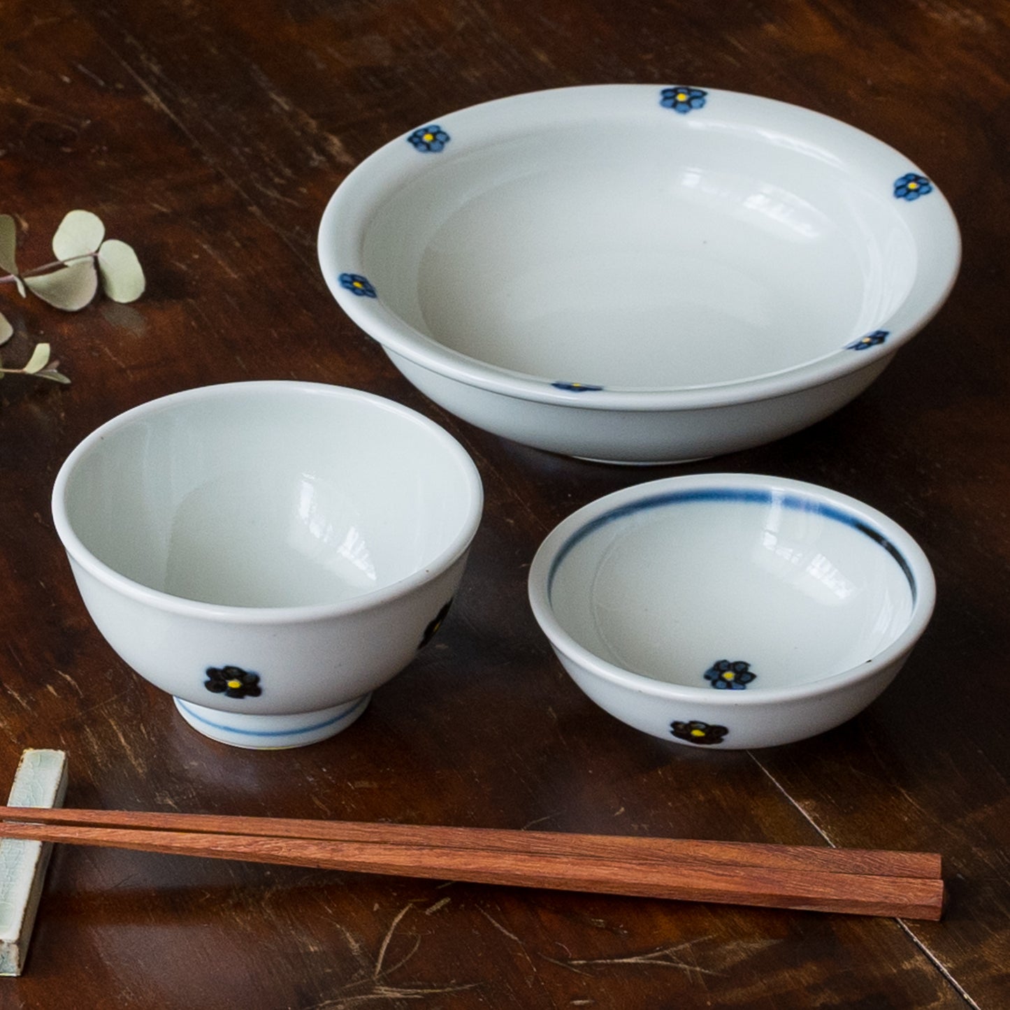 Simple shapes and simple patterns based on early Imari. The glaze, gosu, and red painting are made in-house using traditional methods. Since natural raw materials are used, the pale gosu color and the soft white that is not pure white give a warm feeling.