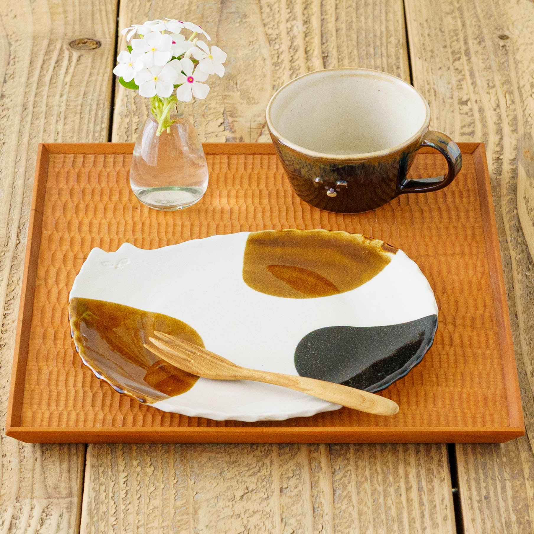 These shapes were born from the "Tatara" method of shaping clay into slabs. Different from potter's wheel, they retain a soft fluctuation, and the warmth of the hands is still present. The colors and scents of the earth are gently blended into their appearance.