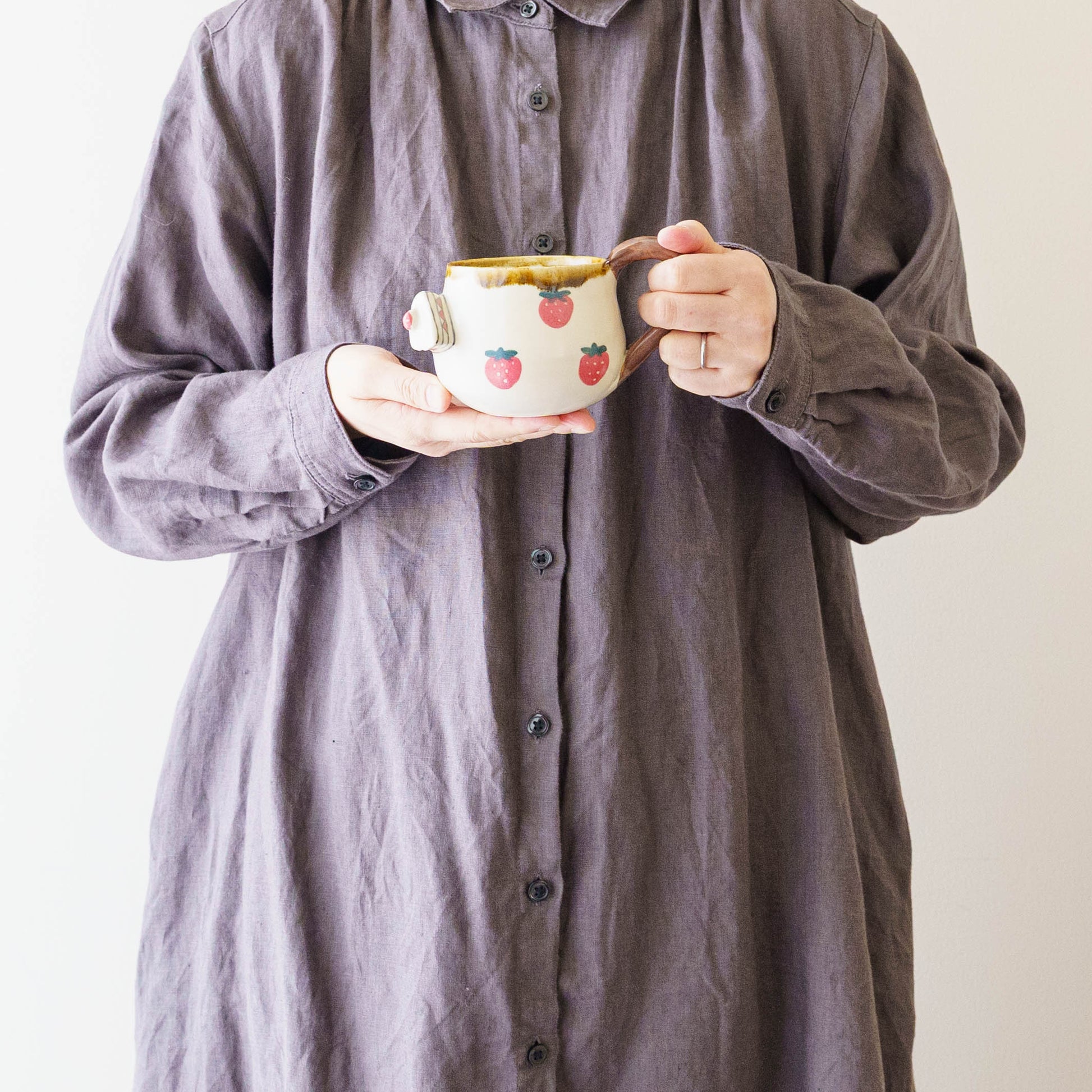 Cute strawberries that appear in a picture book drawn on the whole mug. Each one is carefully drawn by hand, so you can feel the kindness and warmth in the slightly different facial expressions of the strawberries.