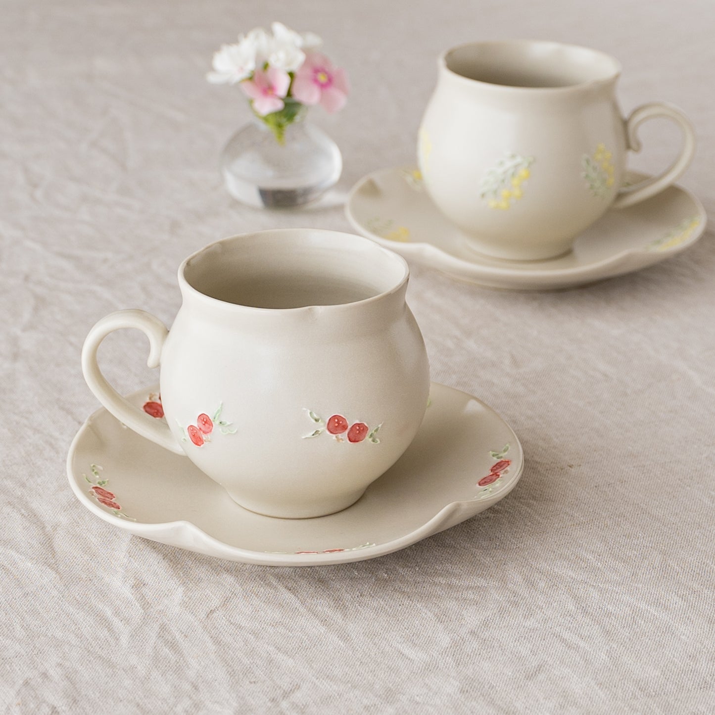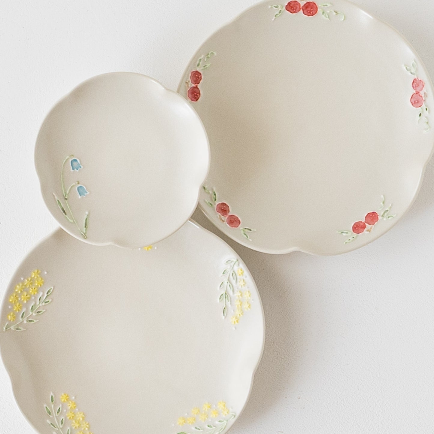 Slip-trailed decoration technique involves putting slurry (liquid clay) into a special dropper and squeezing it out to draw a pattern. After painting the flowers with slip-trailed decoration, a colored glaze is applied to create a warm appearance.