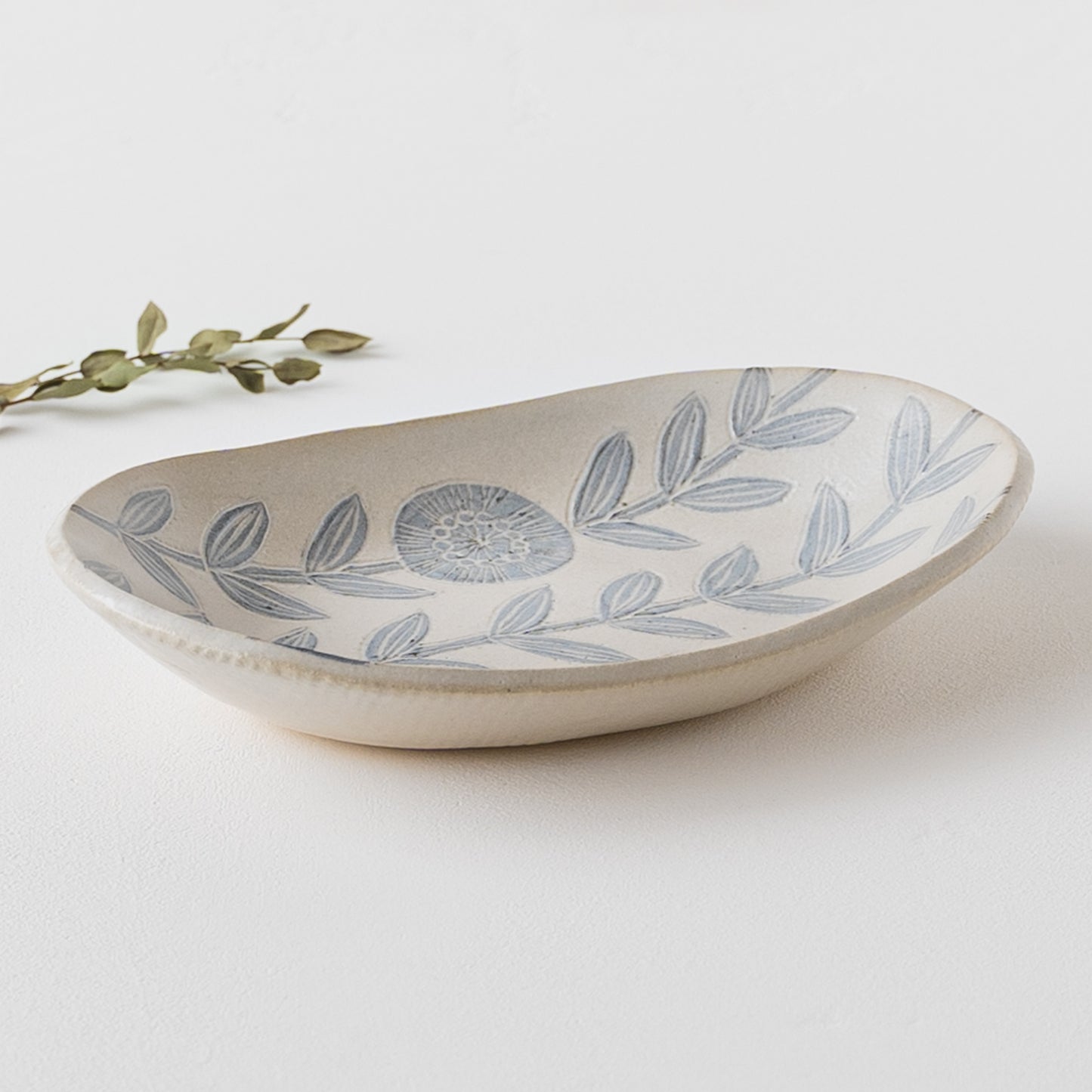 The glaze blending method that I learned while studying in England is used, so the colors are indescribably wonderful. The light gray flower pattern goes well with the slightly dull and elegant white.