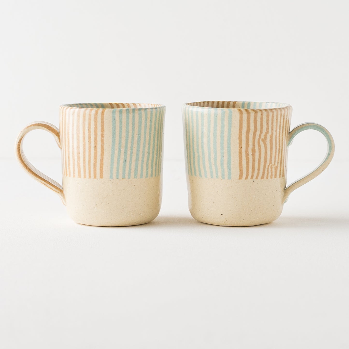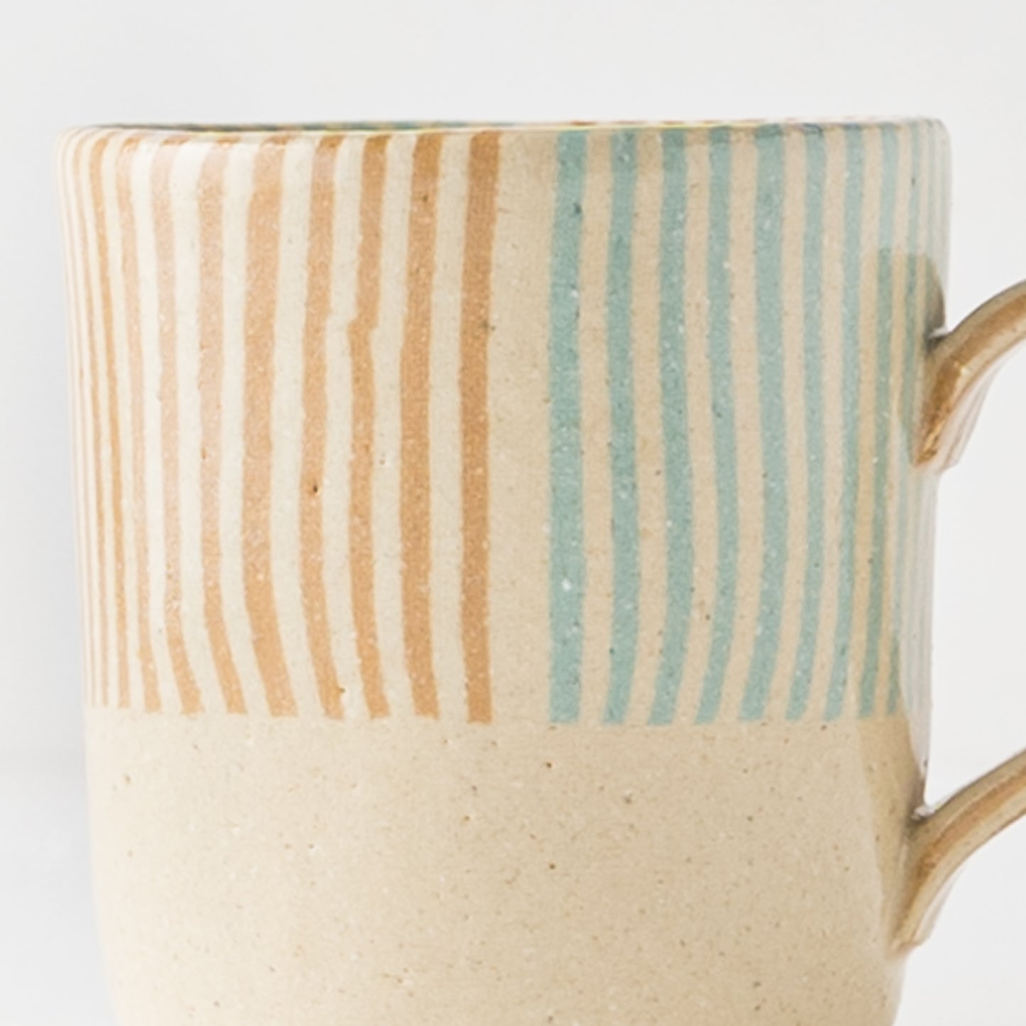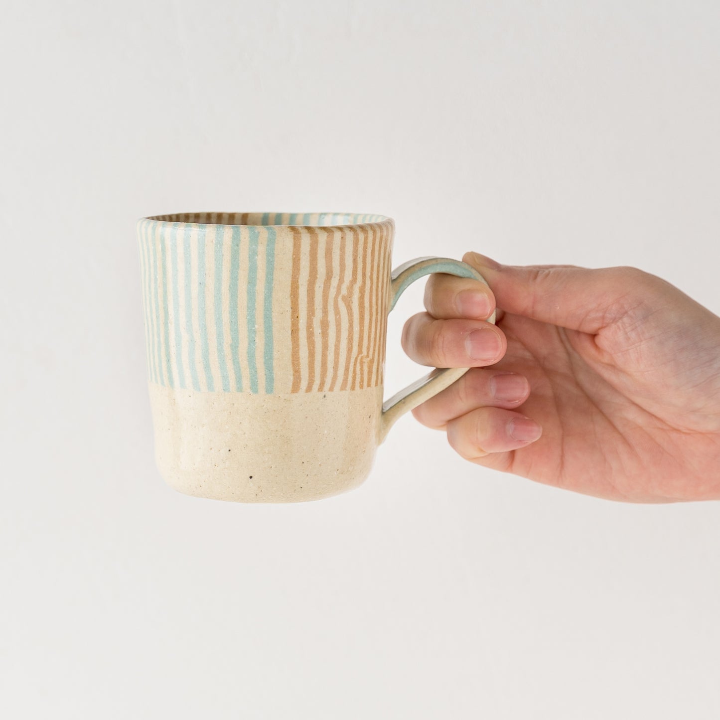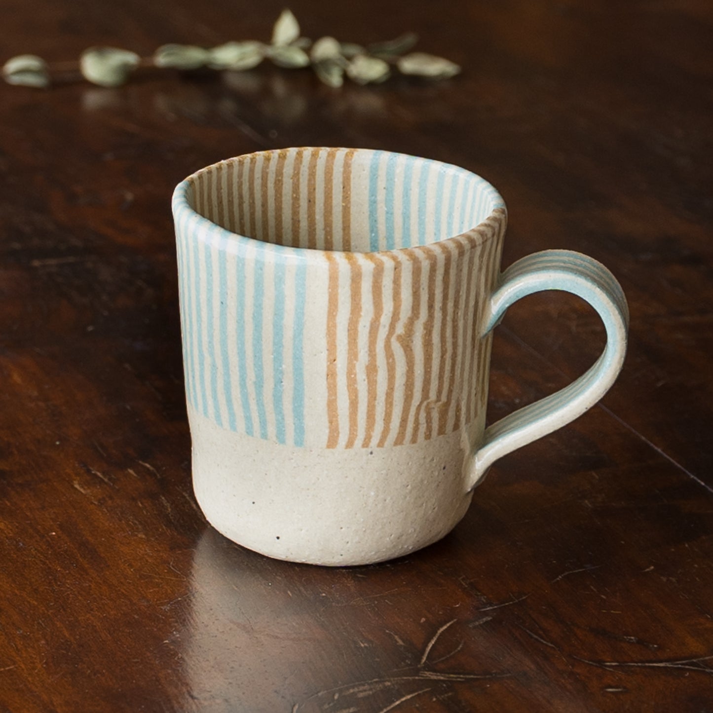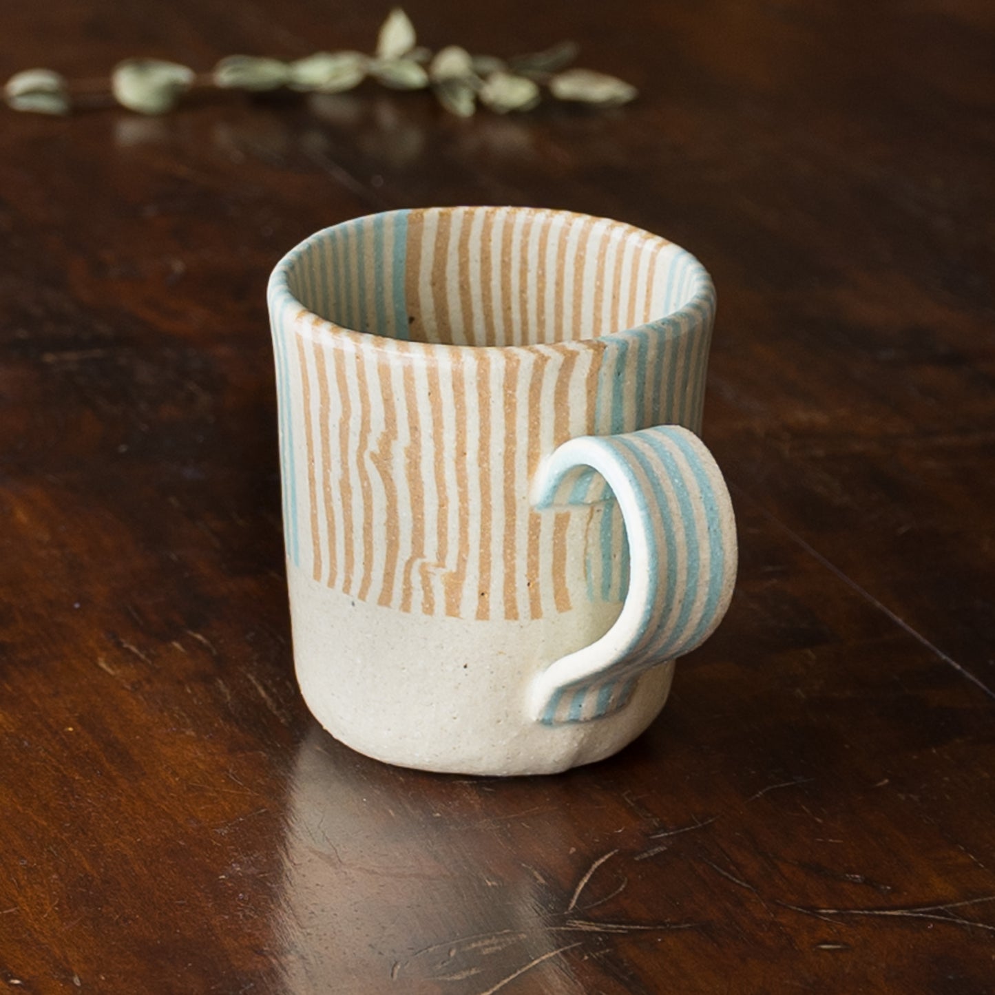 A cute mug with a wonderful harmony of turquoise and bright yellow staggered lines. Just looking at it makes me feel warm. The gentle and warm colors give the table a lively and fun atmosphere.