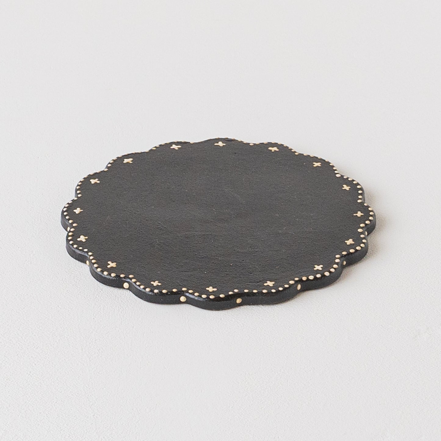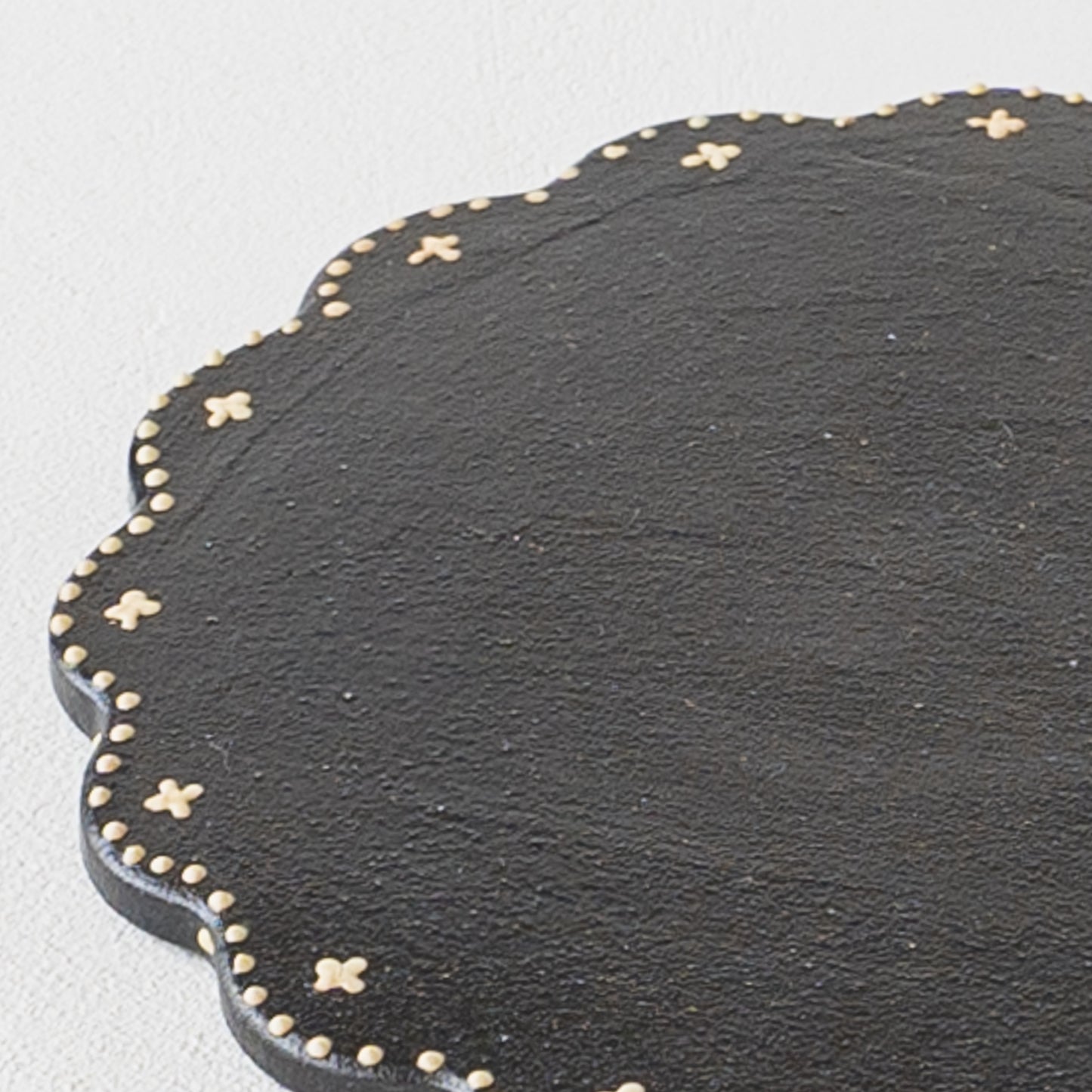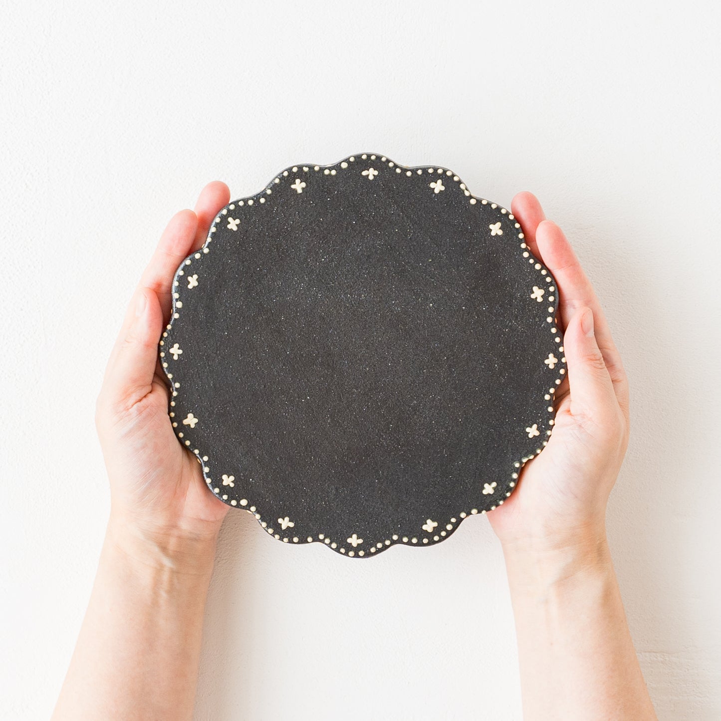 A black plate that tightens the dining table and complements the food nicely. A stylish and fashionable pattern on a black background that leaves traces of handwork will add a nice color to your dining table.