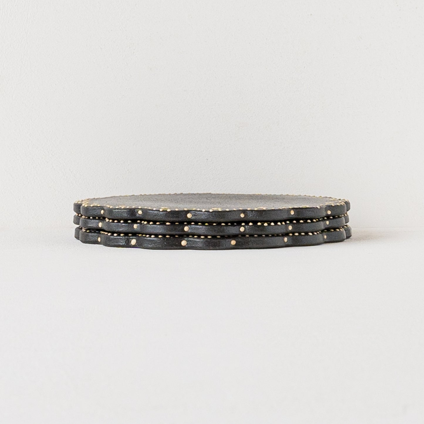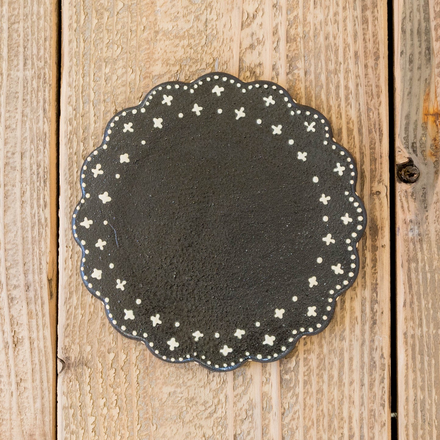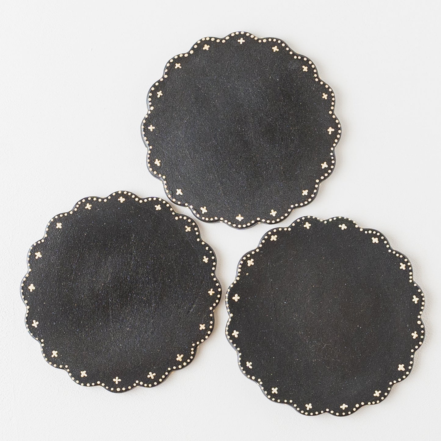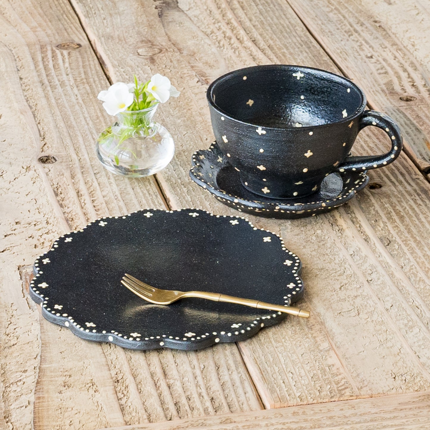 A black plate that tightens the dining table and complements the food nicely. A stylish and fashionable pattern on a black background that leaves traces of handwork will add a nice color to your dining table.
