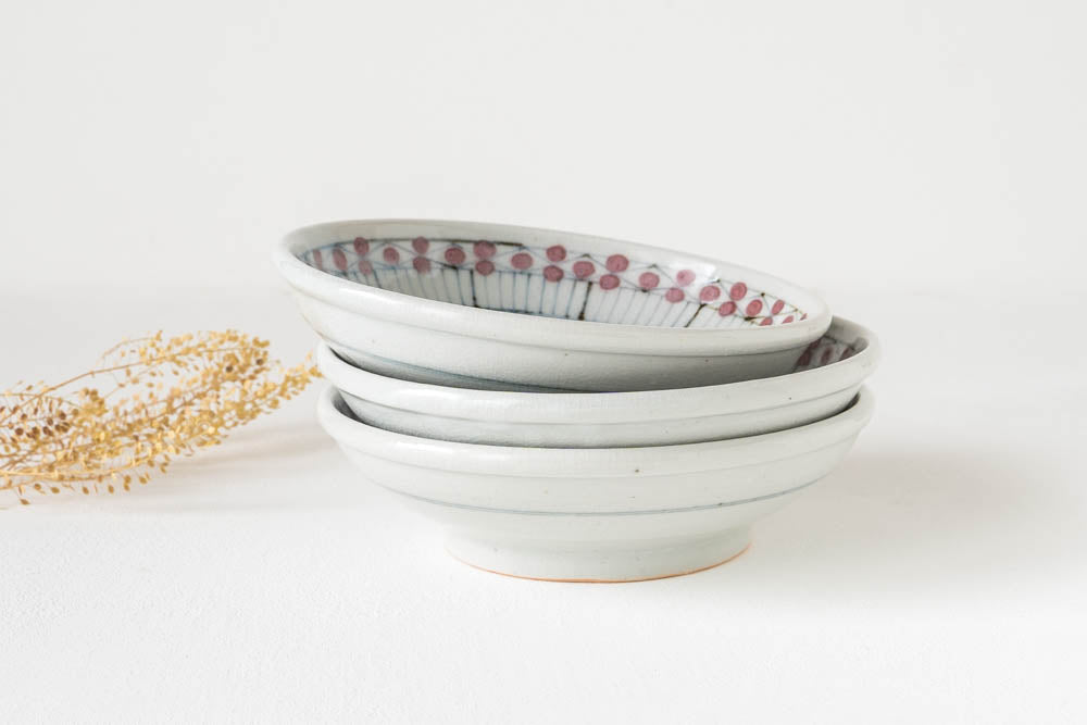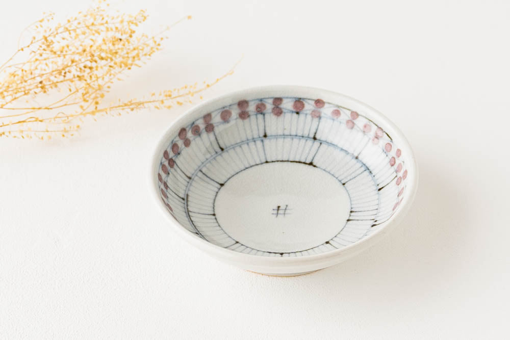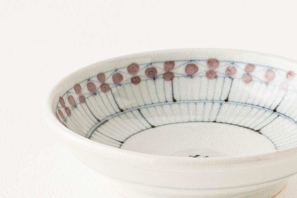 A flower fence design with a motif of a fence made of flowering trees. The red of the flower with a fluffy and vague texture is warm. The green color that appears when the glaze reacts gives a warm feeling that is unique to handmade products. In addition, the penetration of the crack pattern enhances the depth of taste.
