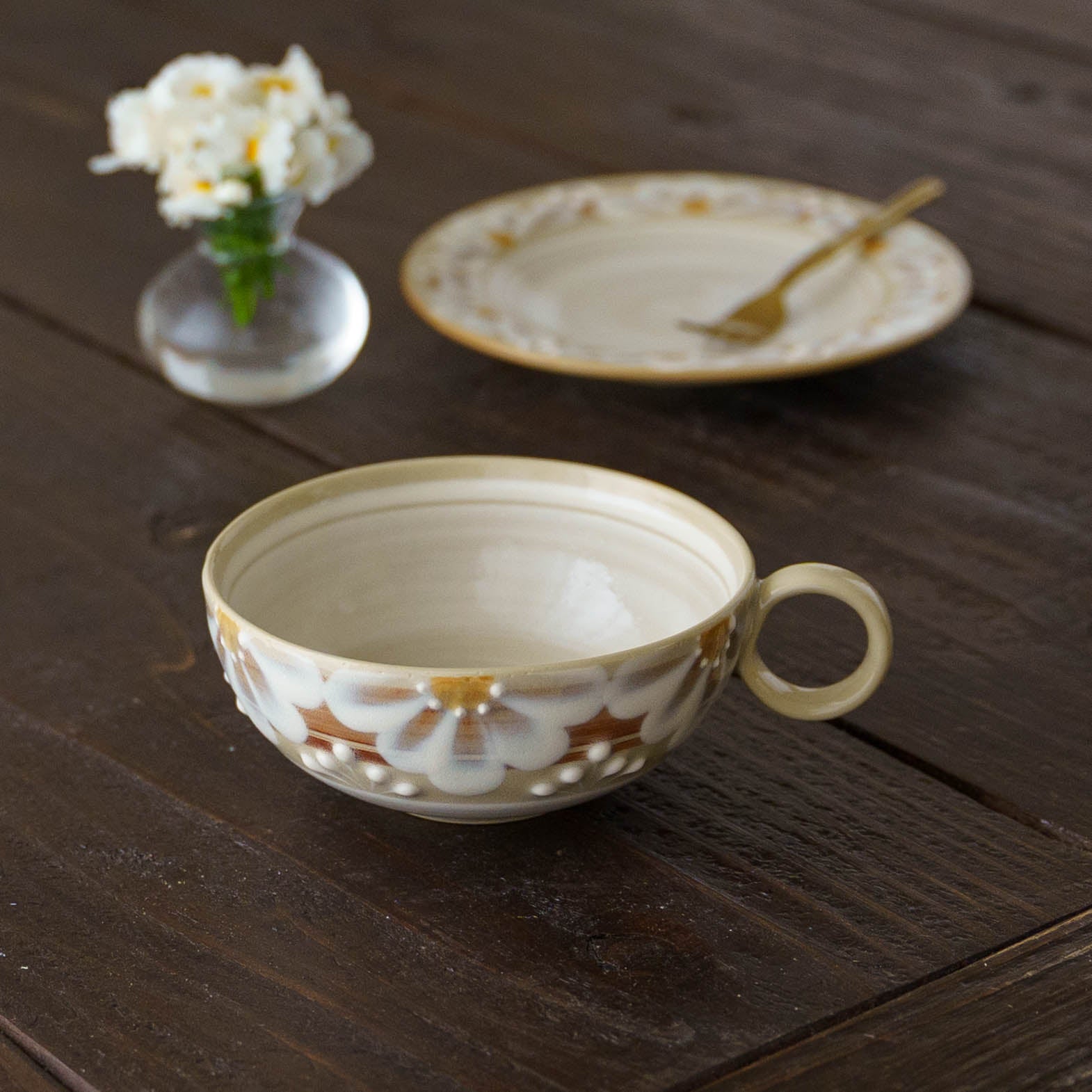 どこか懐かしさを感じるレトロモダンな絵付けが魅力的。全体に描かれた立体的で上品な絵付けが食卓を華やかに彩ってくれます。