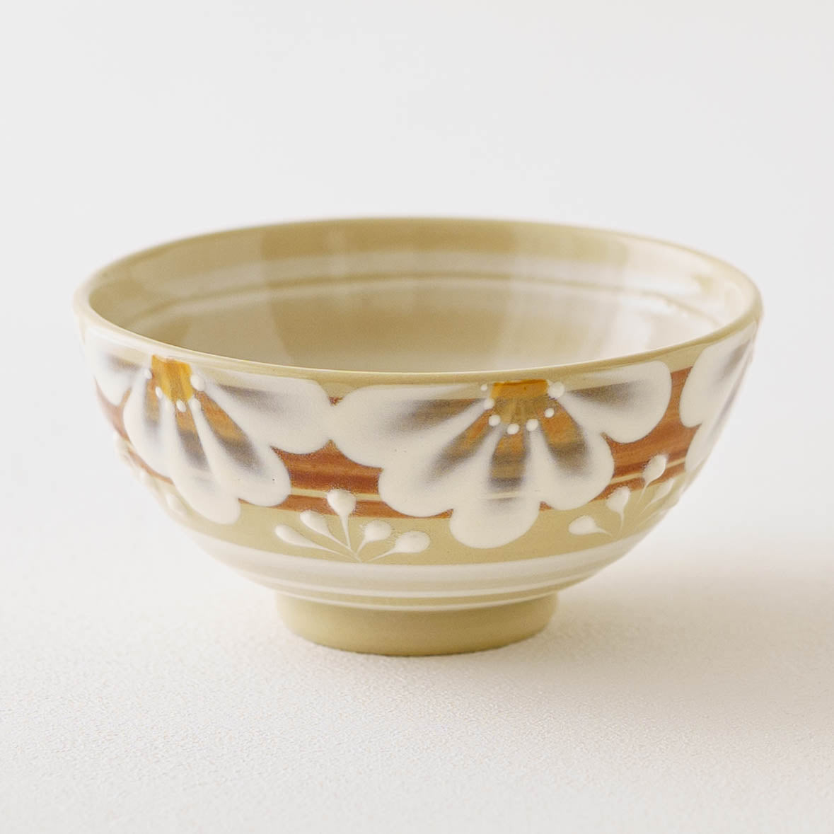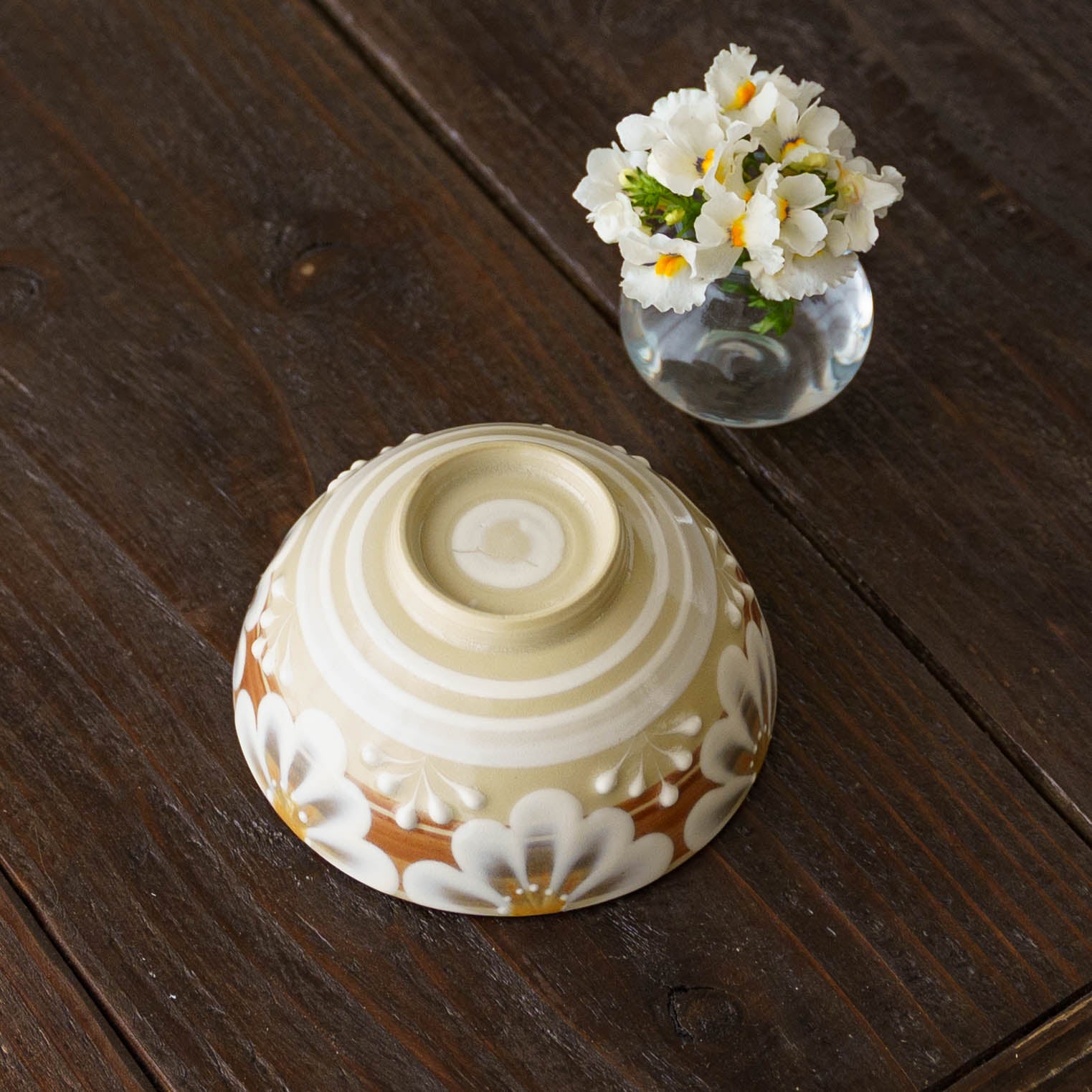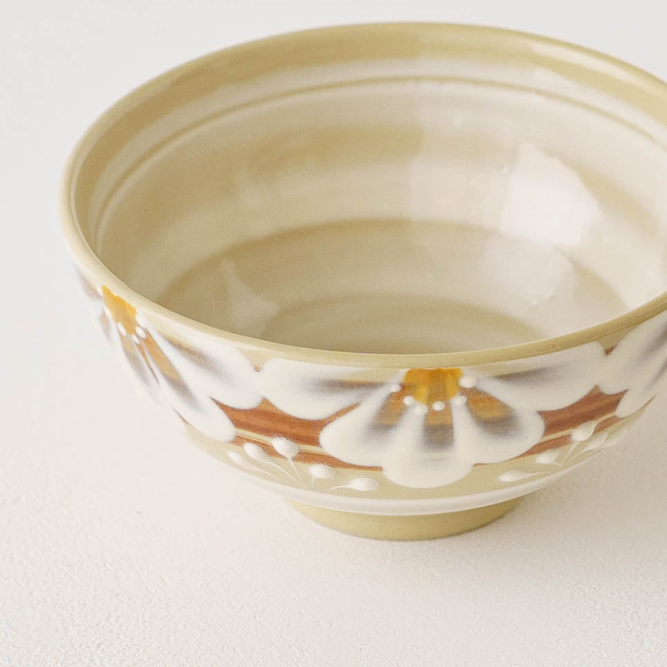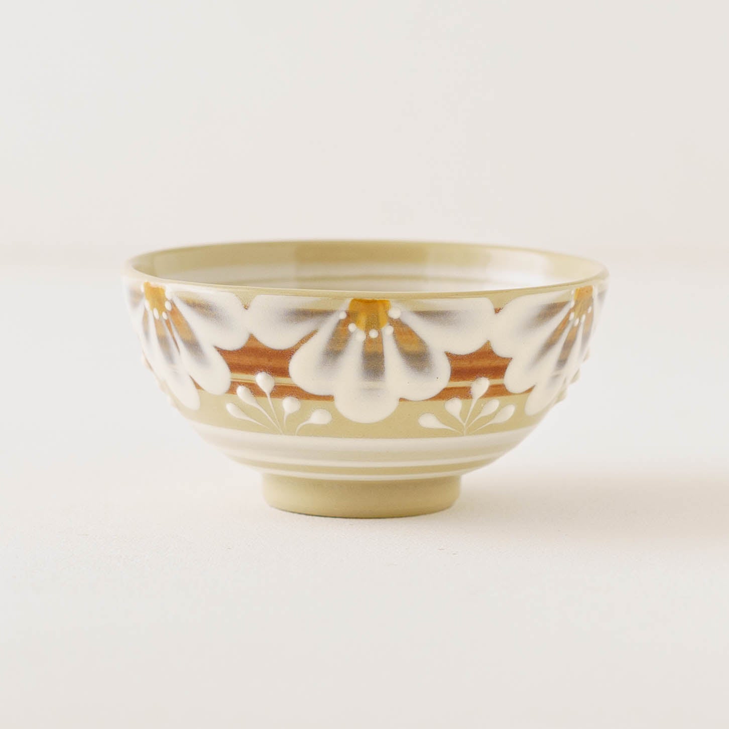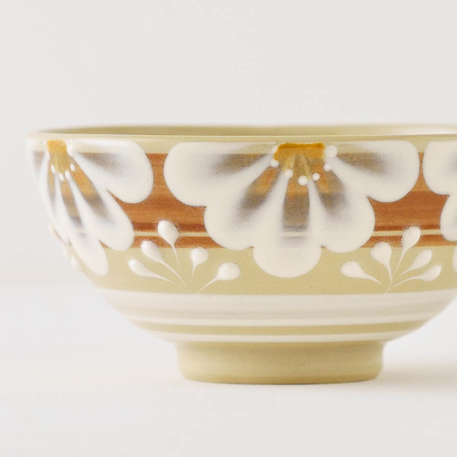 アールデコ調のレトロな絵付けは、凛としていて、どこかあたたかみのある愛らしさを感じます。淡くやさしい色合いは柚子肌釉によるもの。柚子の皮のような細やかな凹凸が光をやわらかく受け止め、うつわ全体に奥行きとぬくもりをもたらしています。