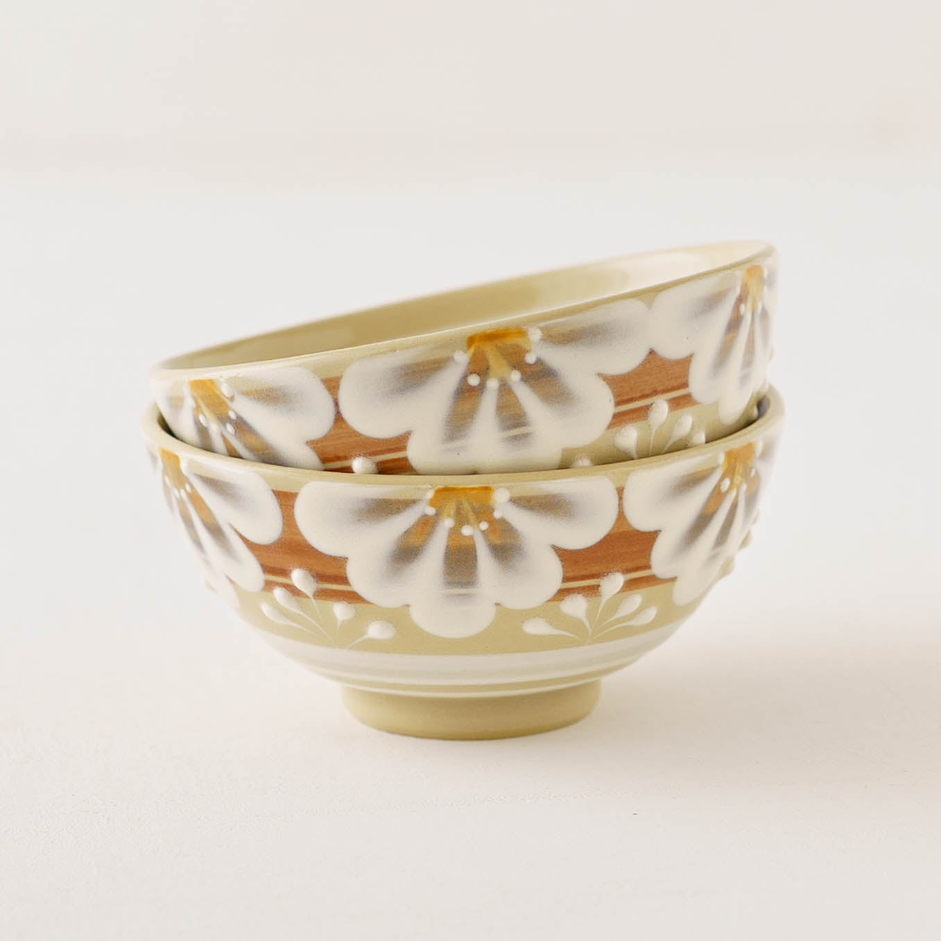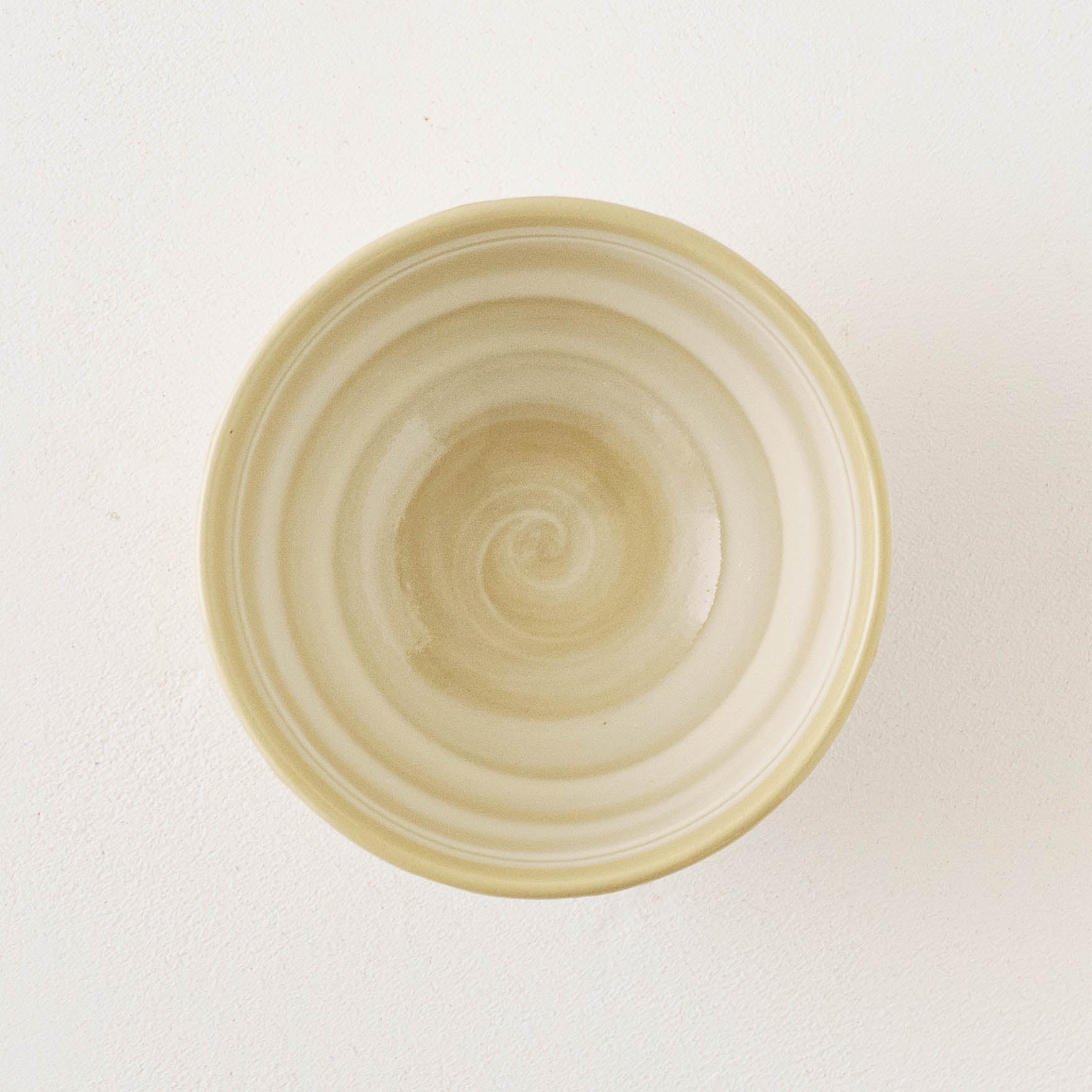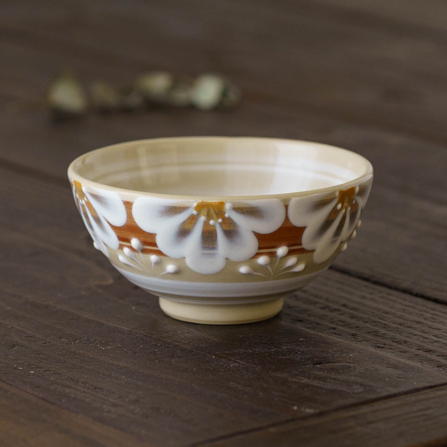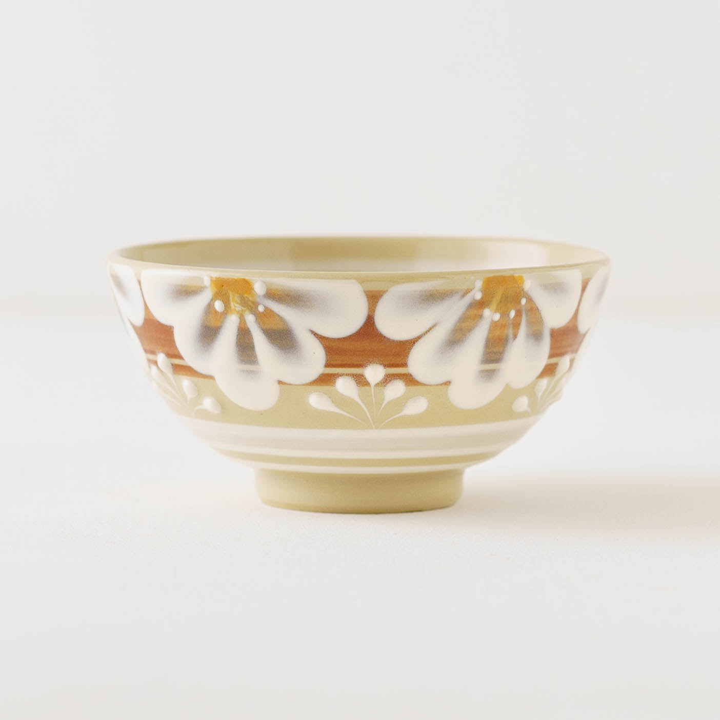 アールデコ調のレトロな絵付けは、凛としていて、どこかあたたかみのある愛らしさを感じます。淡くやさしい色合いは柚子肌釉によるもの。柚子の皮のような細やかな凹凸が光をやわらかく受け止め、うつわ全体に奥行きとぬくもりをもたらしています。