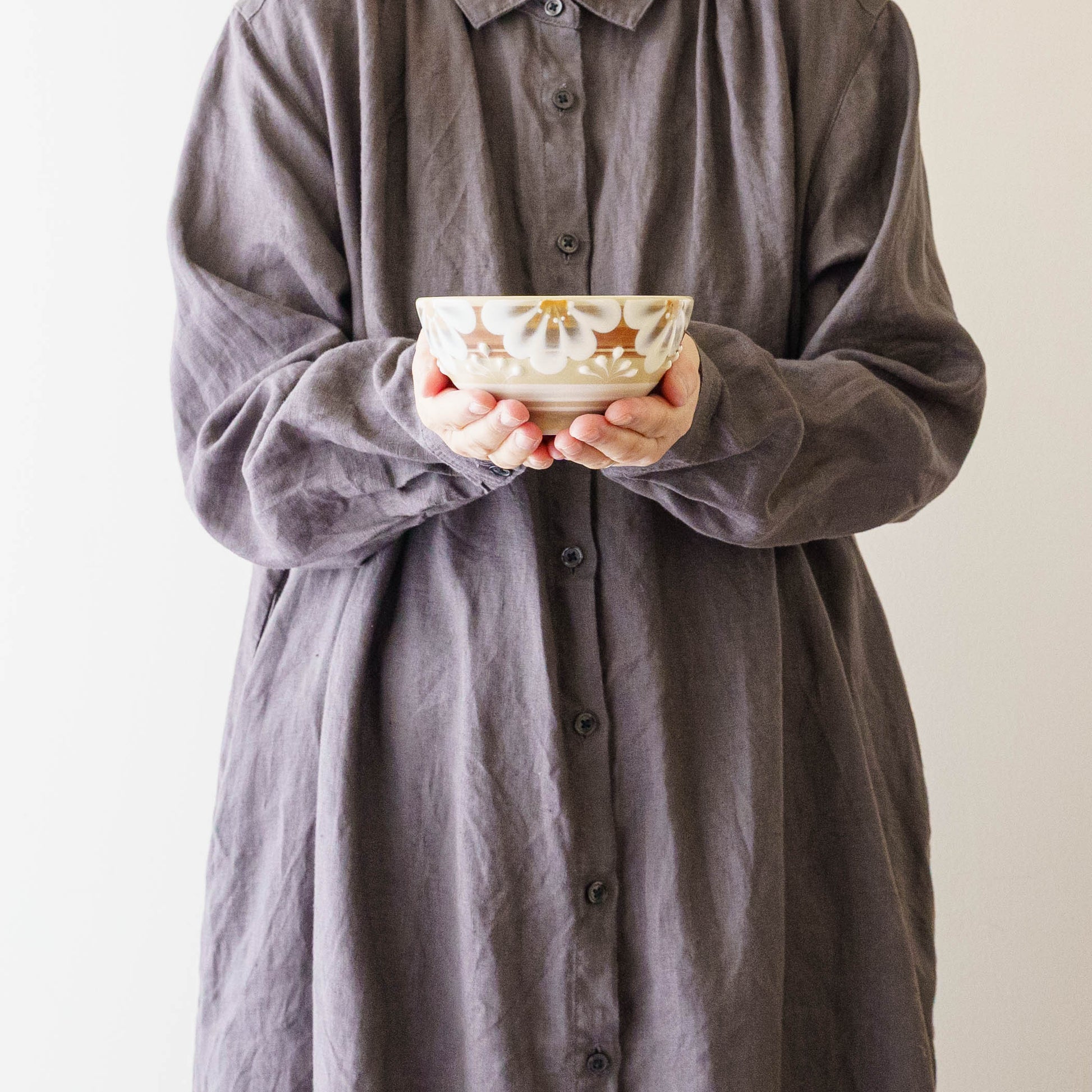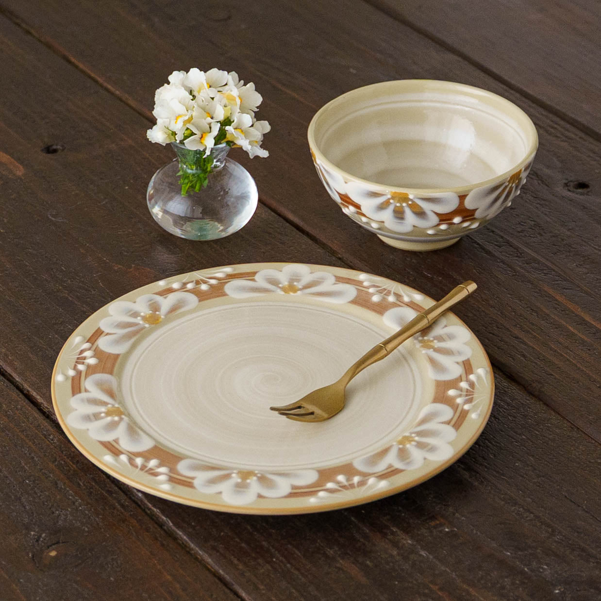 手しごとならではの装飾は、料理を額縁のように引き立て、いつもの一皿を少し特別な景色へと変えてくれます。指先で化粧土を描く「指描」の花びら文様は、筆では表現できないやわらかな揺らぎを宿し、またイッチン技法によるぷっくりと盛り上がった線が、美しい陰影とリズムを添えます。