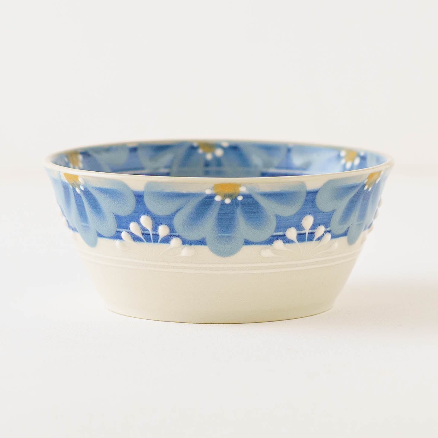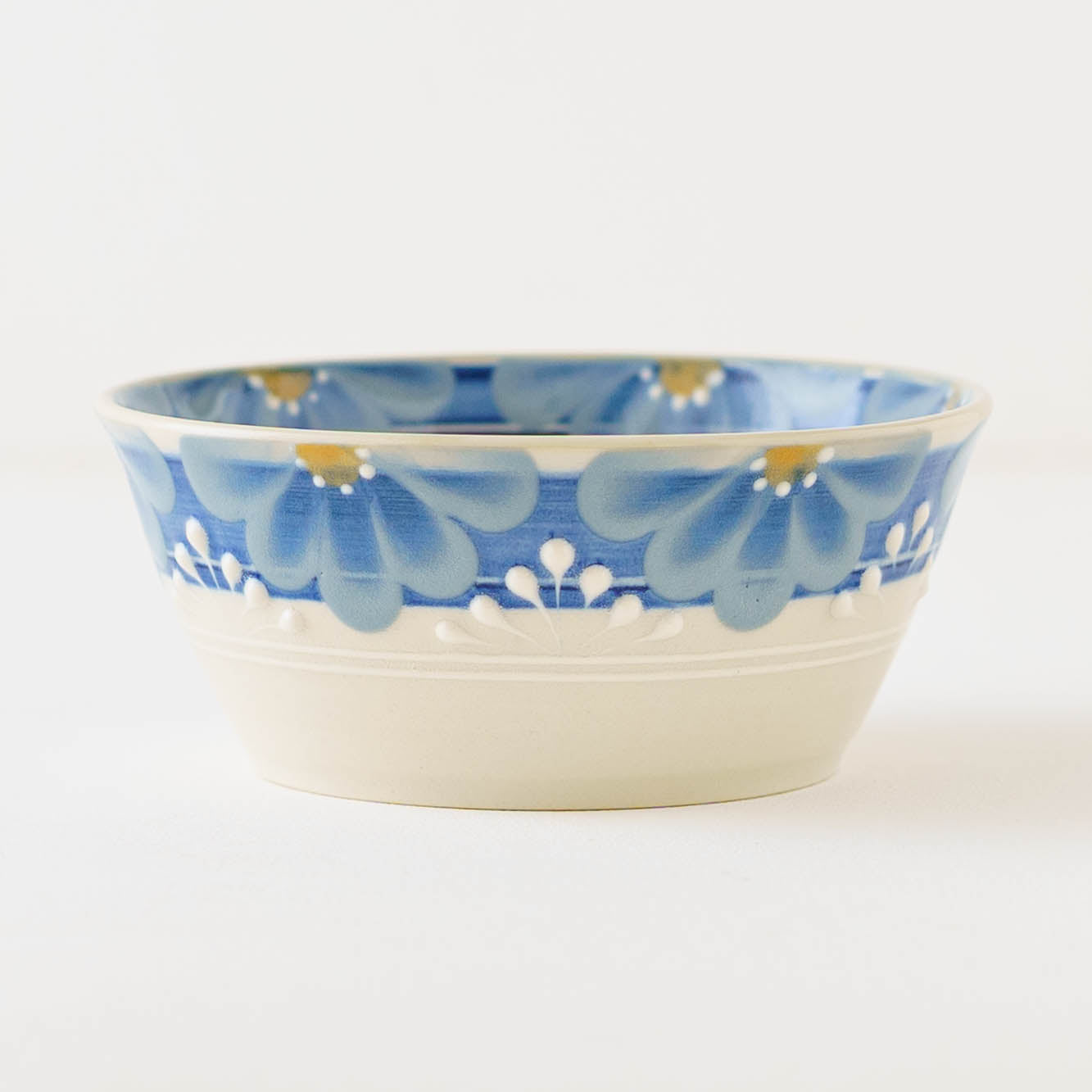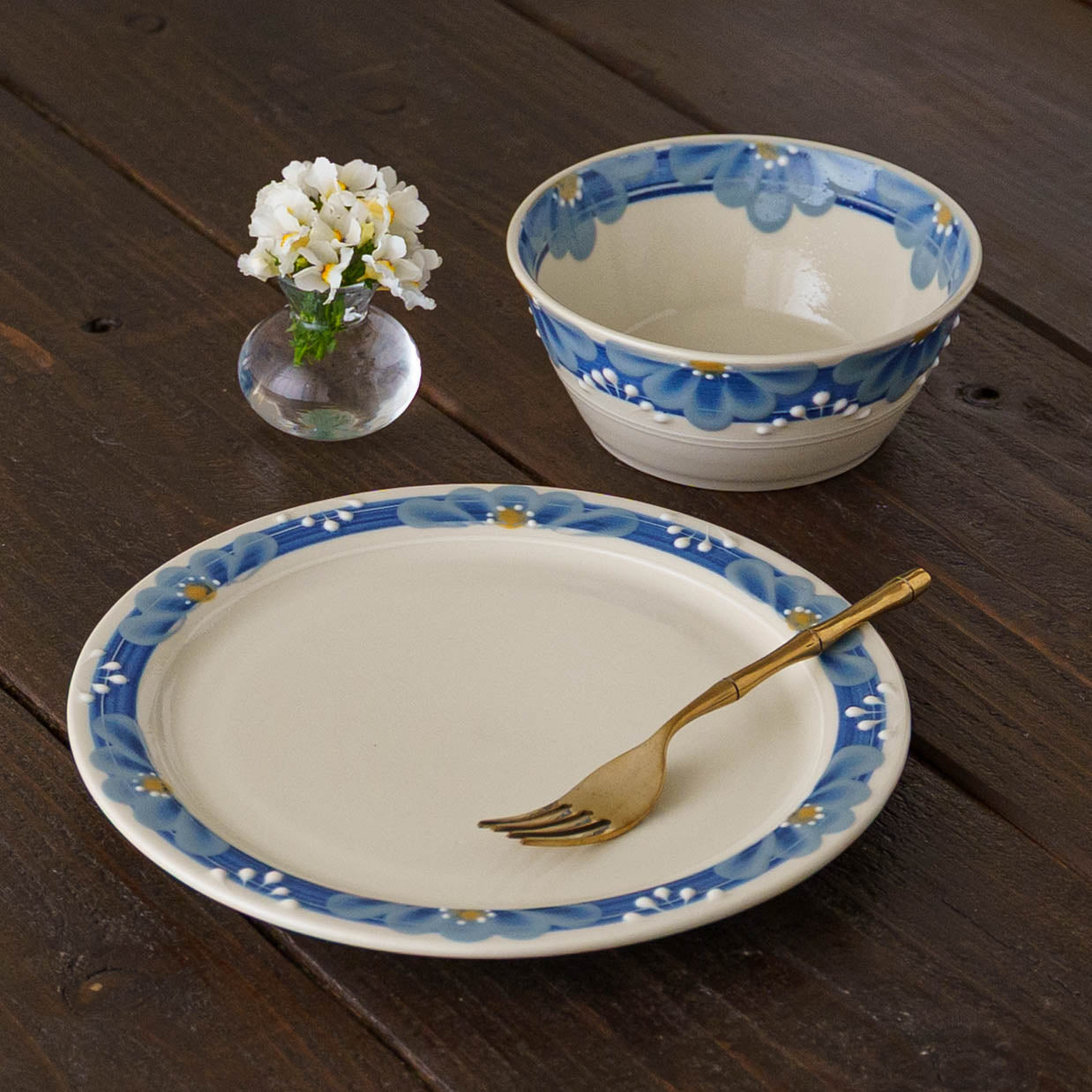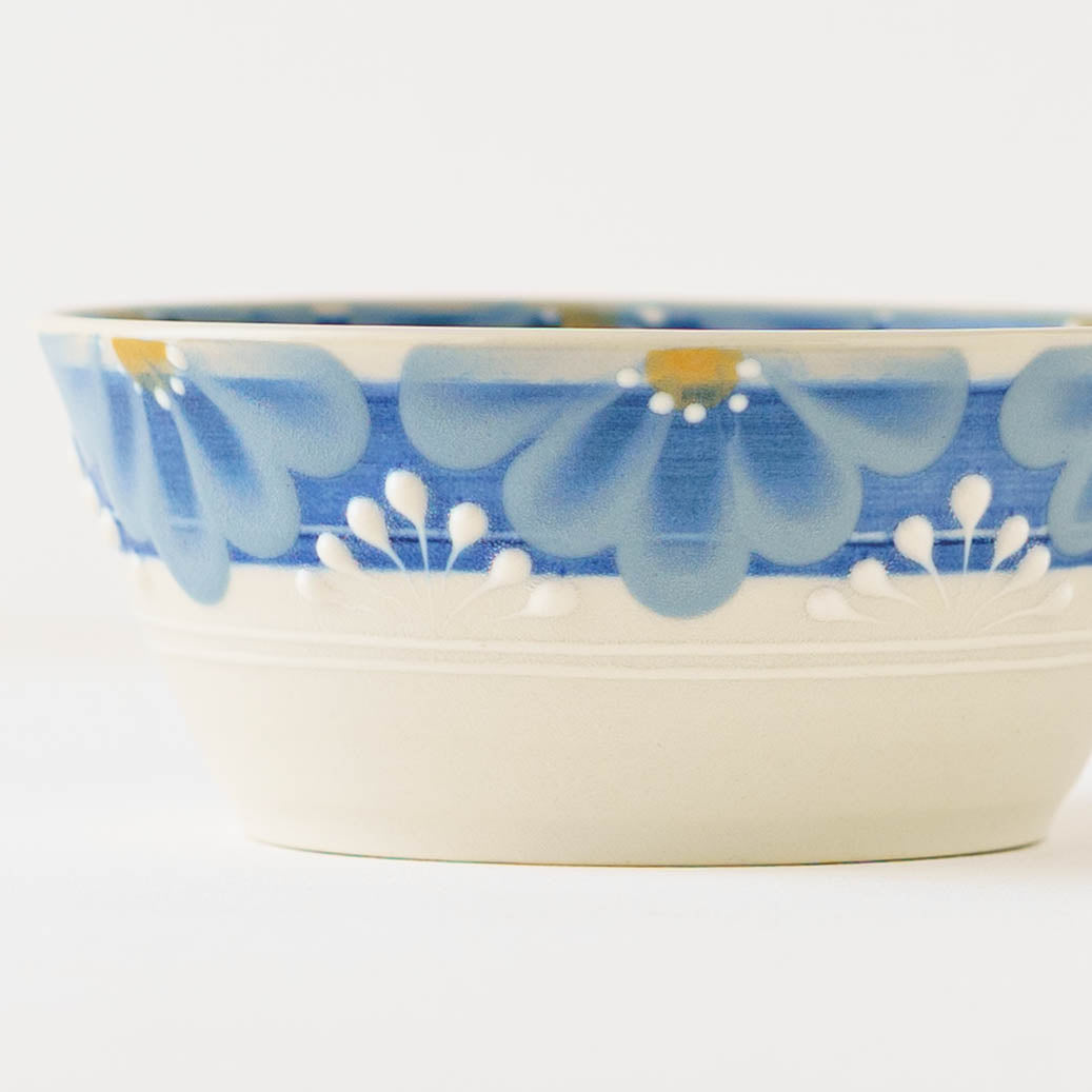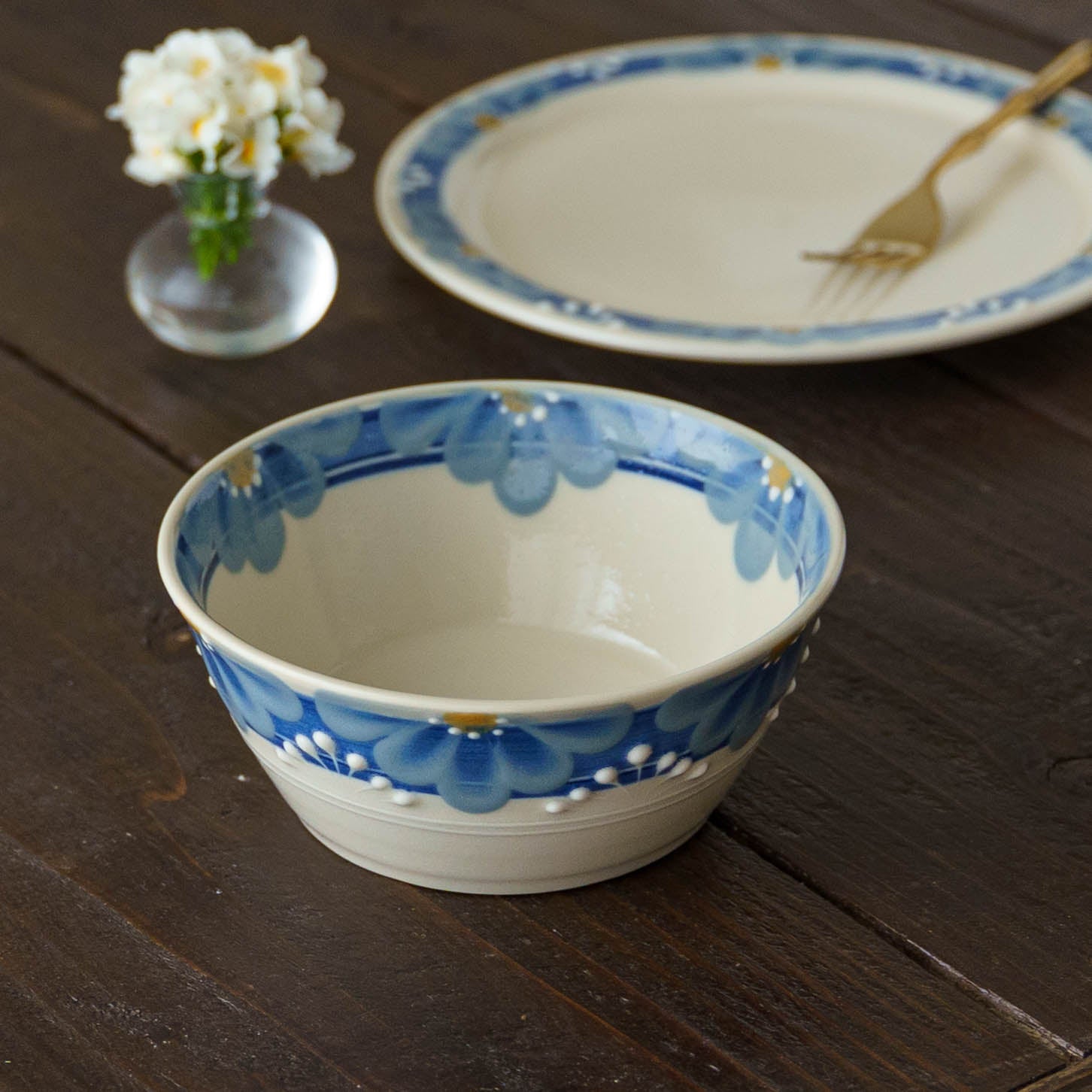手しごとならではの装飾は、料理を額縁のように引き立て、いつもの一皿を少し特別な景色へと変えてくれます。指先で化粧土を描く「指描」の花びら文様は、筆では表現できないやわらかな揺らぎを宿し、またイッチン技法によるぷっくりと盛り上がった線が、美しい陰影とリズムを添えます。