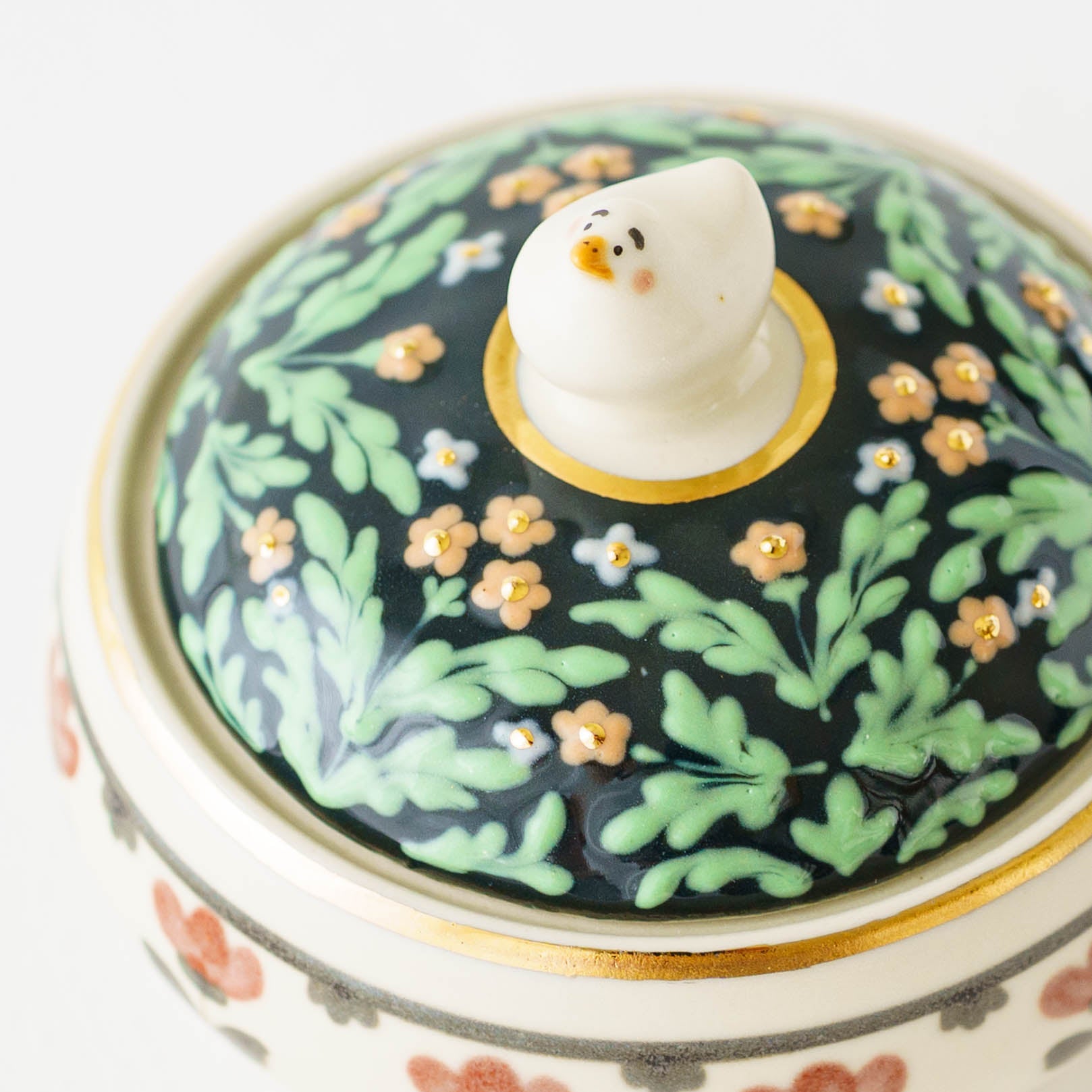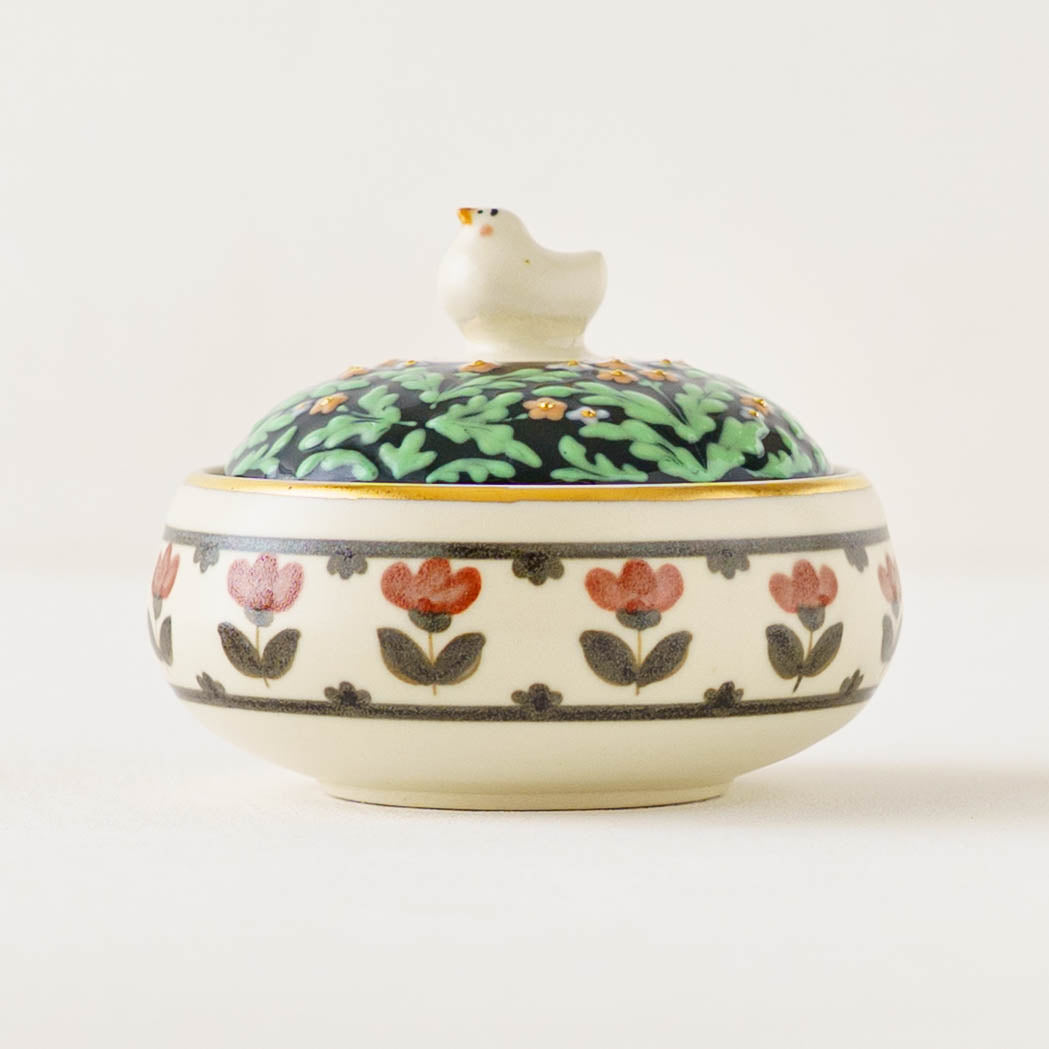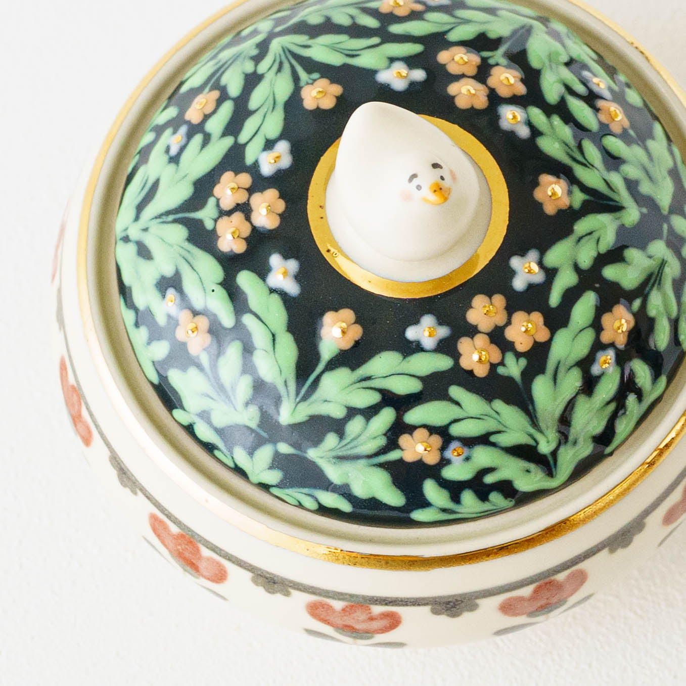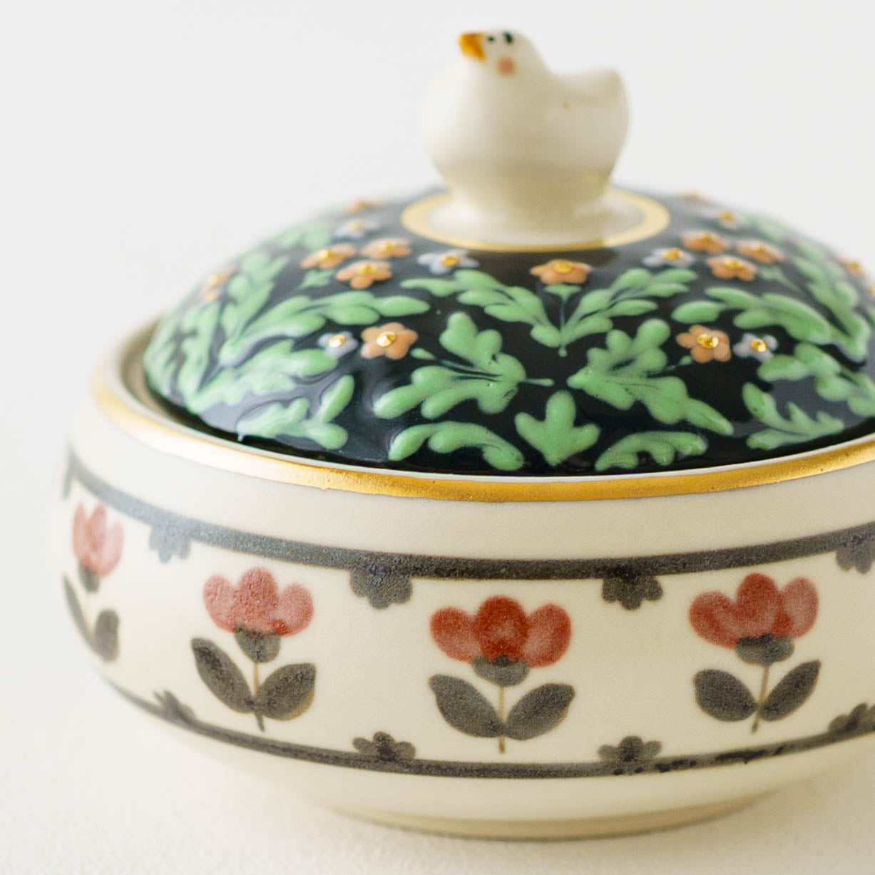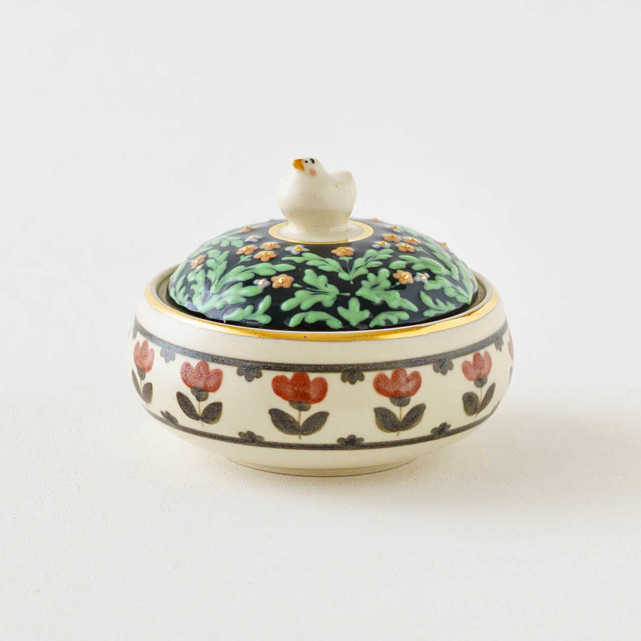 繊細かつ大胆な構図に目を見張るスリップウェアには息をのむ美しさが宿り、淡くやさしい風合いの和紙染めのアヒルちゃんたちは見る人の心をやさしく癒してくれます。金彩が上品に煌めくレリーフシリーズはまた異なる華やかさを放ち、ひとりの作り手から生まれたとは思えないほど、多彩な物語を奏でています。