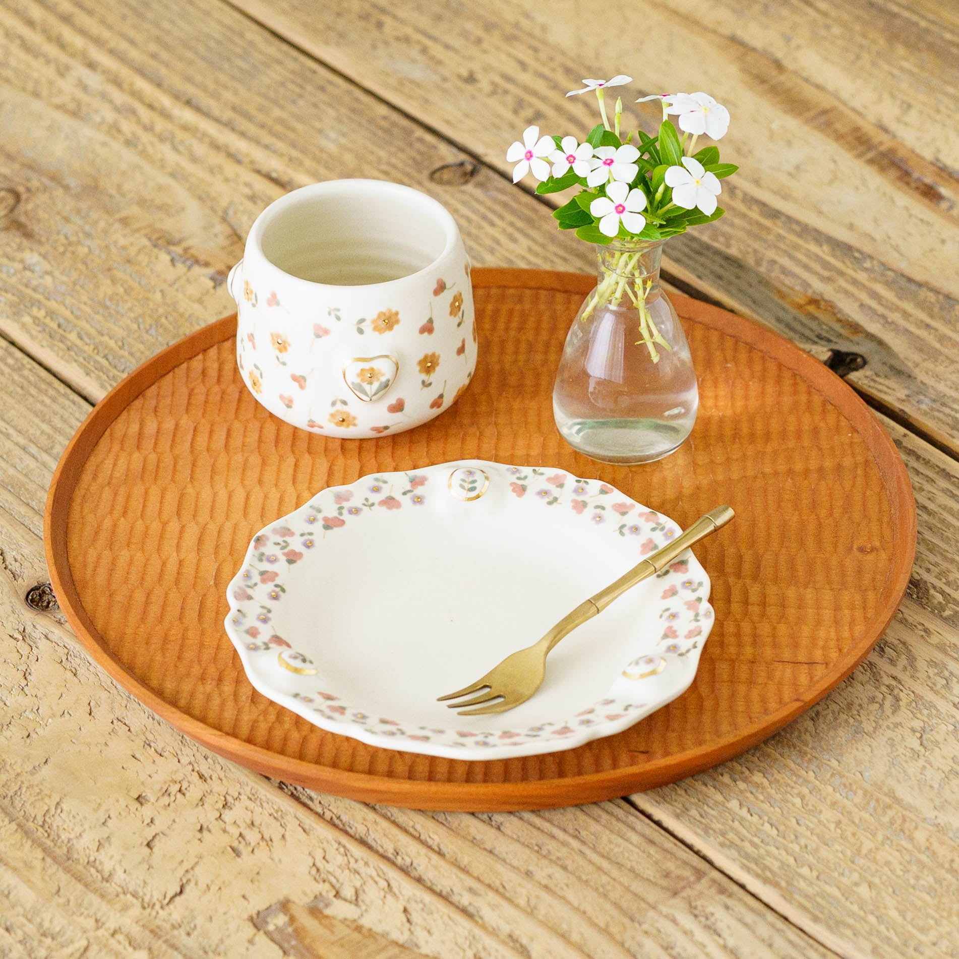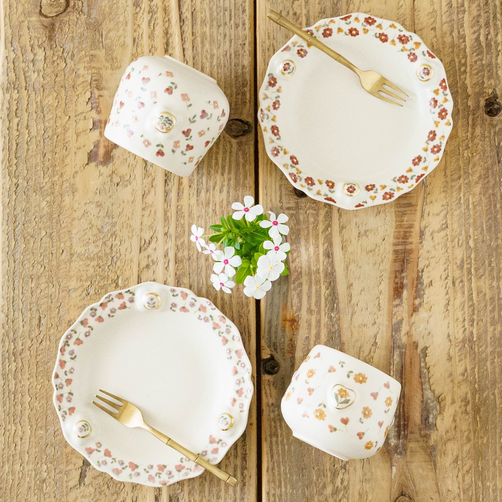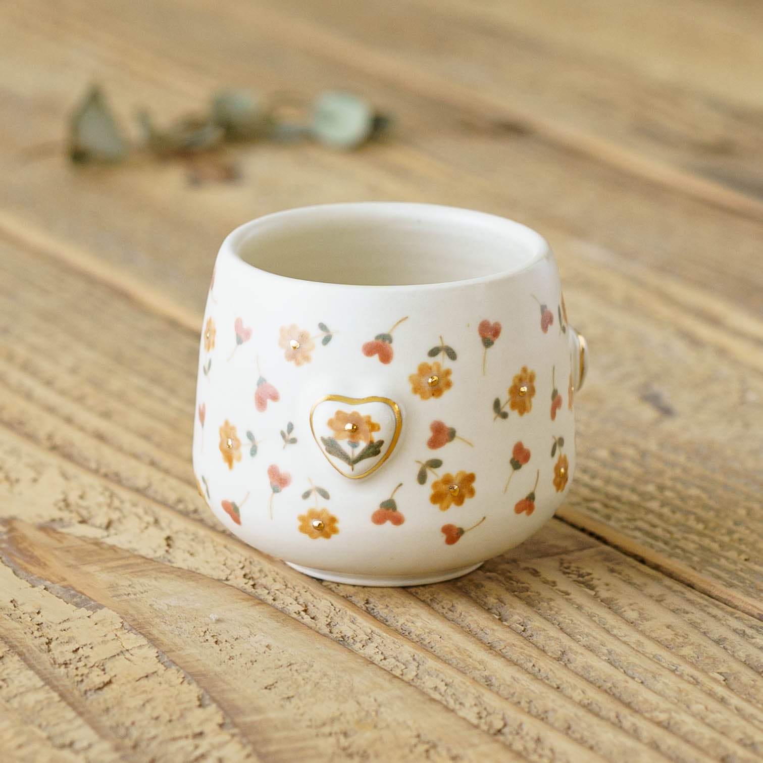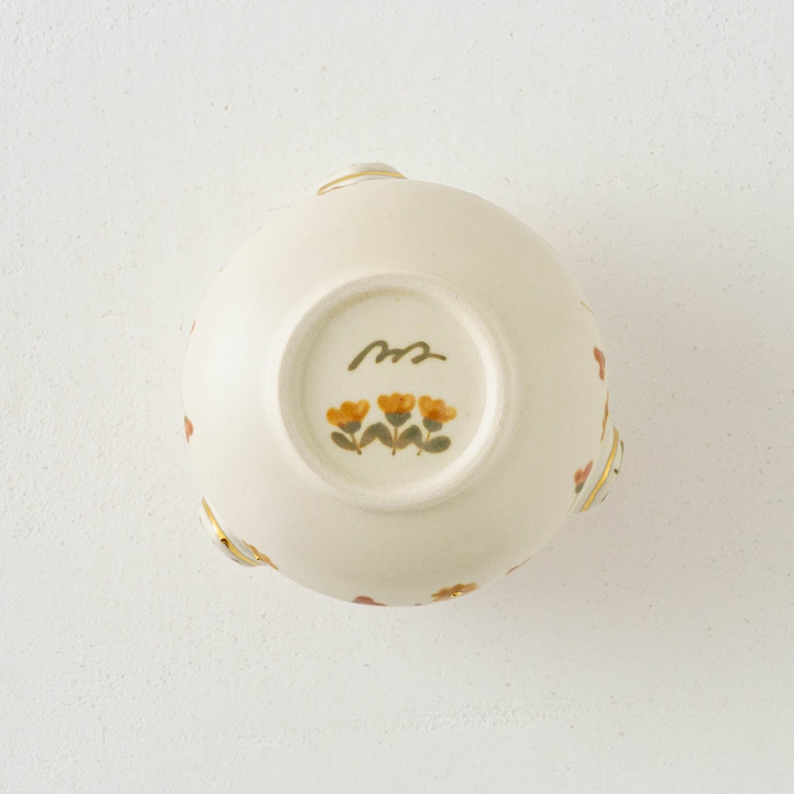 静かに咲く小花が、ひとつひとつ丁寧に手描きされたレリーフシリーズ。楚々とした花々は、草原を渡るやわらかな風や、かすかに漂う花の香りを思わせます。淡くひろがる花模様は、時の流れさえゆるやかにしてくれるような穏やかさ。金彩は控えめに光を受け、まるで夕暮れの光がそっと触れるようにきらめきます。