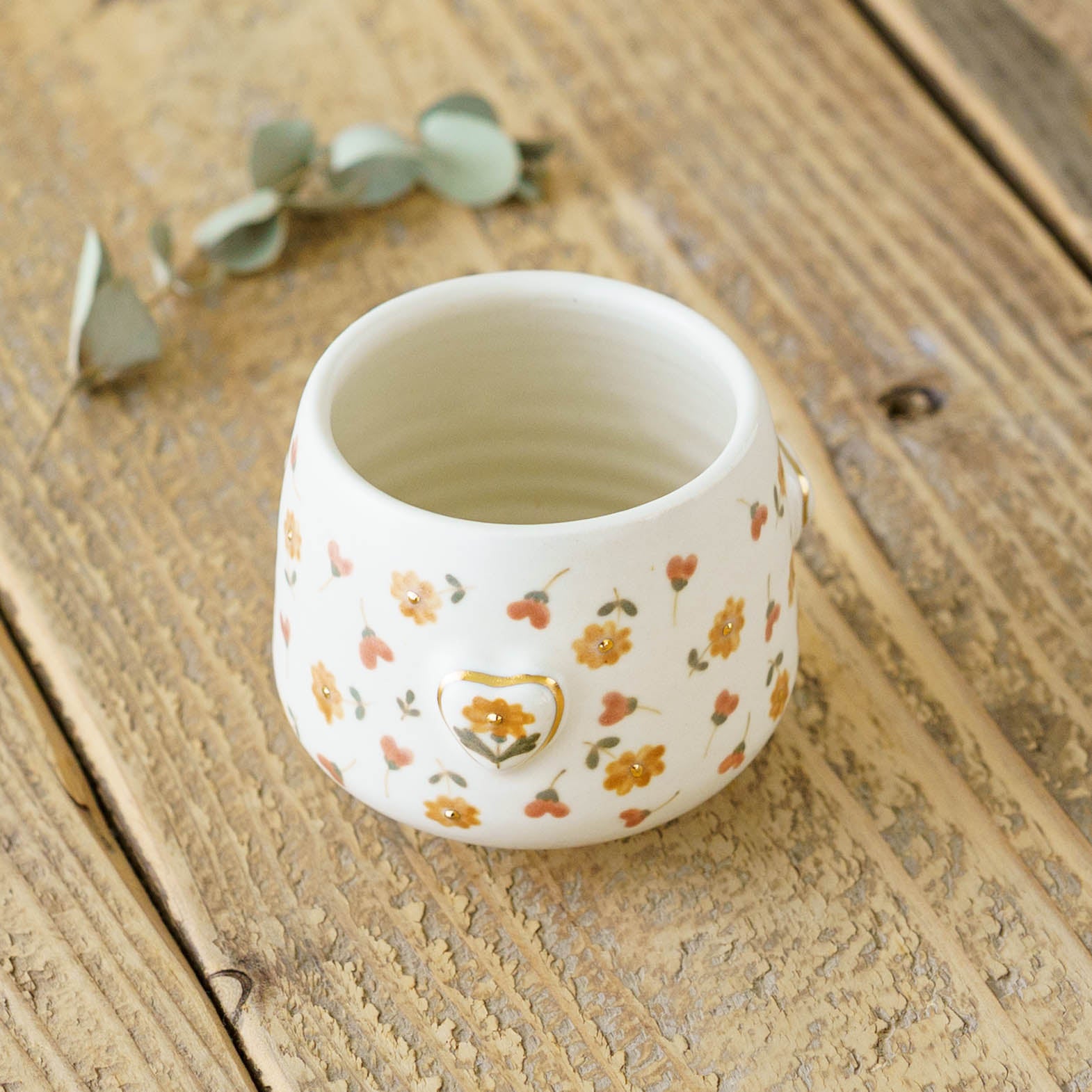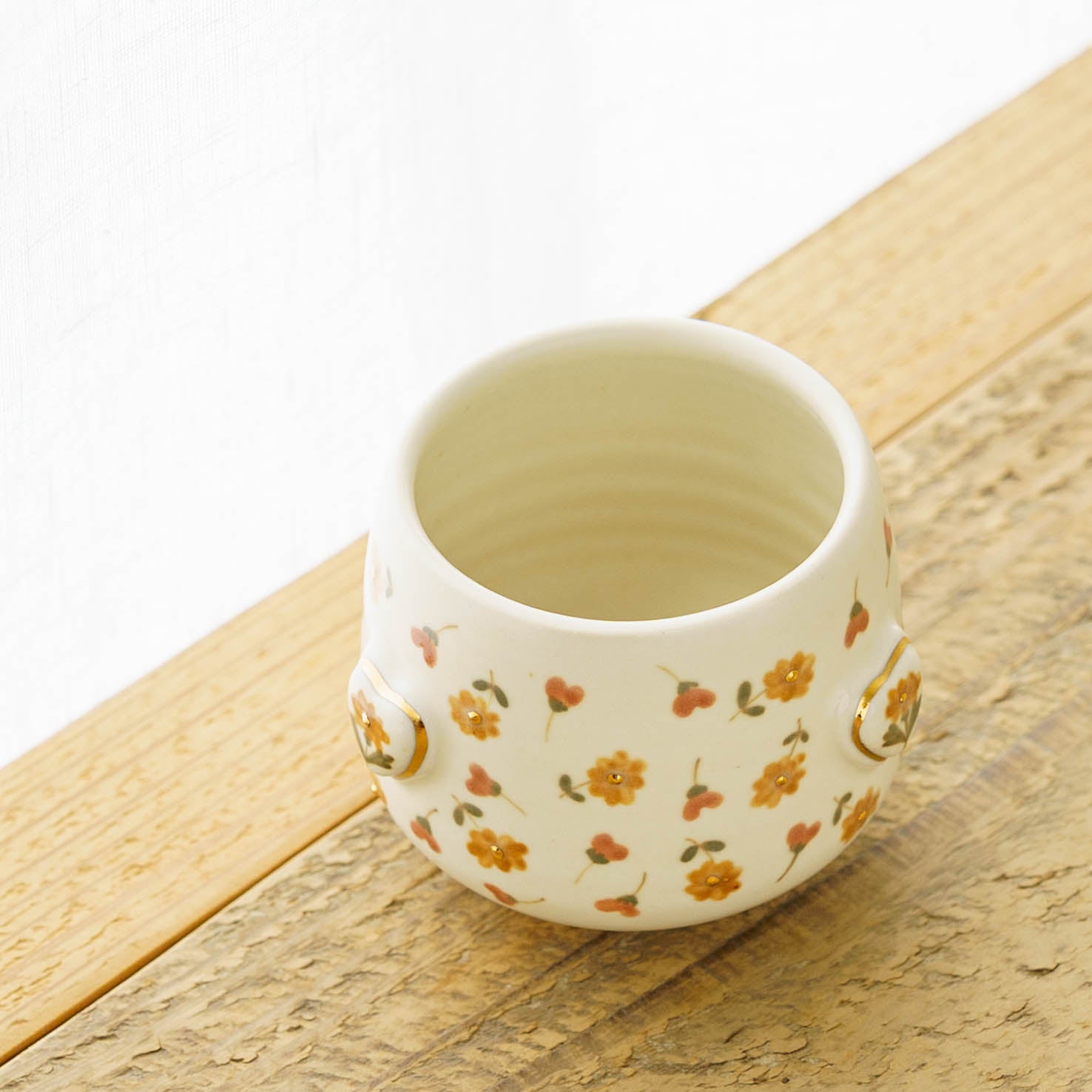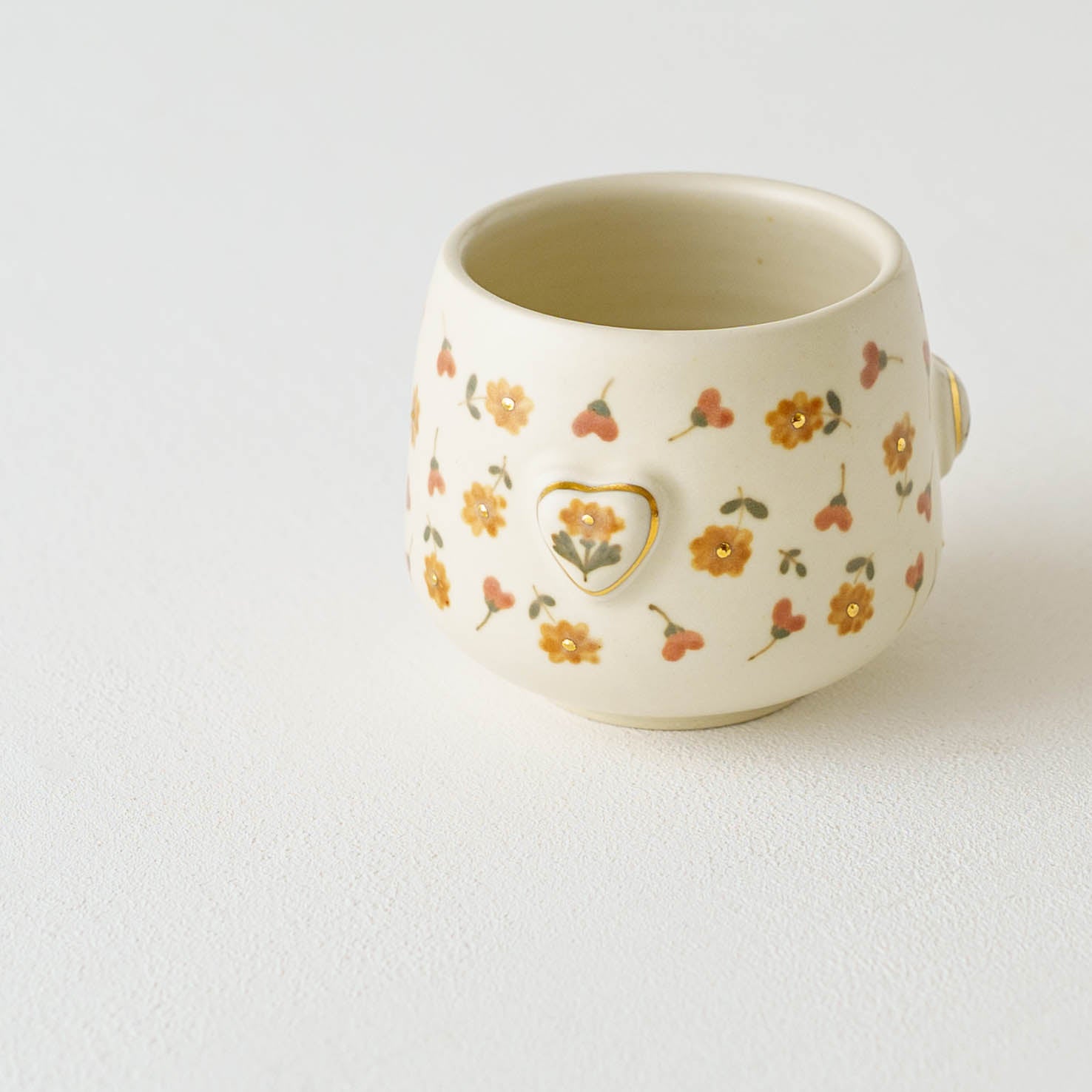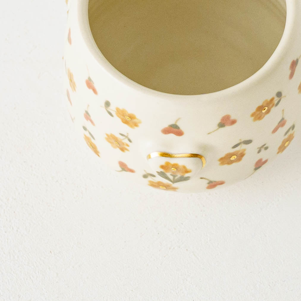 静かに咲く小花が、ひとつひとつ丁寧に手描きされたレリーフシリーズ。楚々とした花々は、草原を渡るやわらかな風や、かすかに漂う花の香りを思わせます。淡くひろがる花模様は、時の流れさえゆるやかにしてくれるような穏やかさ。金彩は控えめに光を受け、まるで夕暮れの光がそっと触れるようにきらめきます。