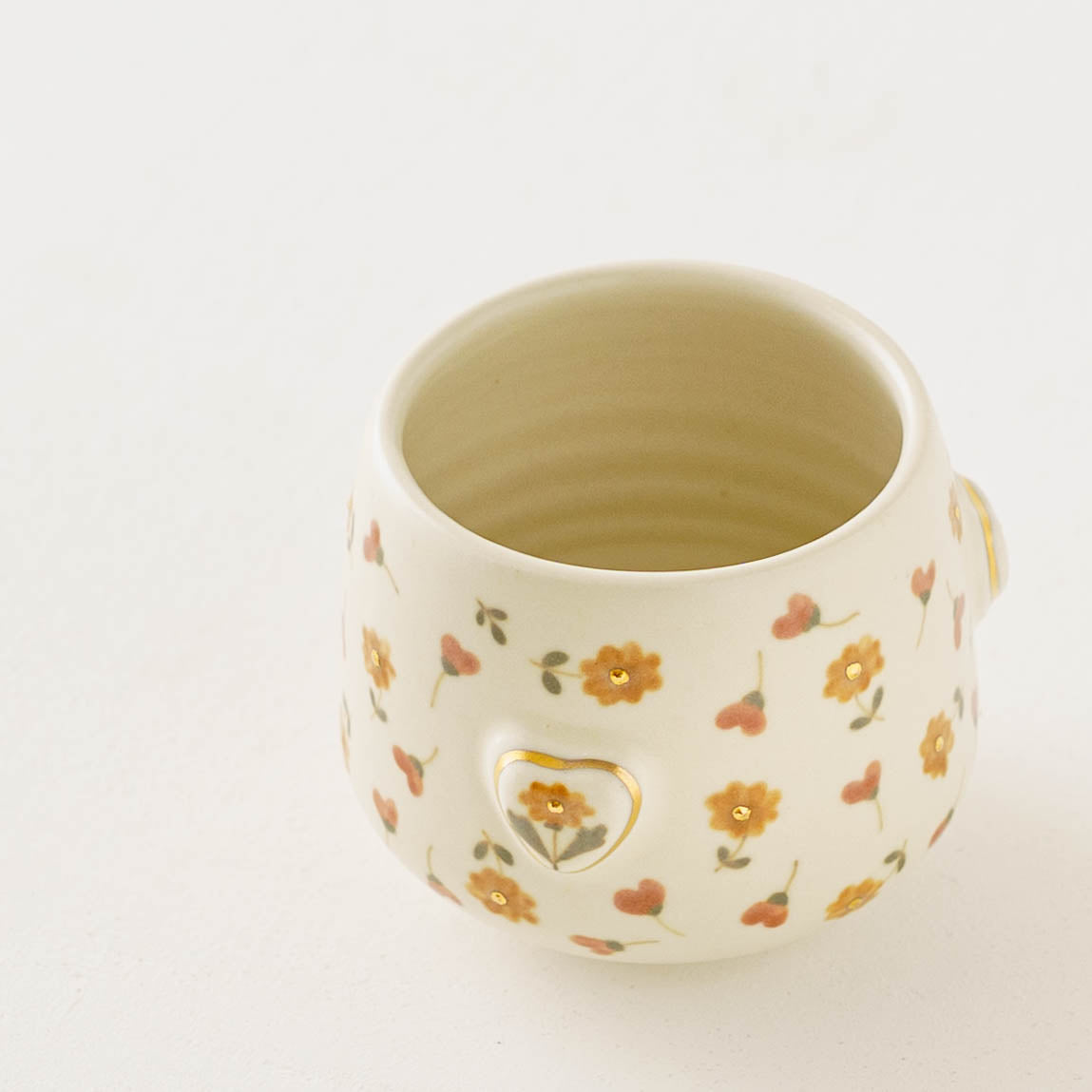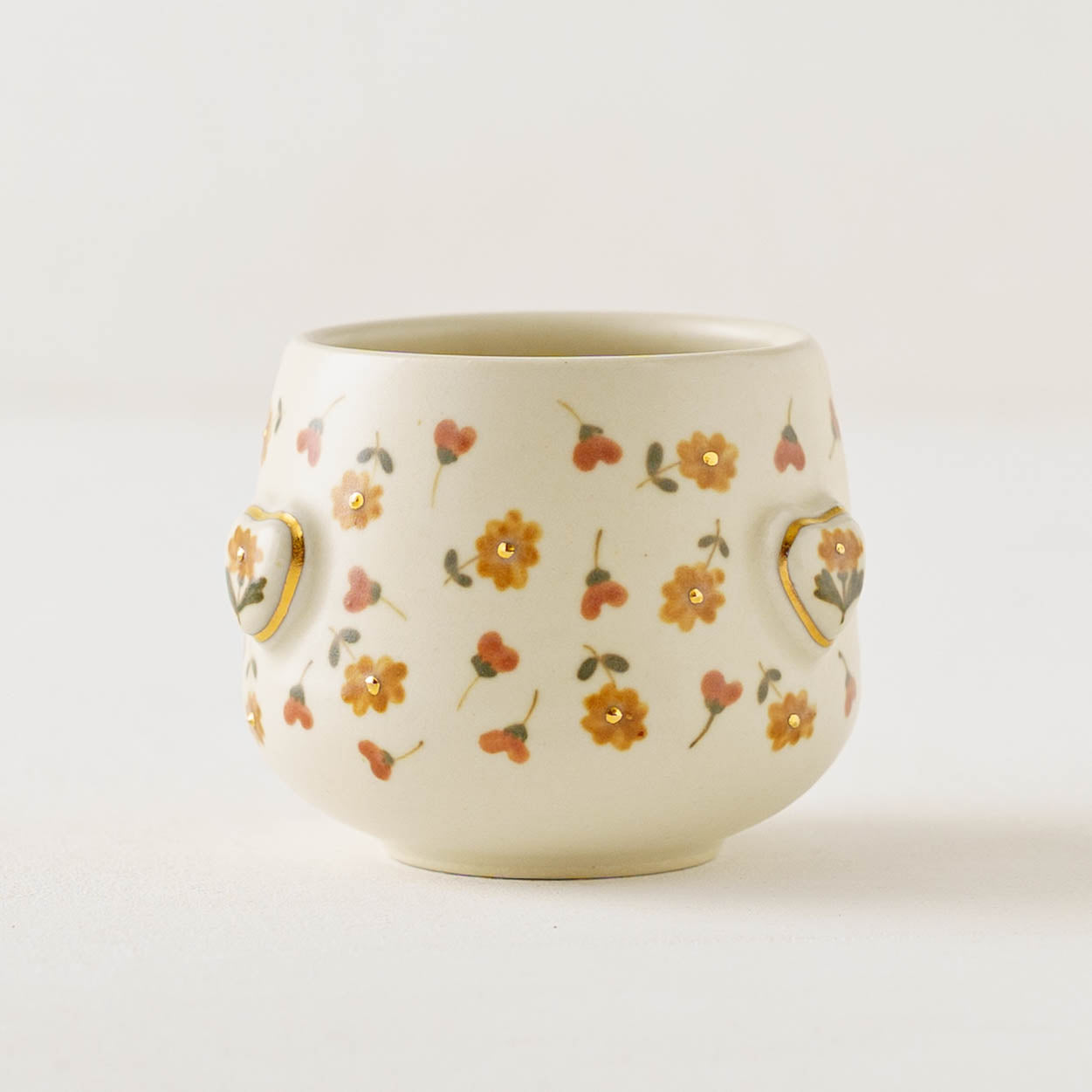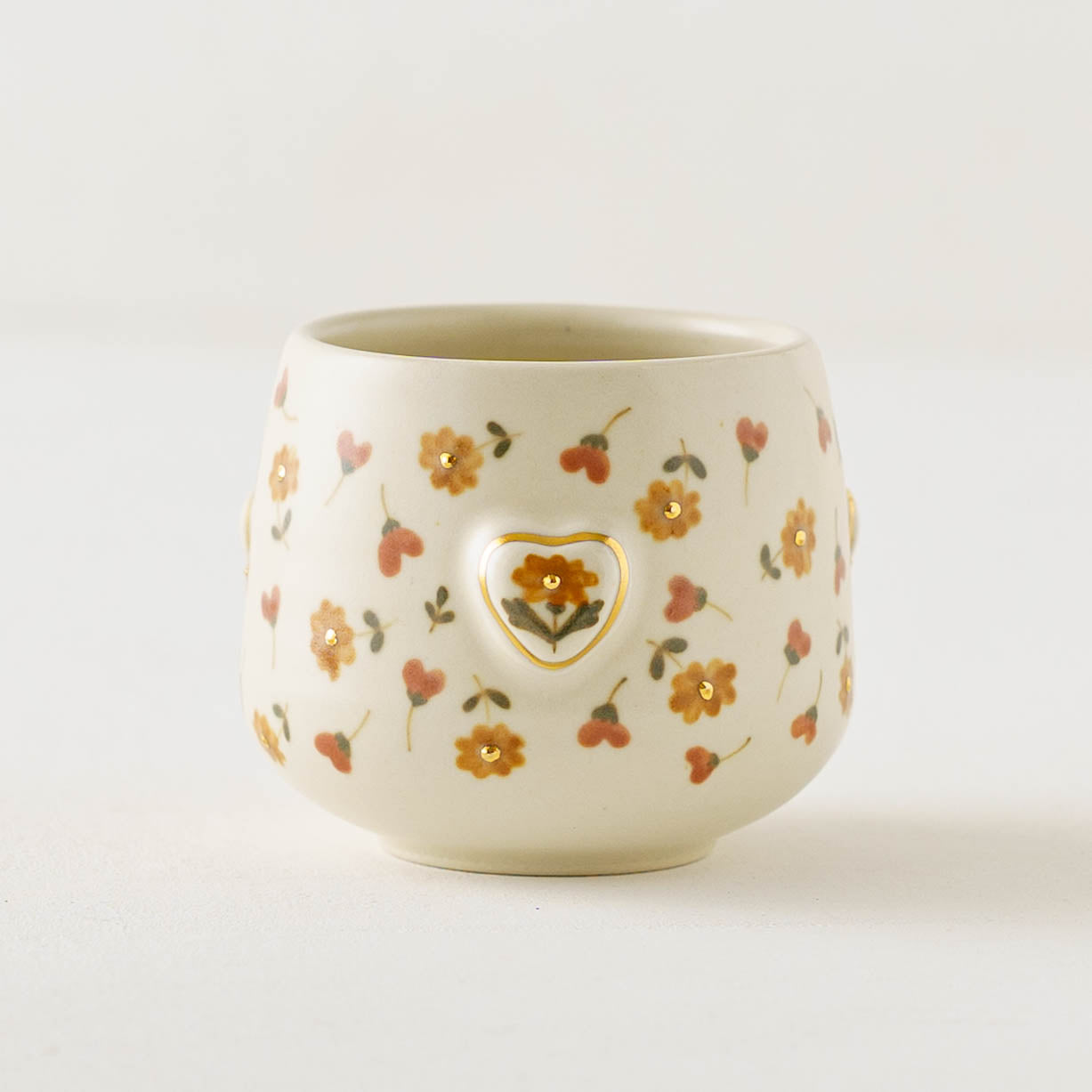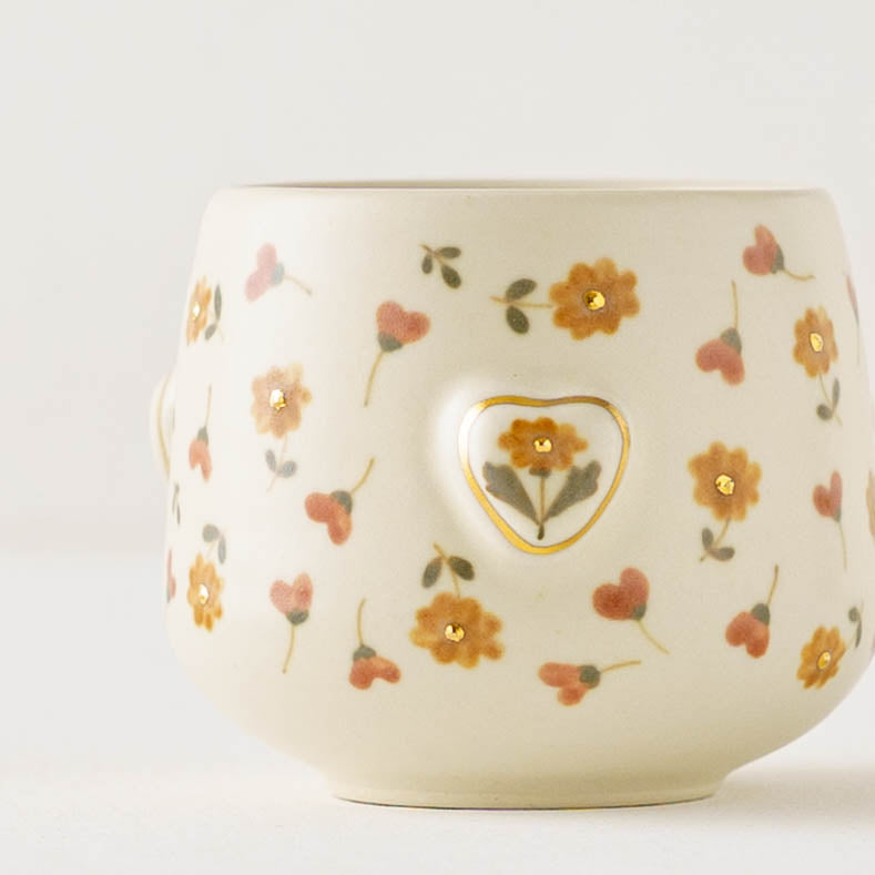 静かに咲く小花が、ひとつひとつ丁寧に手描きされたレリーフシリーズ。楚々とした花々は、草原を渡るやわらかな風や、かすかに漂う花の香りを思わせます。淡くひろがる花模様は、時の流れさえゆるやかにしてくれるような穏やかさ。金彩は控えめに光を受け、まるで夕暮れの光がそっと触れるようにきらめきます。