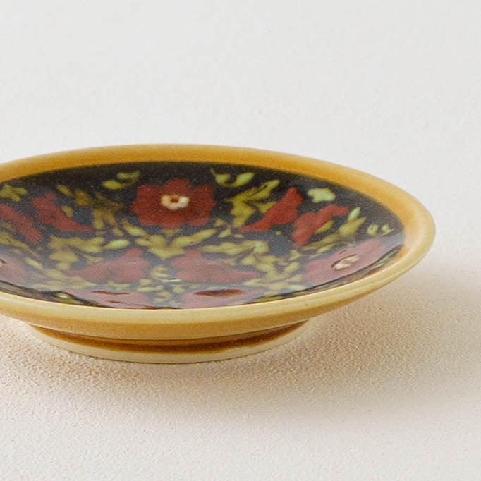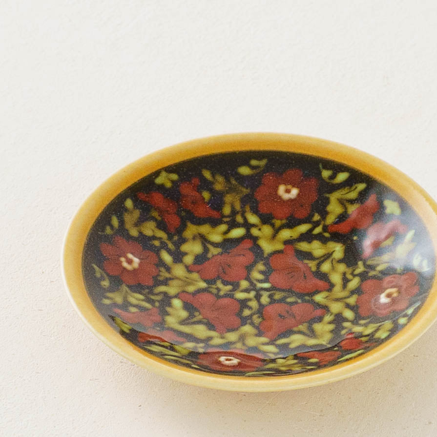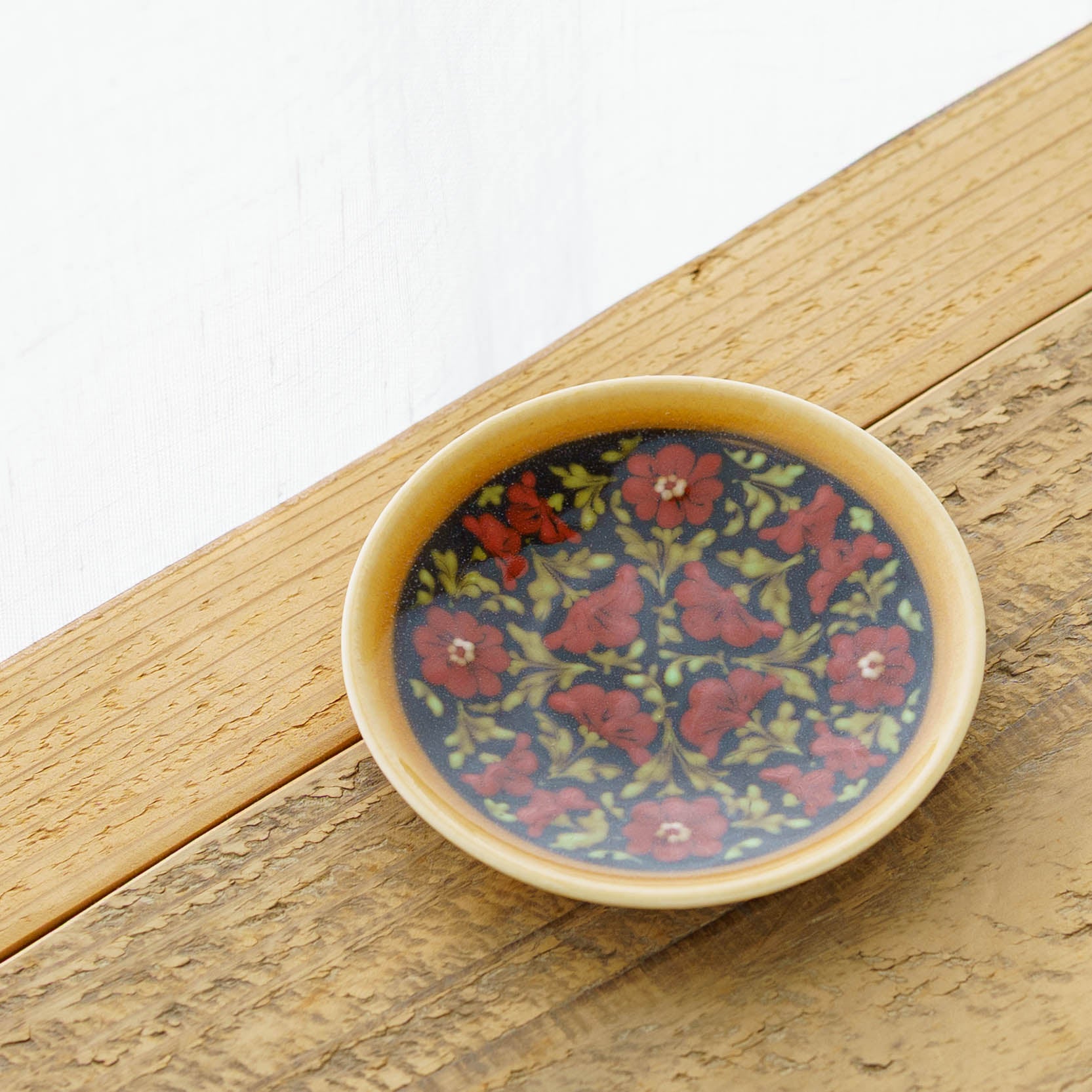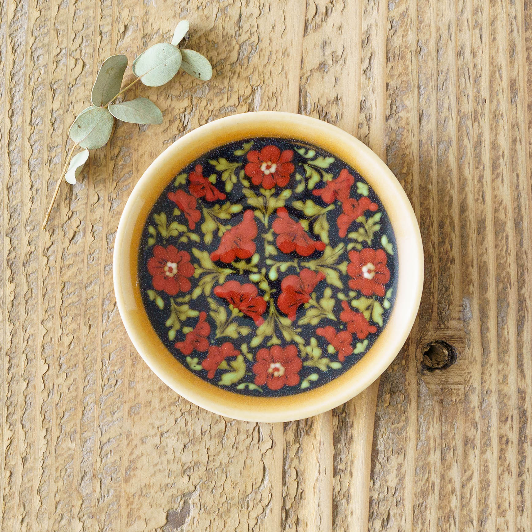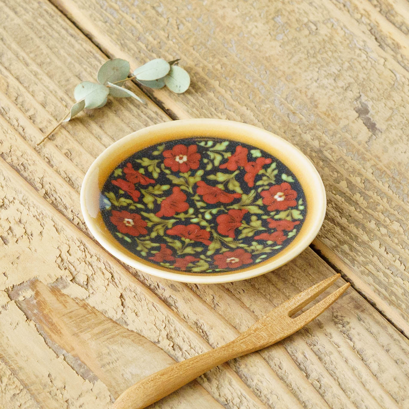 下描きはせず、一気呵成に描きあげるスリップウェア。釉薬が乾く前の一瞬しかないからこそ、流れるように描かれた草花模様は、どこか自由で、風が吹き抜けるような軽やかさをまとっています。