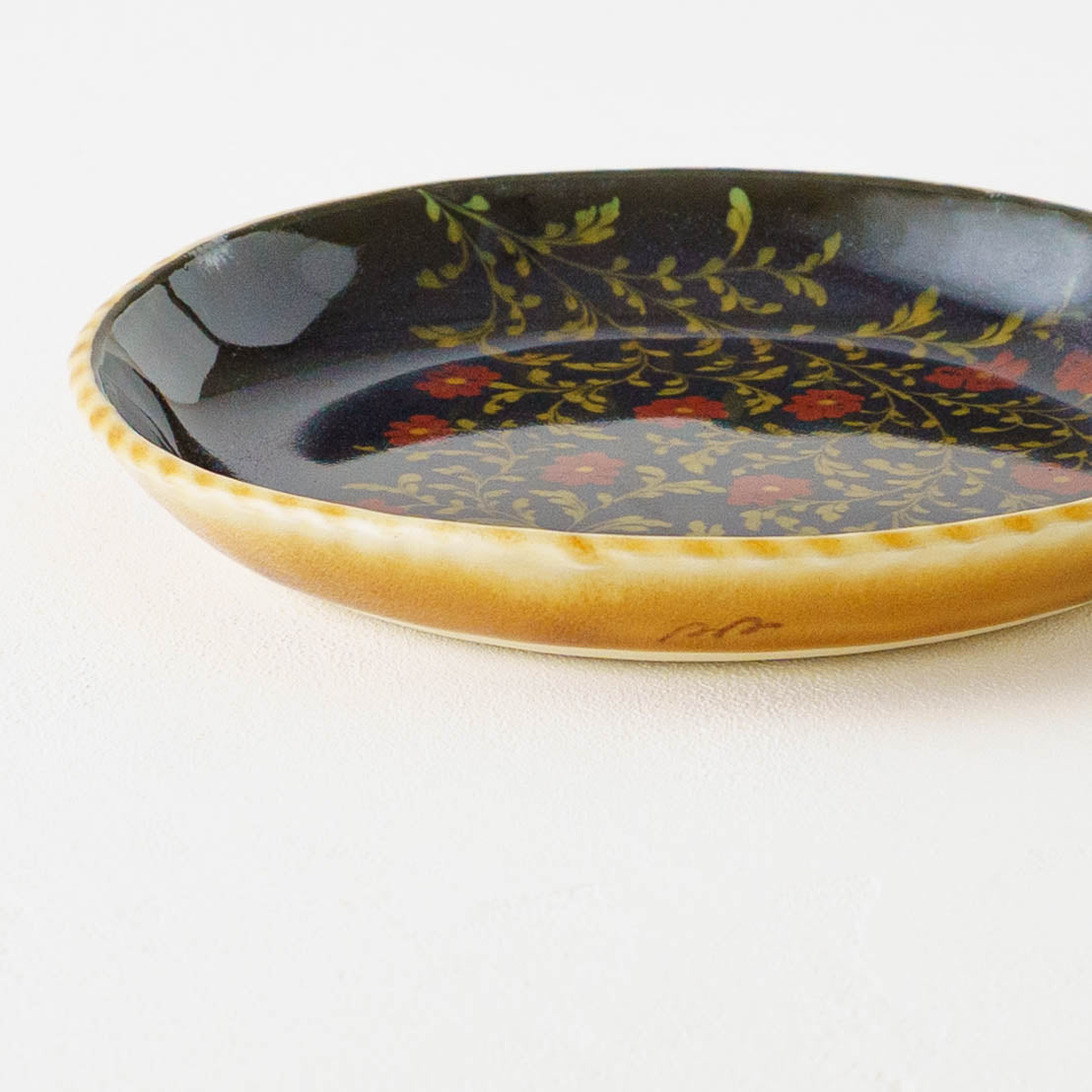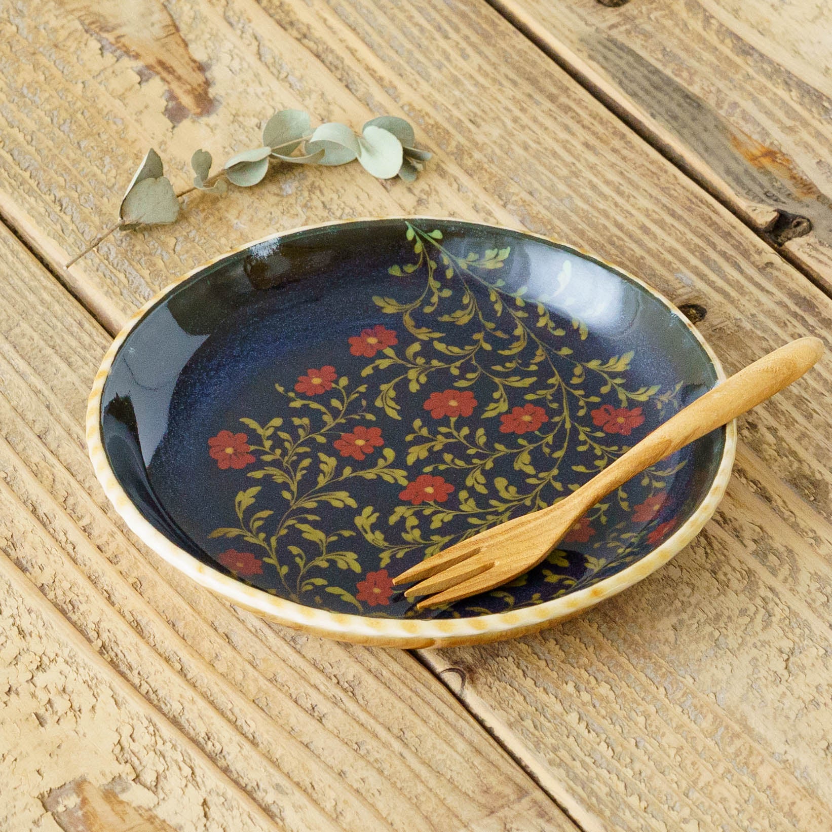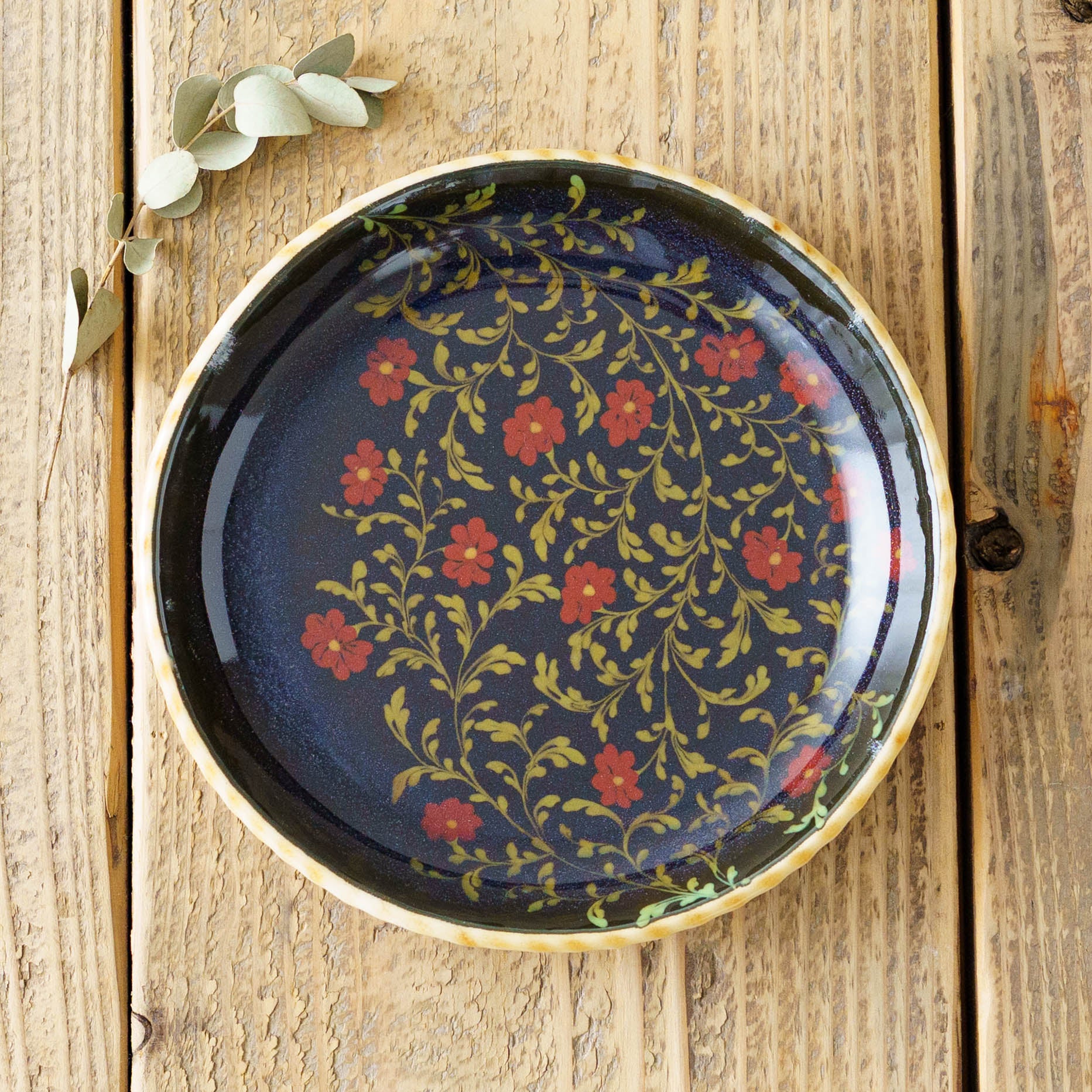 下描きはせず、一気呵成に描きあげるスリップウェア。釉薬が乾く前の一瞬しかないからこそ、流れるように描かれた草花模様は、どこか自由で、風が吹き抜けるような軽やかさをまとっています。