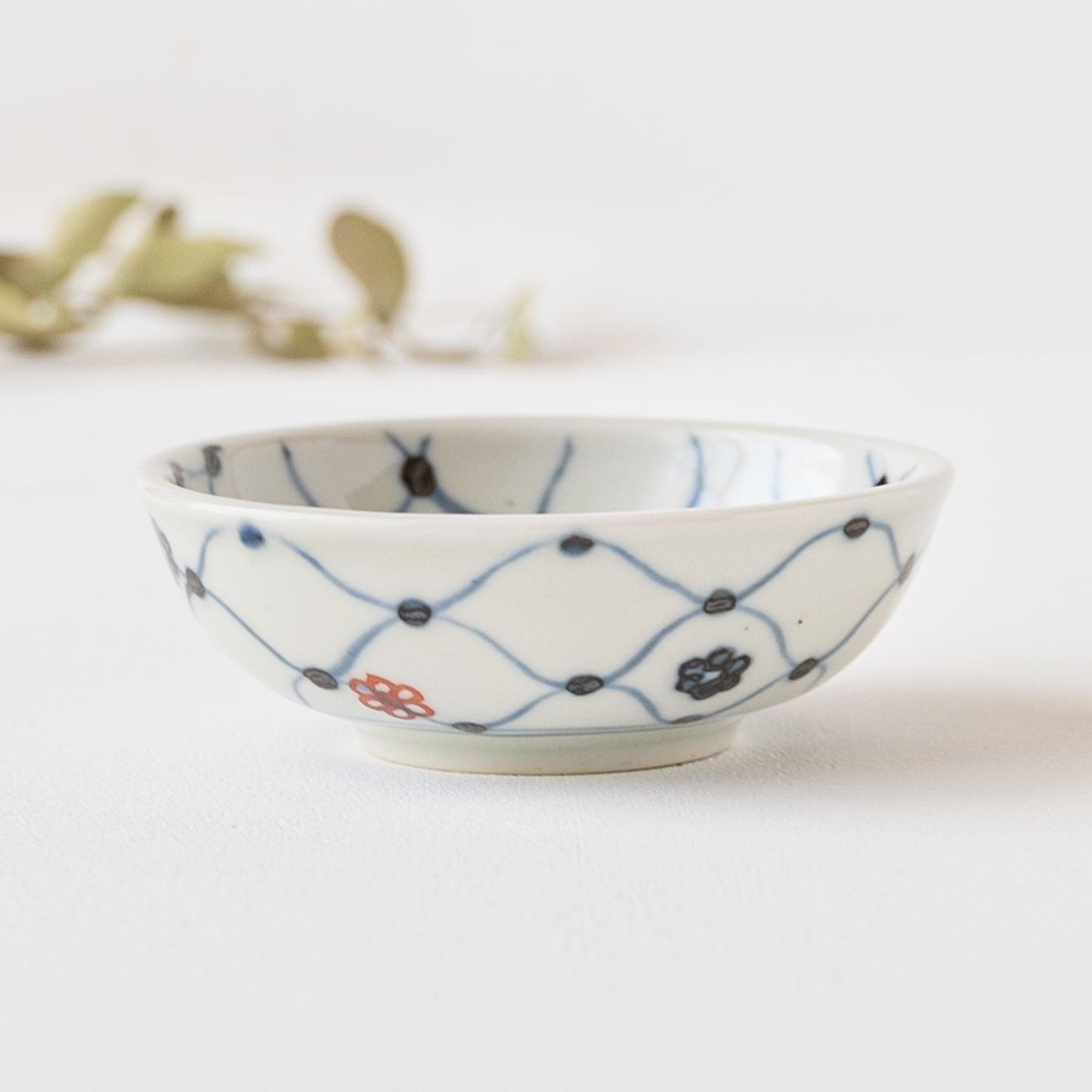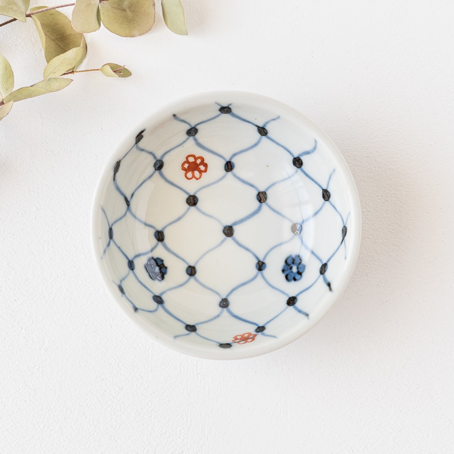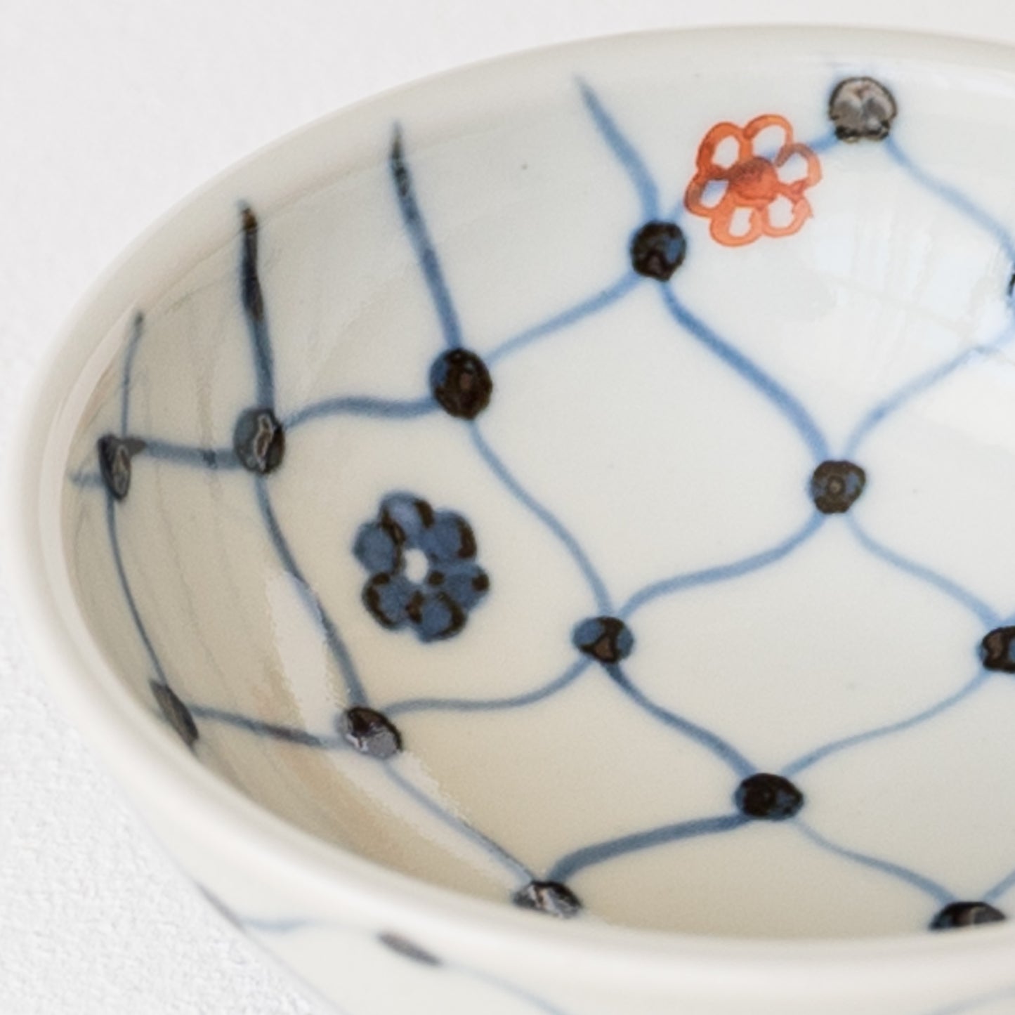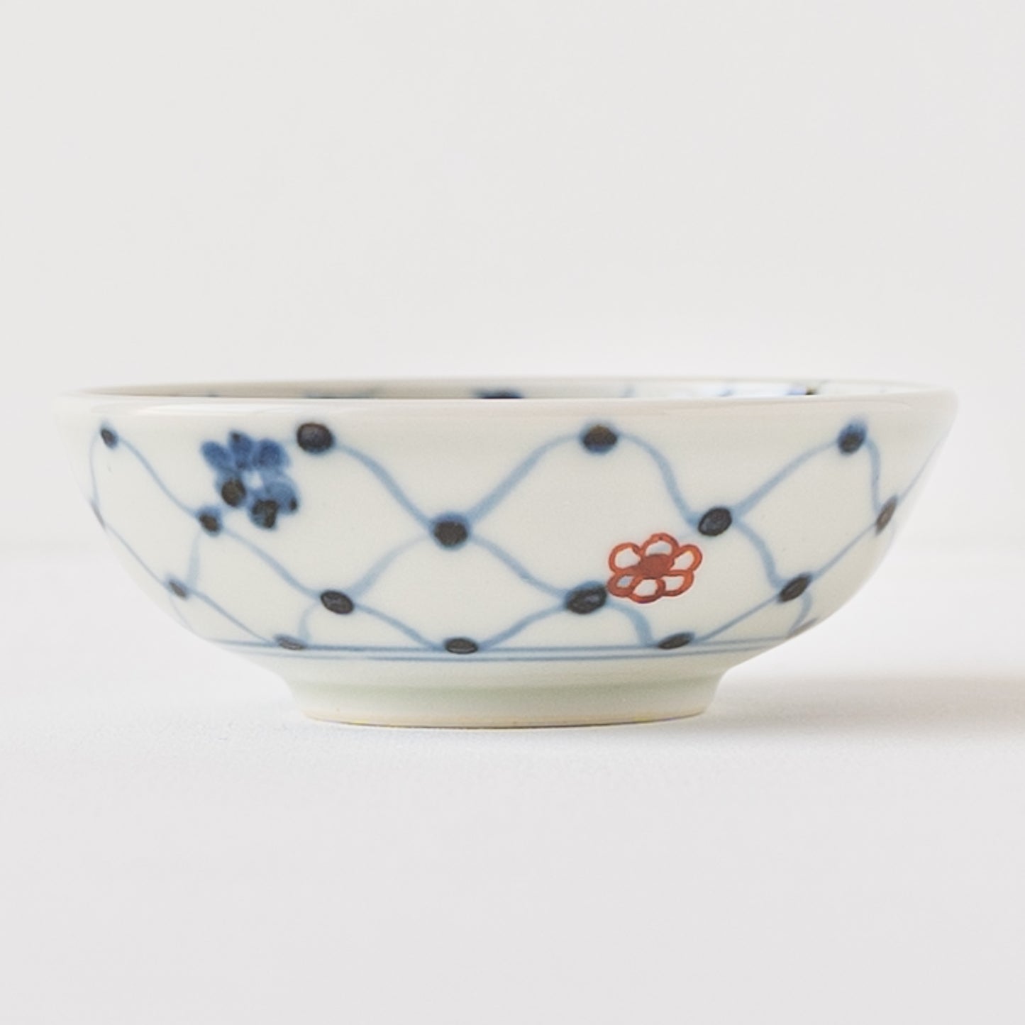 日本の伝統的な文様の網目の絵柄に呉須と赤絵の小花をあしらったなんともキュートなそば猪口。絵付けはすべて手描きなので、ひとつひとつ違った表情に趣きがあって眺めているだけで心が和みます。