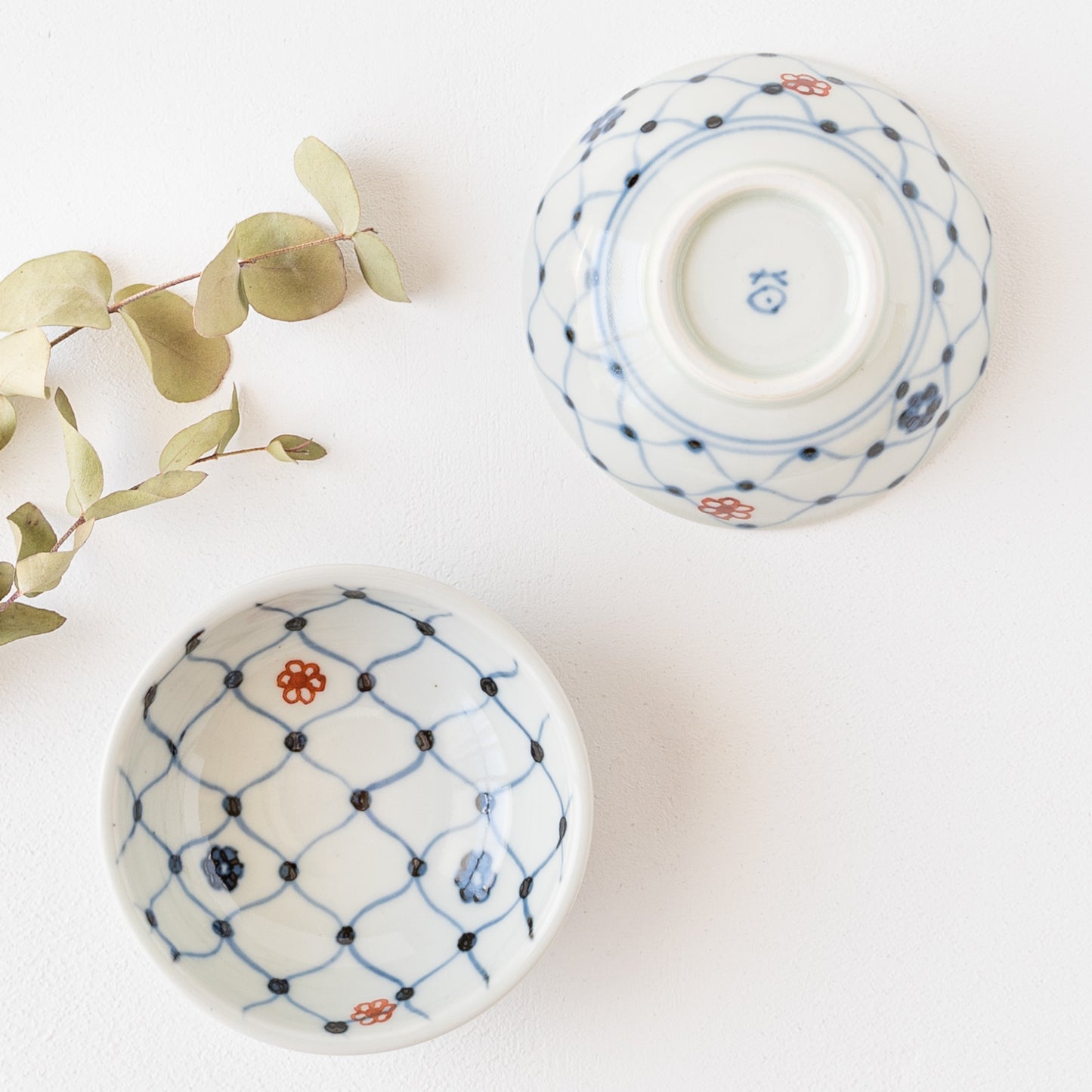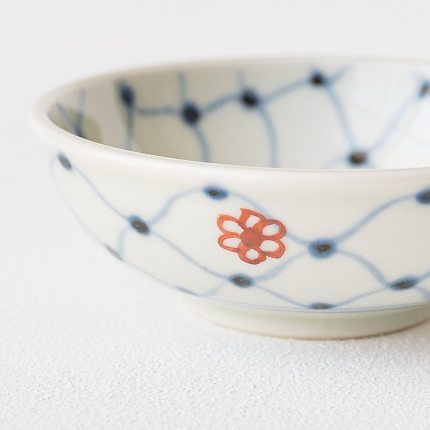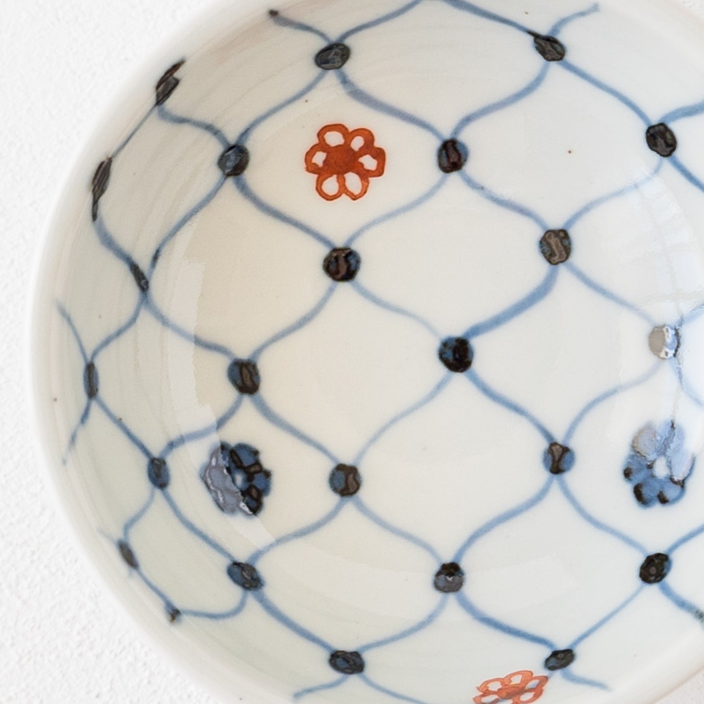 日本の伝統的な文様の網目の絵柄に呉須と赤絵の小花をあしらったなんともキュートなそば猪口。絵付けはすべて手描きなので、ひとつひとつ違った表情に趣きがあって眺めているだけで心が和みます。