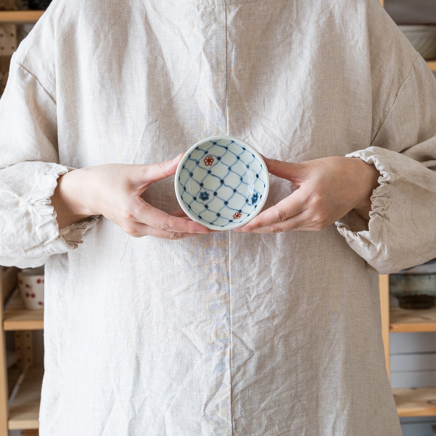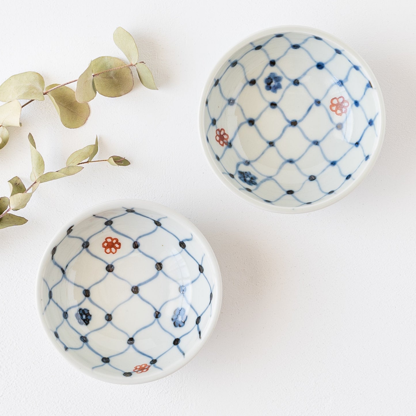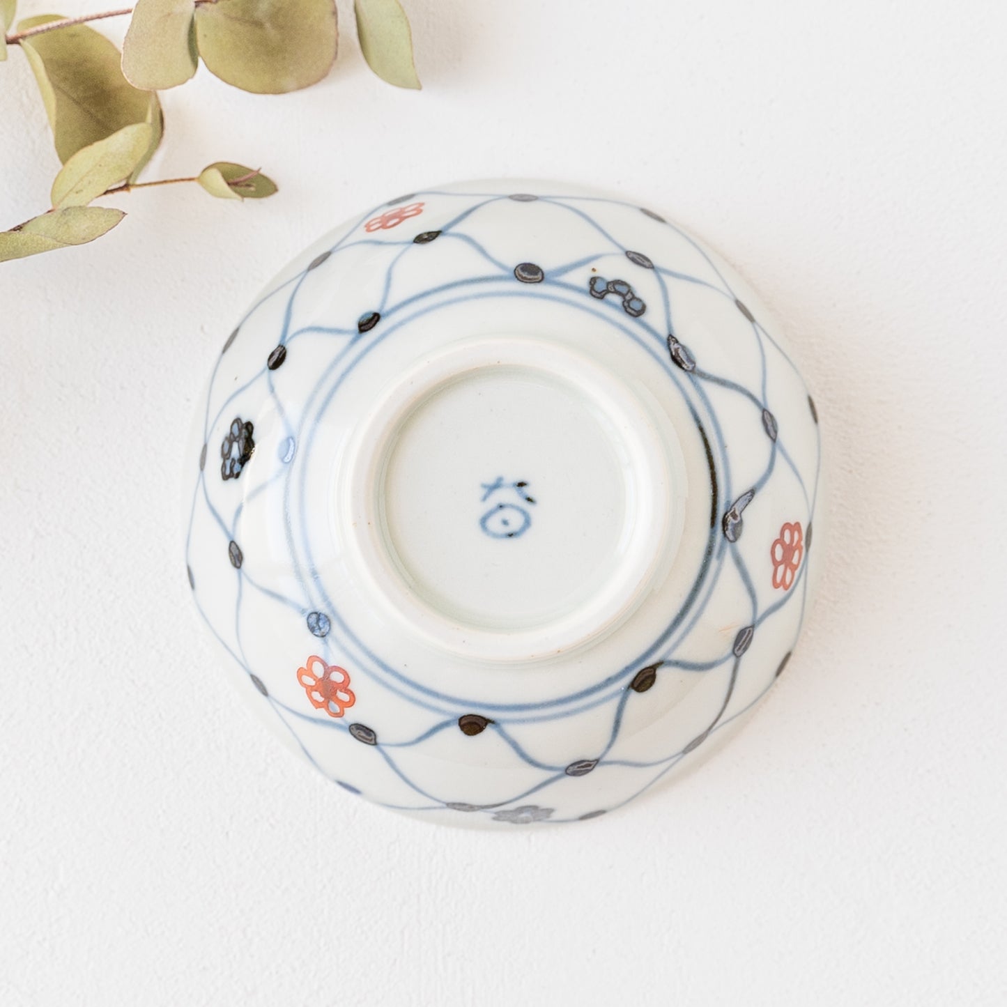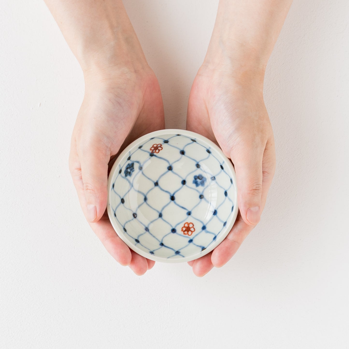 日本の伝統的な文様の網目の絵柄に呉須と赤絵の小花をあしらったなんともキュートなそば猪口。絵付けはすべて手描きなので、ひとつひとつ違った表情に趣きがあって眺めているだけで心が和みます。