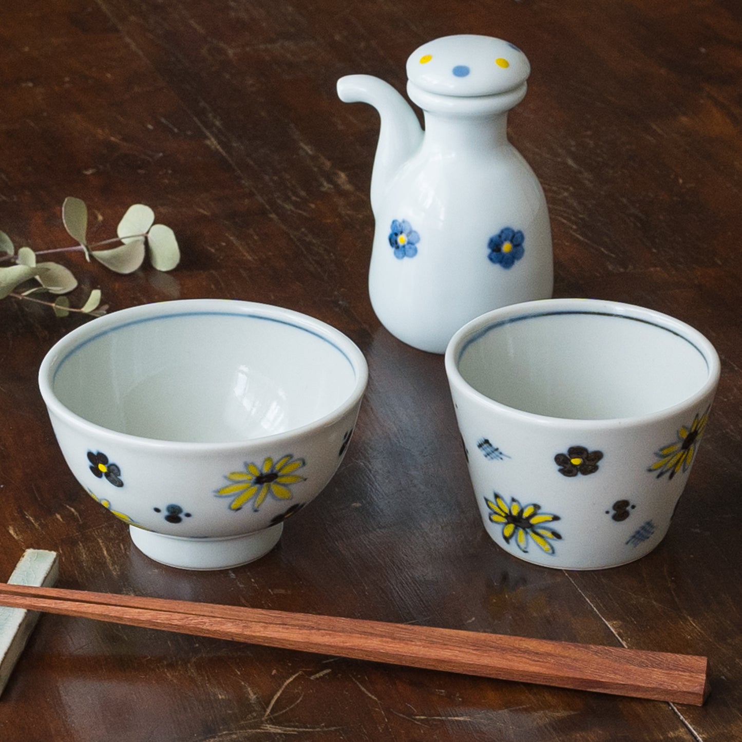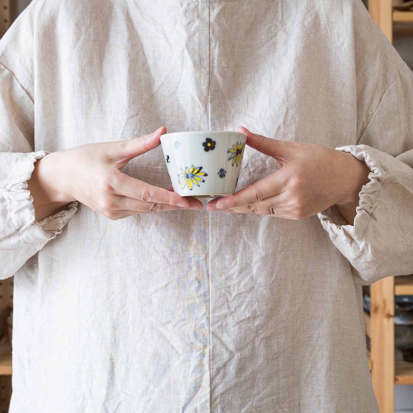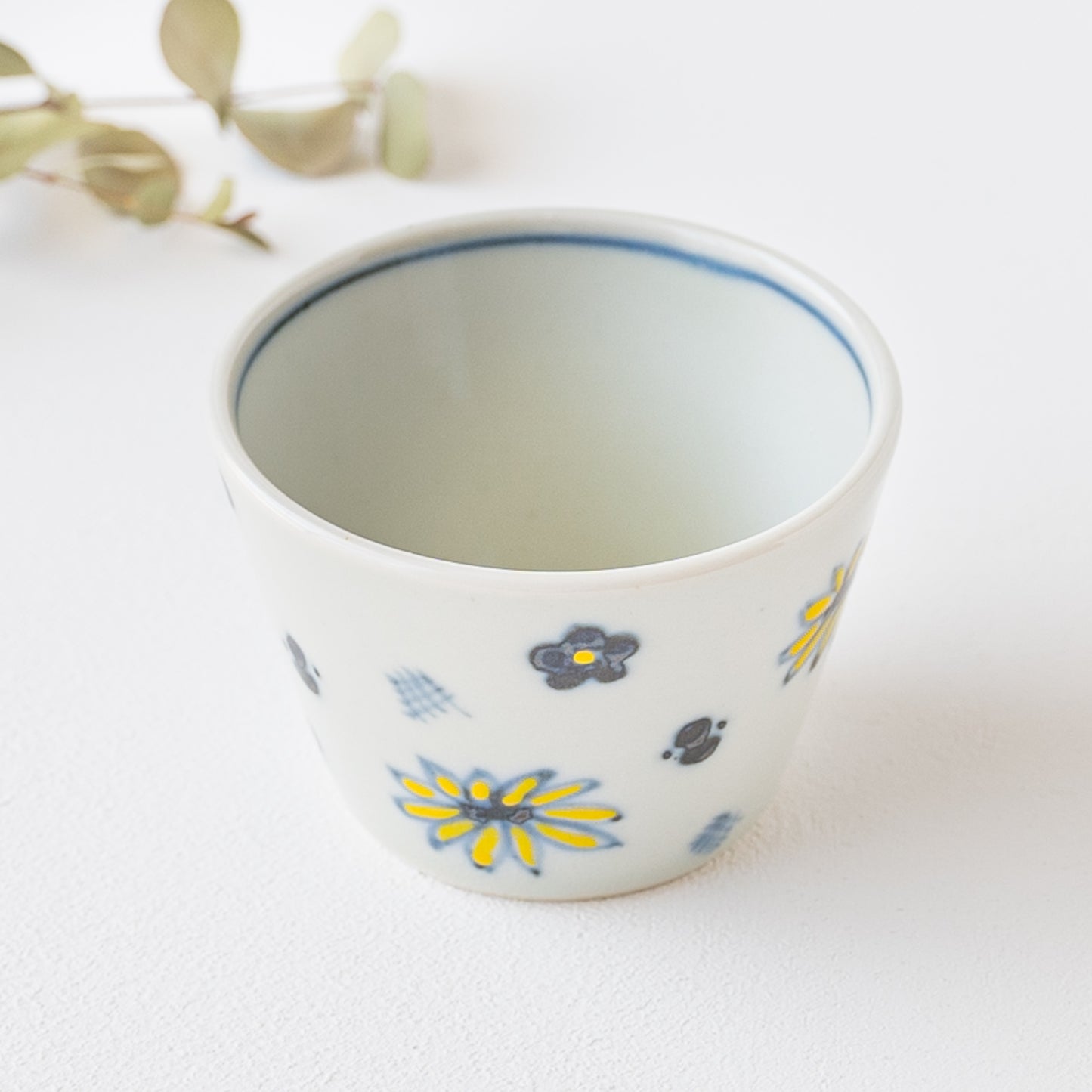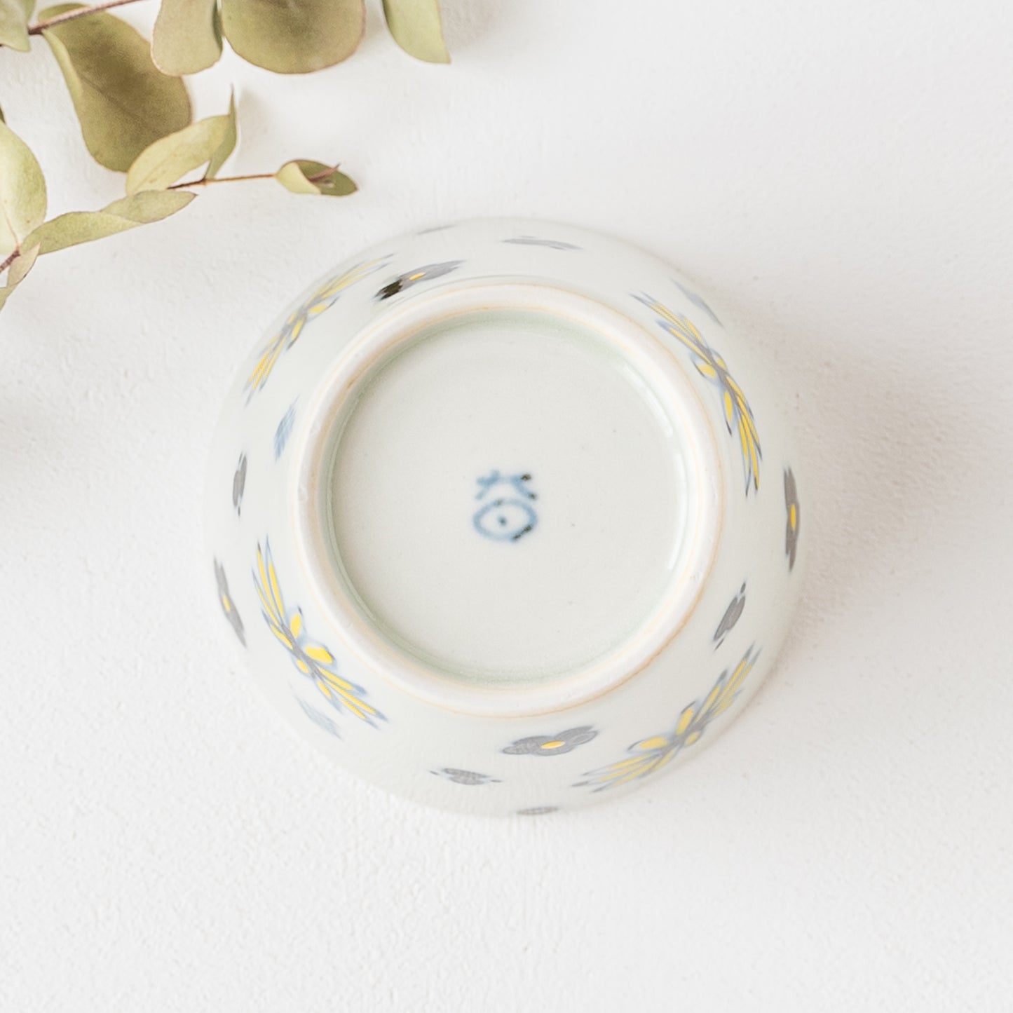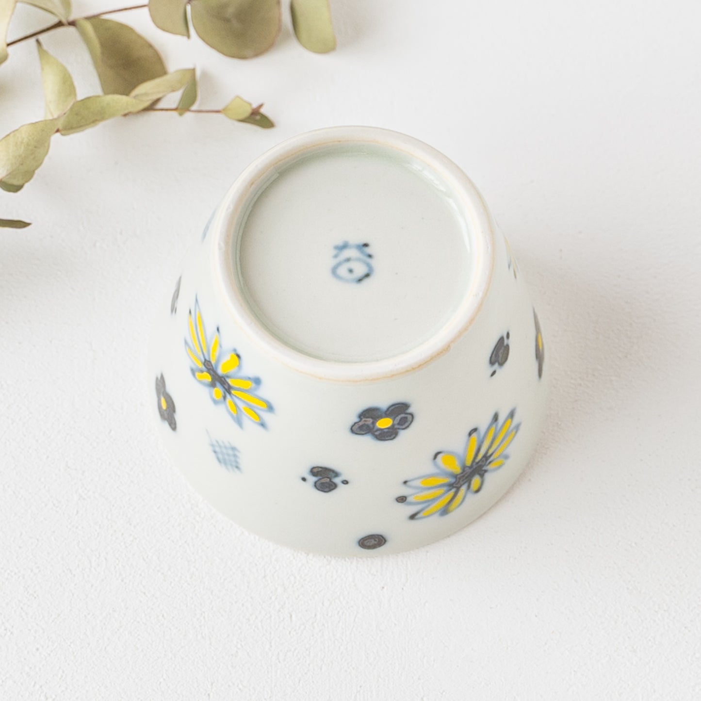 やさし気な濃淡の呉須色に明るく鮮やかな黄色いお花が素敵なアクセントになってとても素敵でなんともかわいい佇まいのそば猪口。絵付けはすべて手描きなので、ひとつひとつ違った表情に趣きがあって眺めているだけで心が和みます。