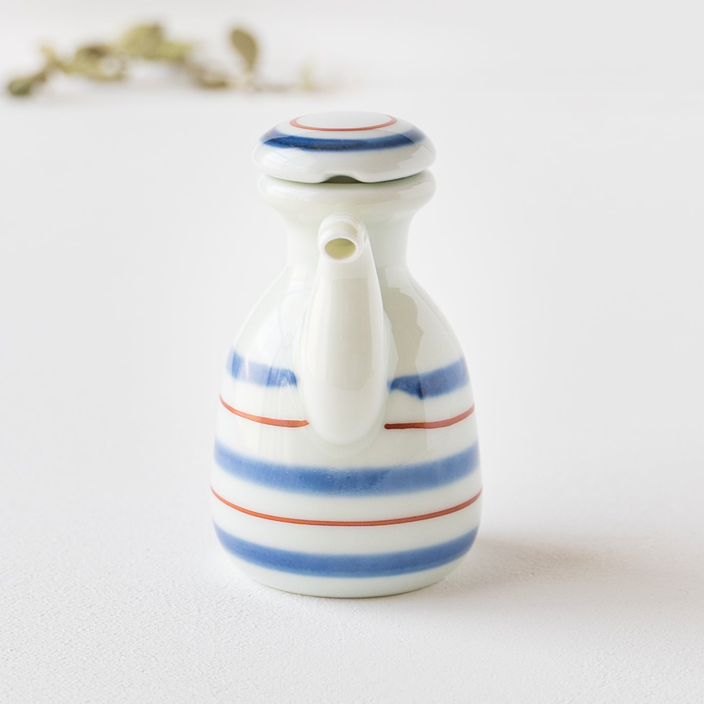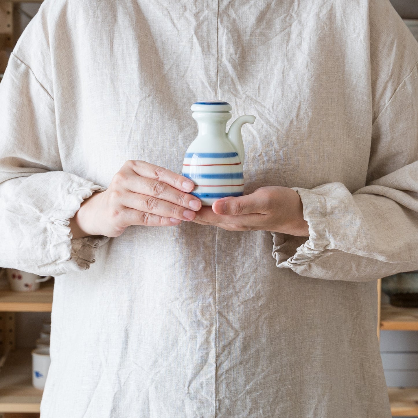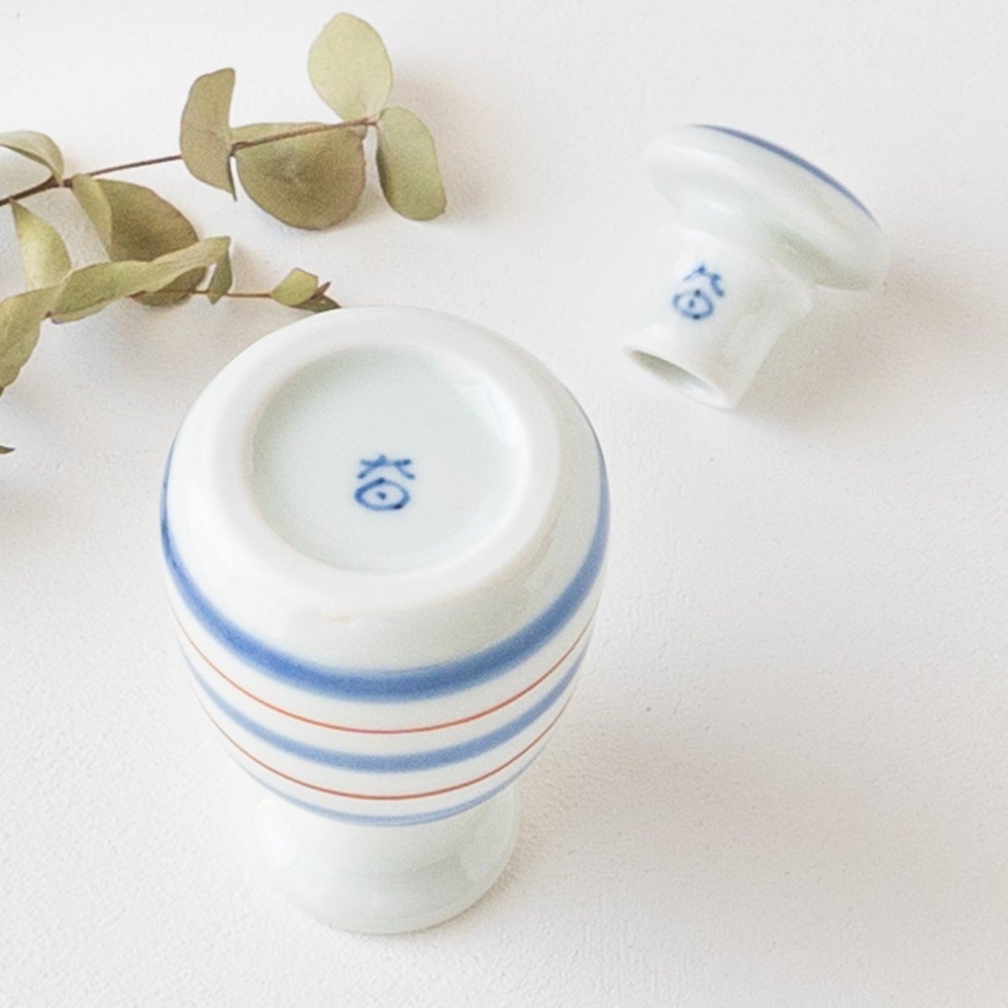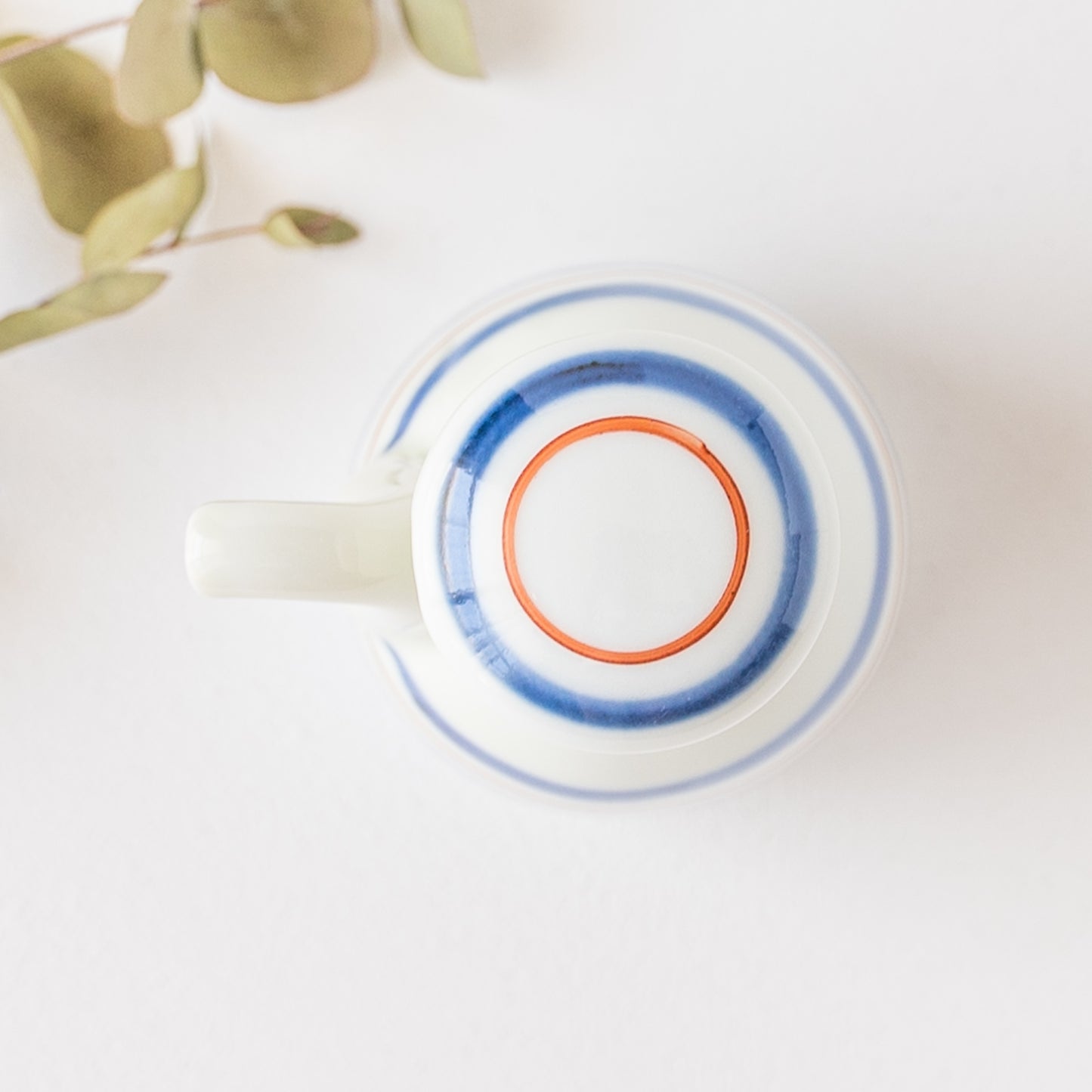 呉須と赤絵の線がきれいな線巻模様。淡くやさしい呉須にはっきりした赤絵の線が引かれていてなんとも素敵な佇まいです。絵付けはすべて手描きなので、ひとつひとつ違った表情に趣きがあって眺めているだけで心が和みます。