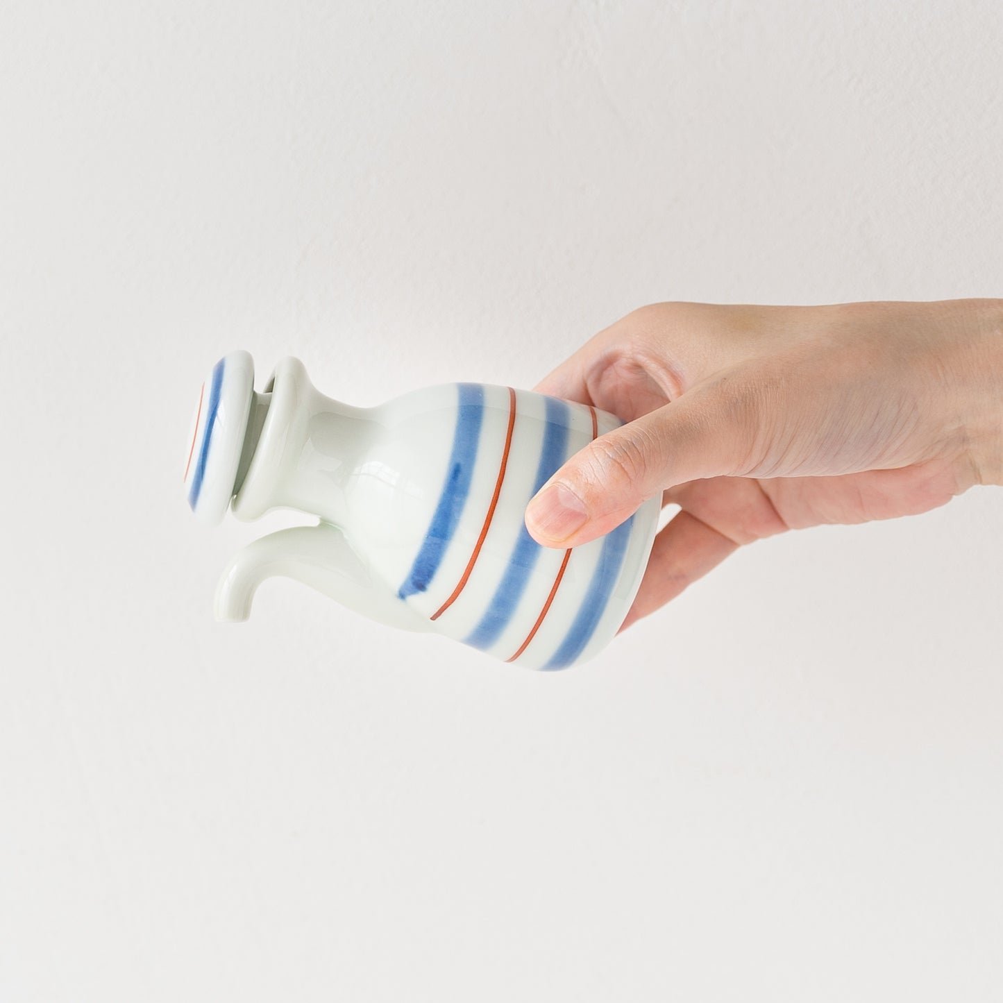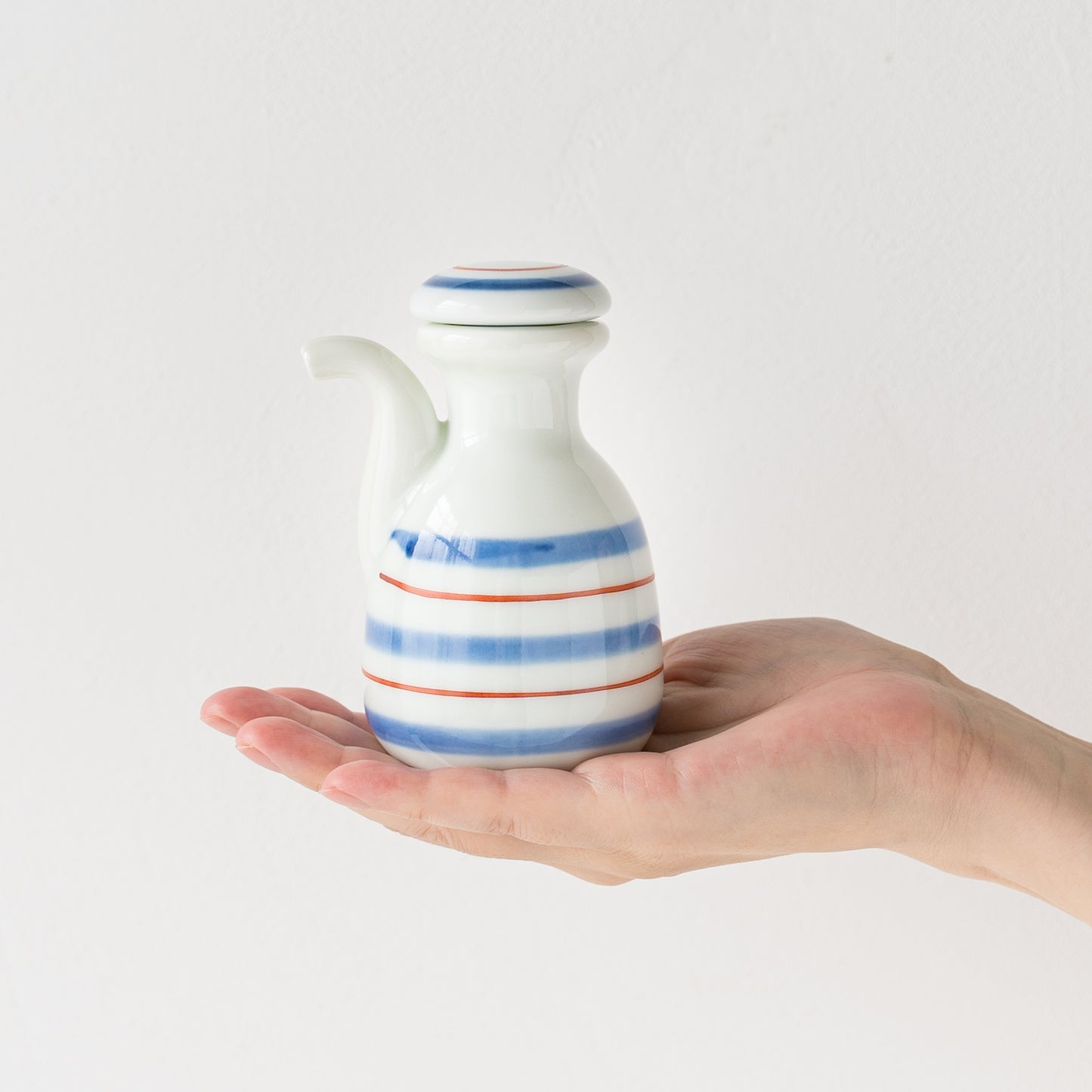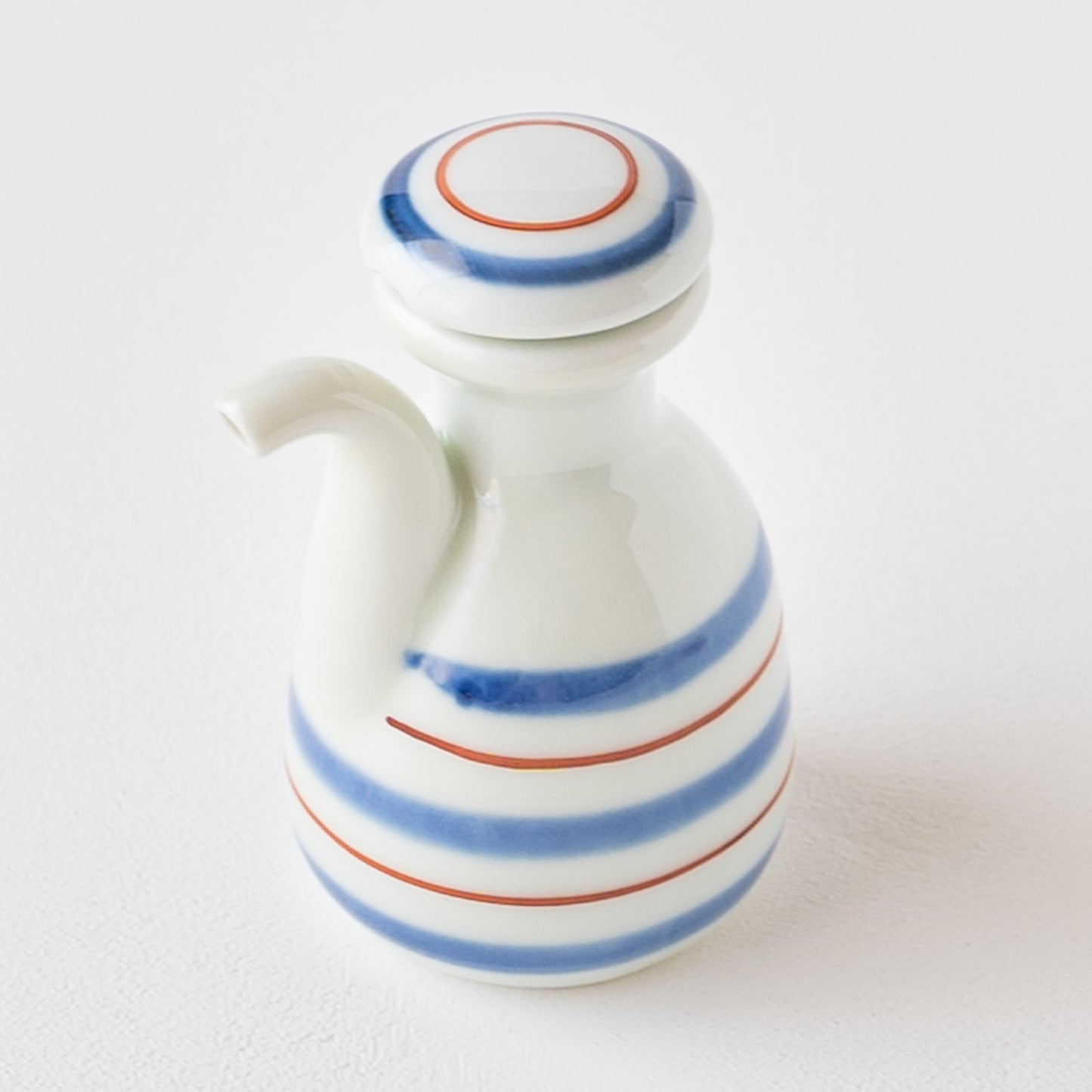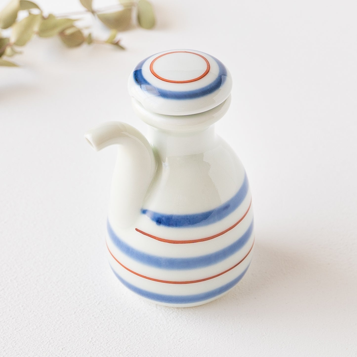 呉須と赤絵の線がきれいな線巻模様。淡くやさしい呉須にはっきりした赤絵の線が引かれていてなんとも素敵な佇まいです。絵付けはすべて手描きなので、ひとつひとつ違った表情に趣きがあって眺めているだけで心が和みます。