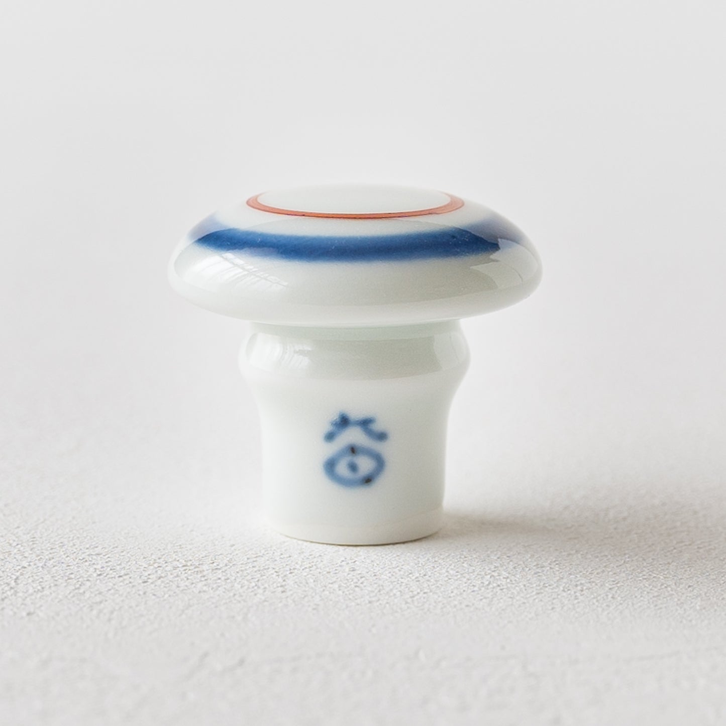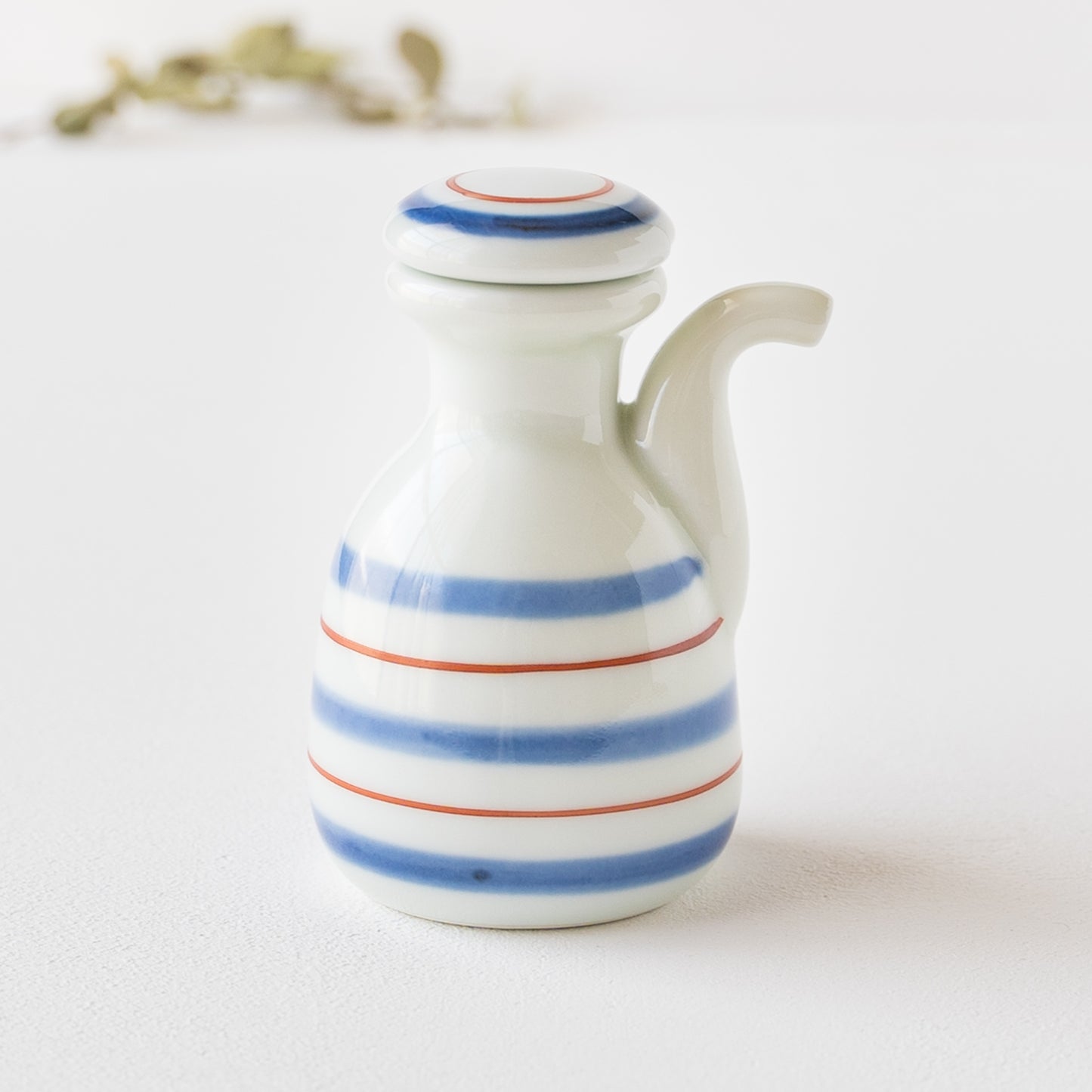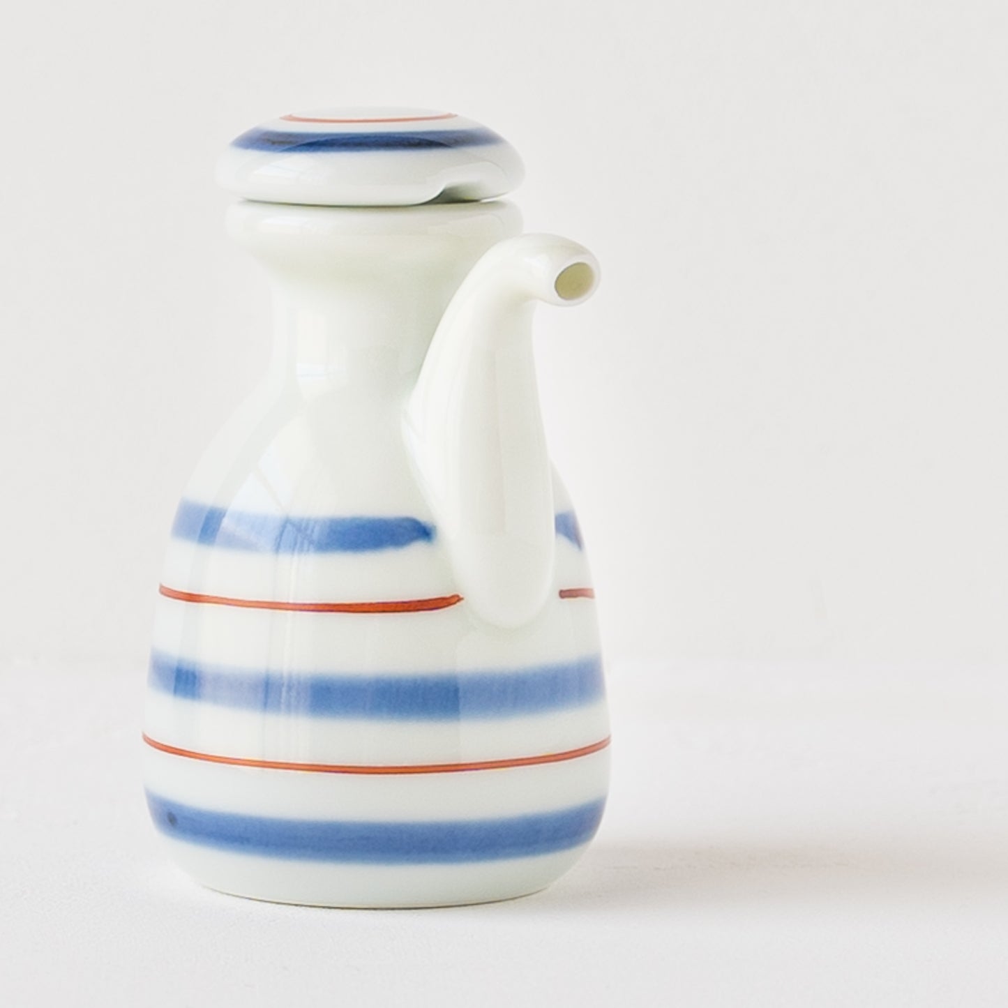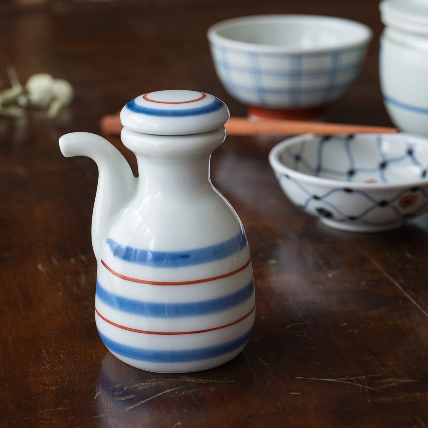 呉須と赤絵の線がきれいな線巻模様。淡くやさしい呉須にはっきりした赤絵の線が引かれていてなんとも素敵な佇まいです。絵付けはすべて手描きなので、ひとつひとつ違った表情に趣きがあって眺めているだけで心が和みます。