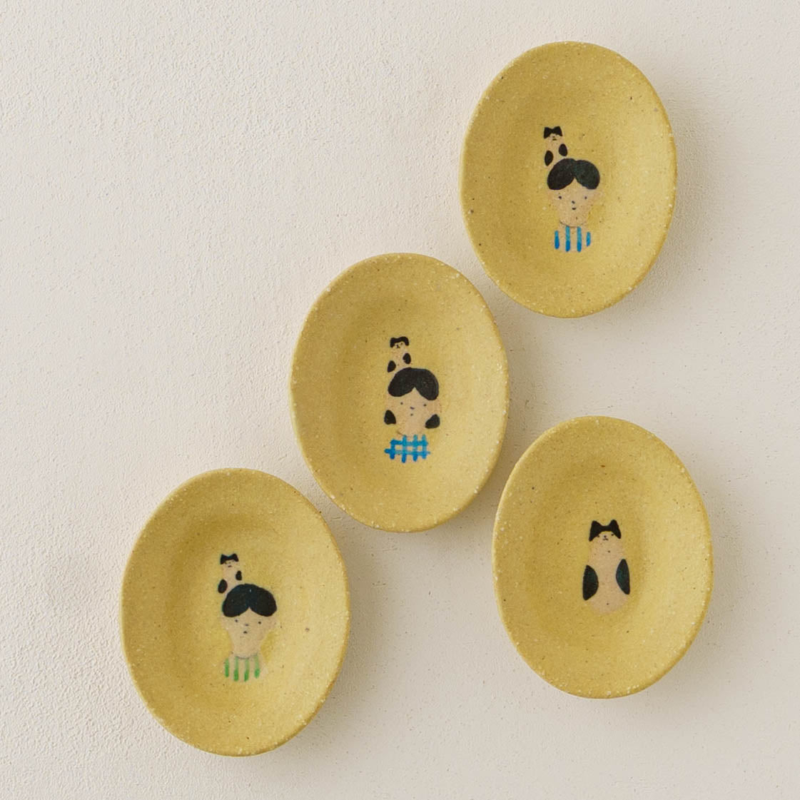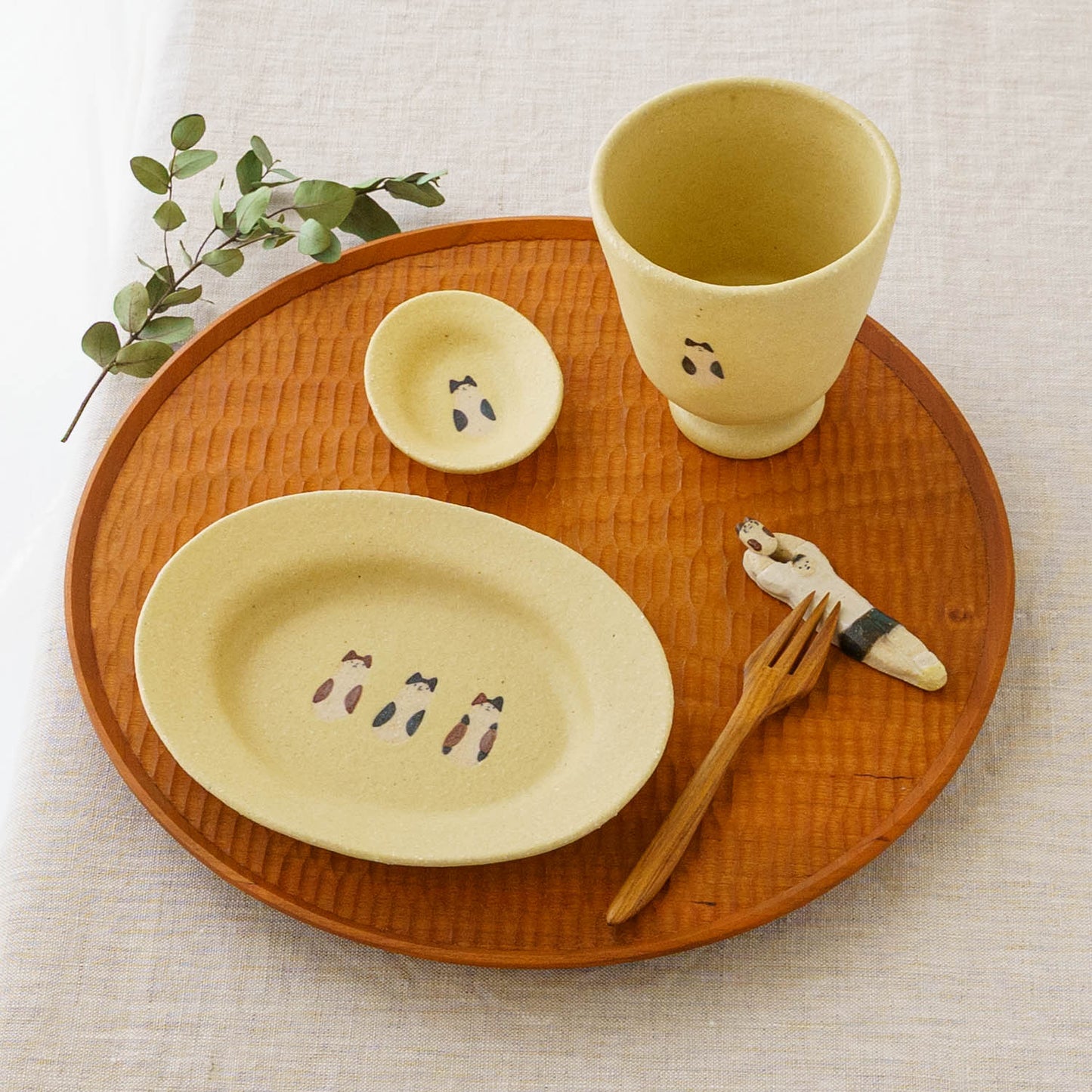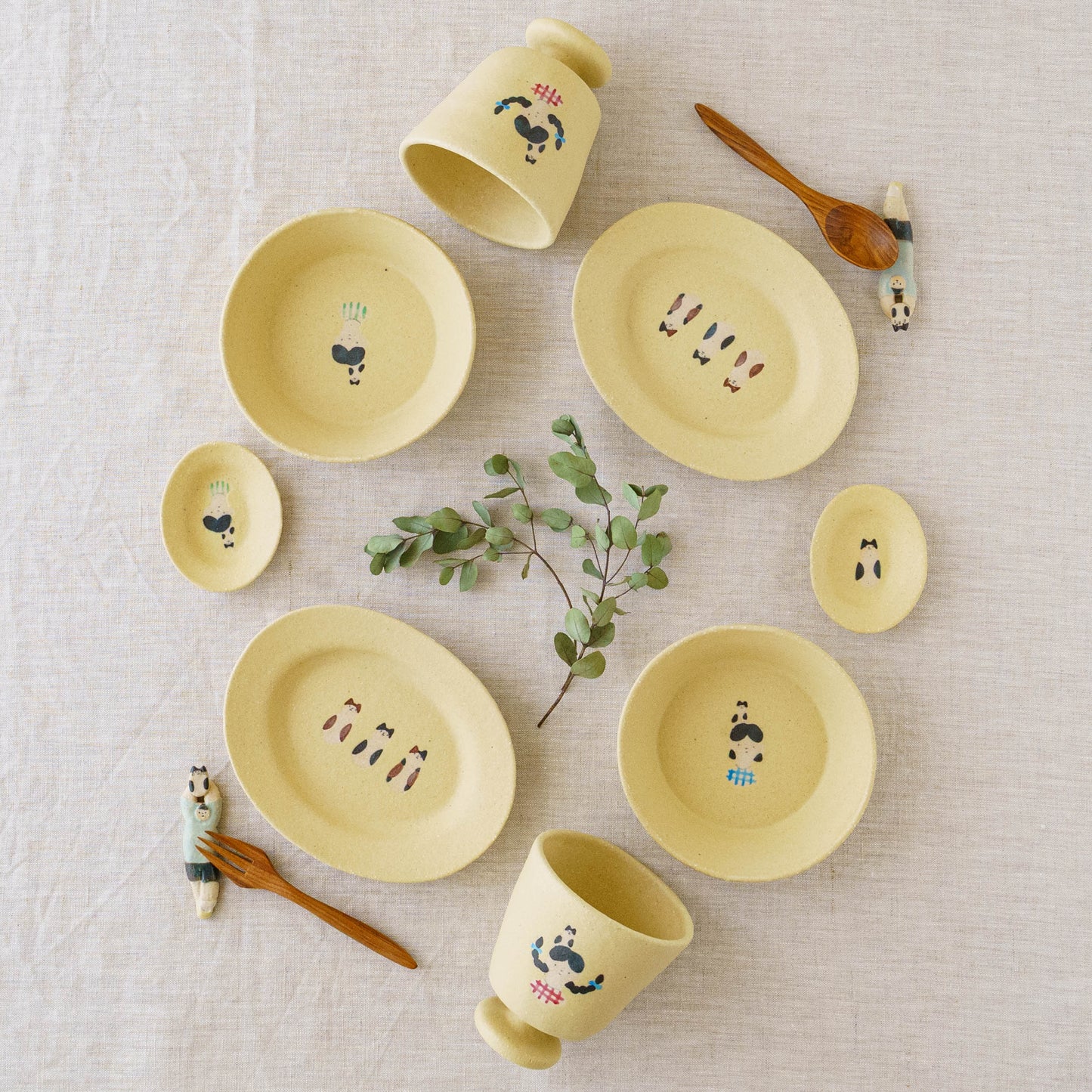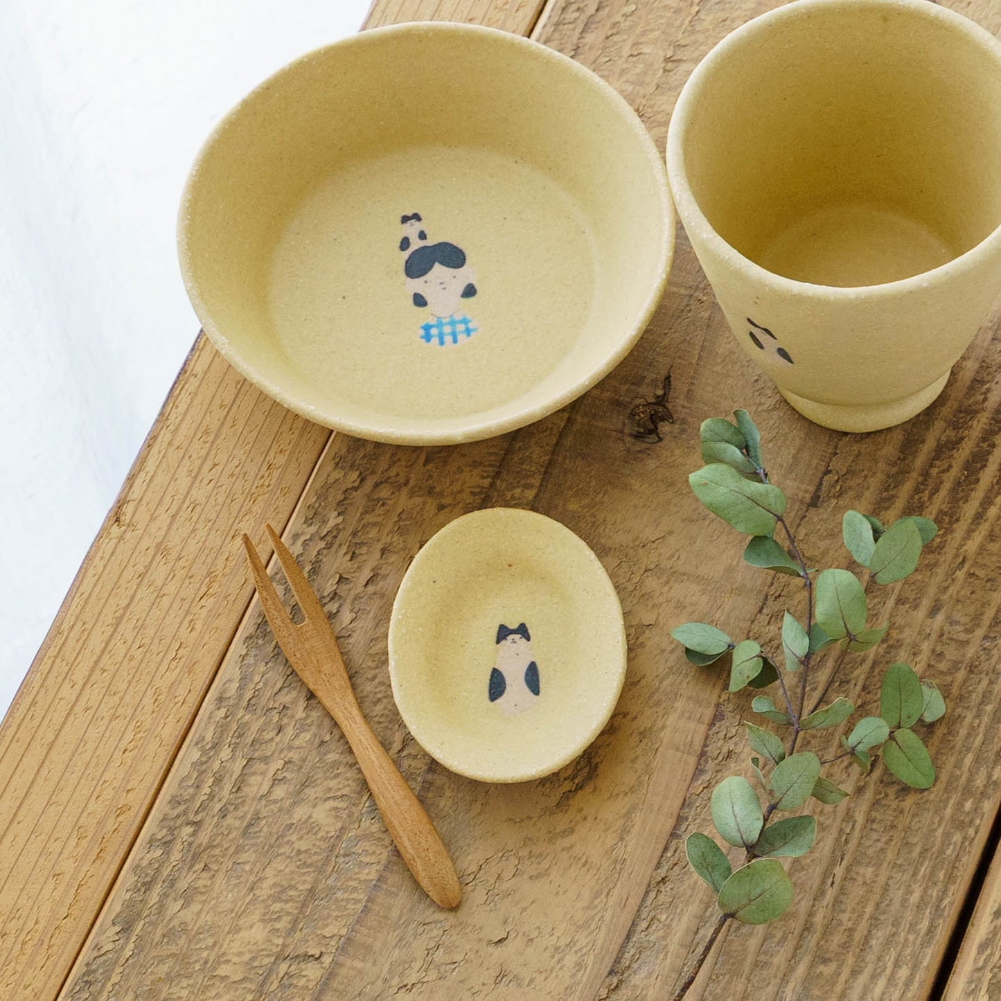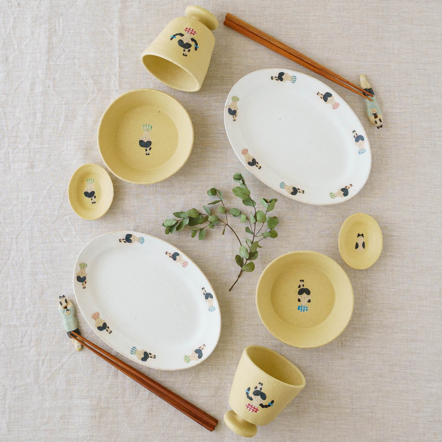 やわらかな色合いとマットな質感が心地よくマッチした愛らしいモチーフたち。食卓に並べていると男の子や女の子、ねこやいぬが動いているようで明るく楽しい気持ちにしてくれます。