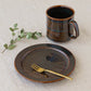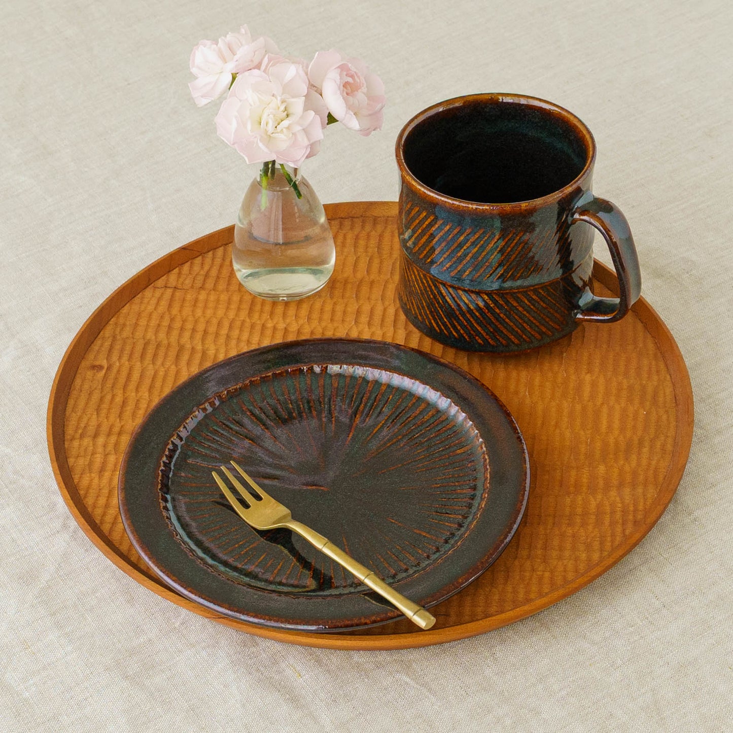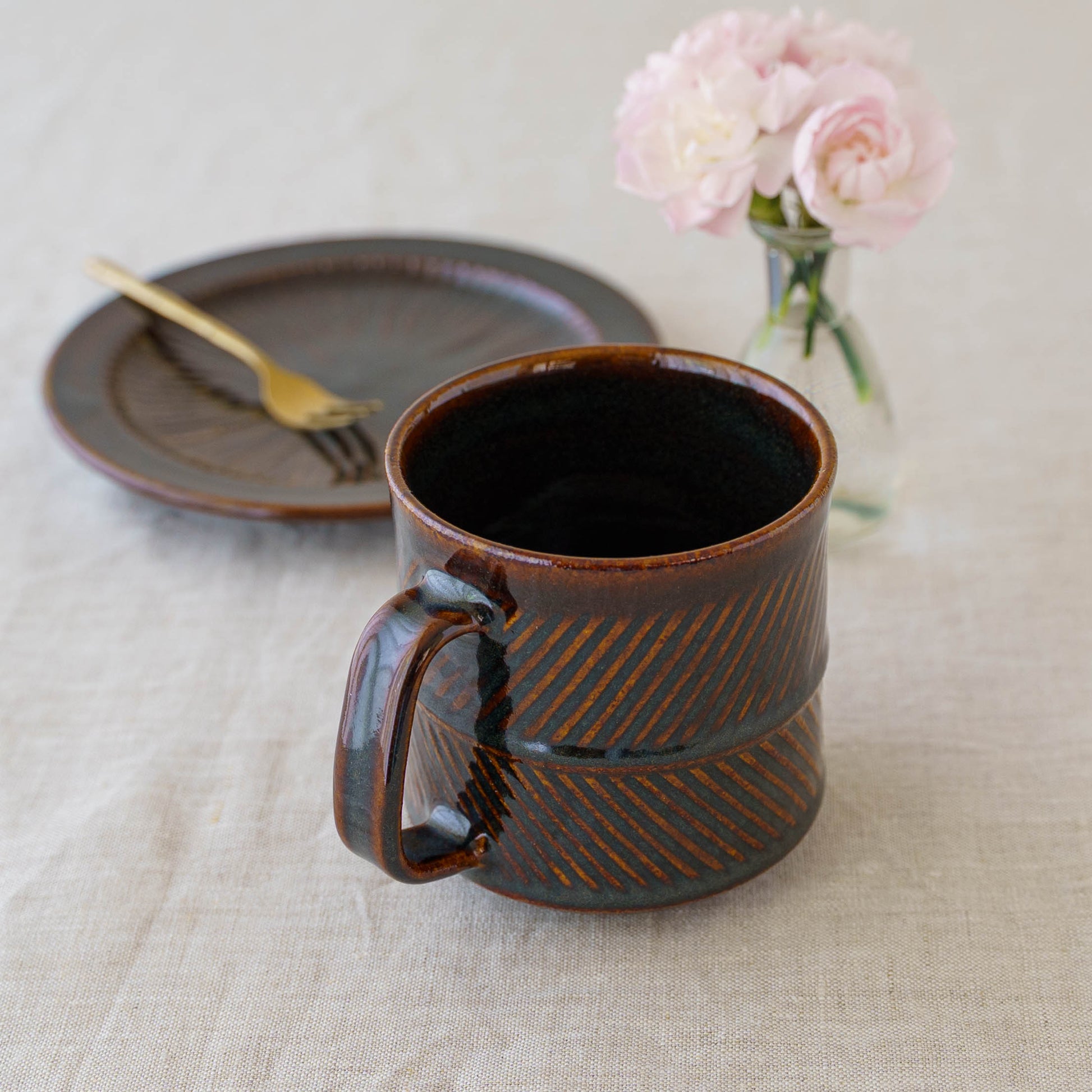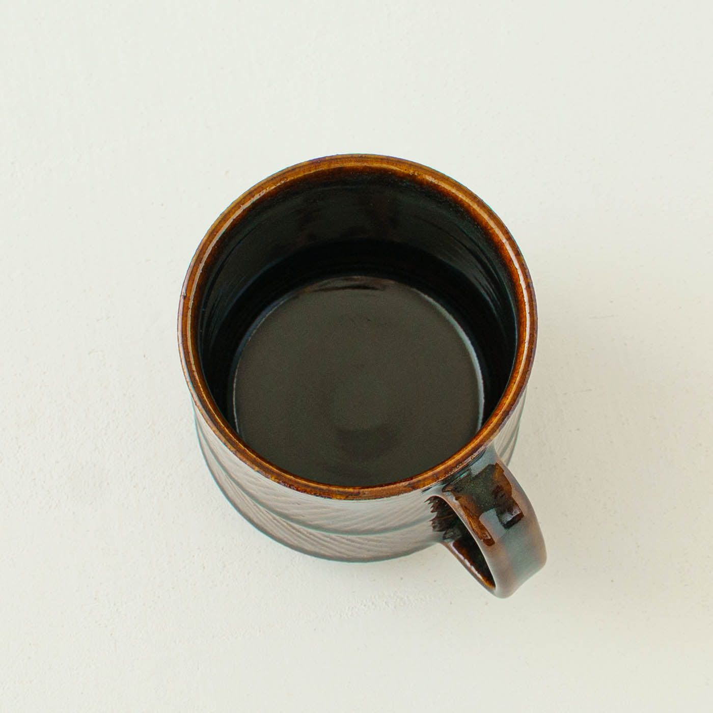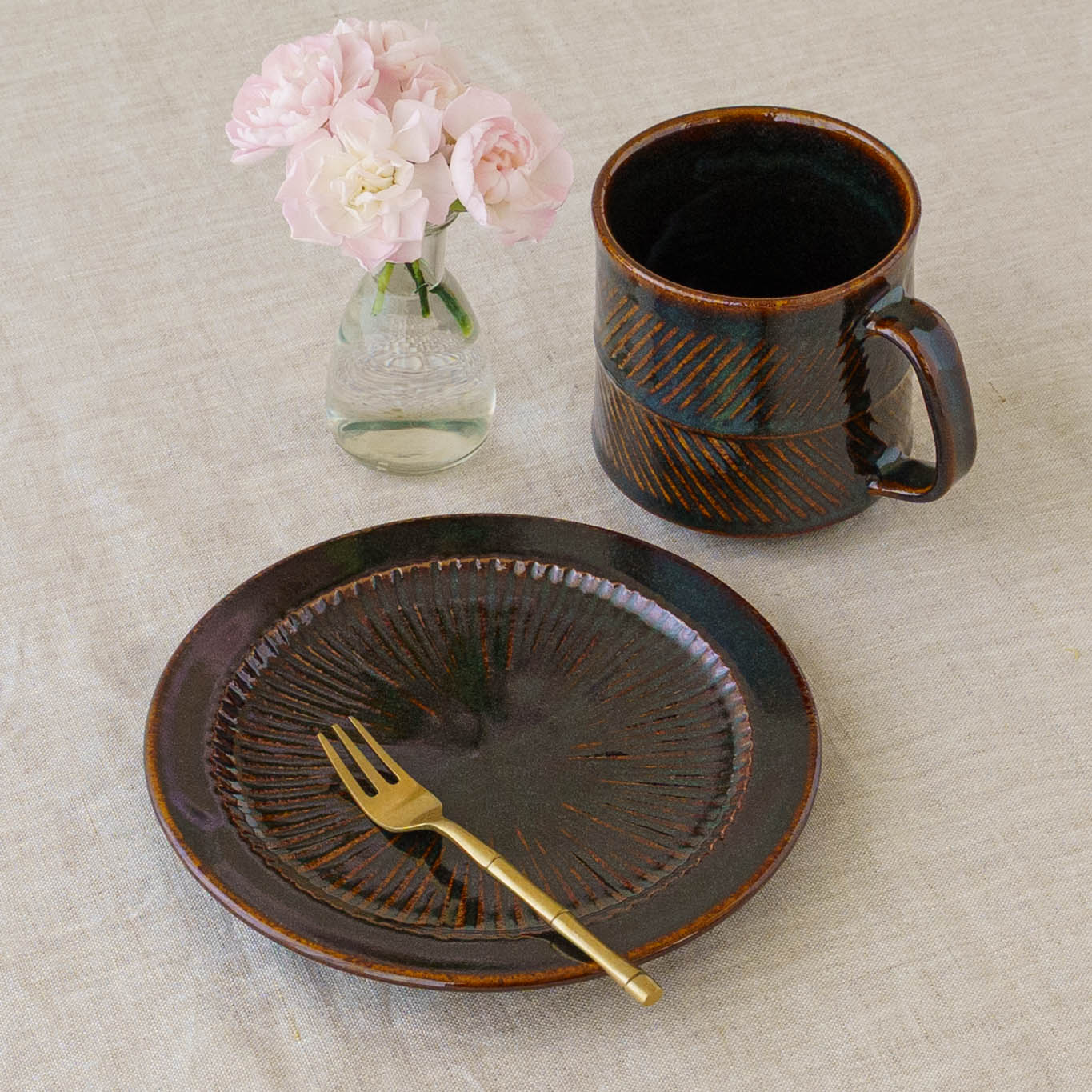 こっくり濃いめの飴釉は上品でシックな風合い。益子の土でつくられた陶器のうつわならではの、土のあたたかさと鎬(しのぎ)の凹凸に溶け込むように流れ込んだ釉薬の濃淡が、表情の奥行きと豊かさを生み出しています。