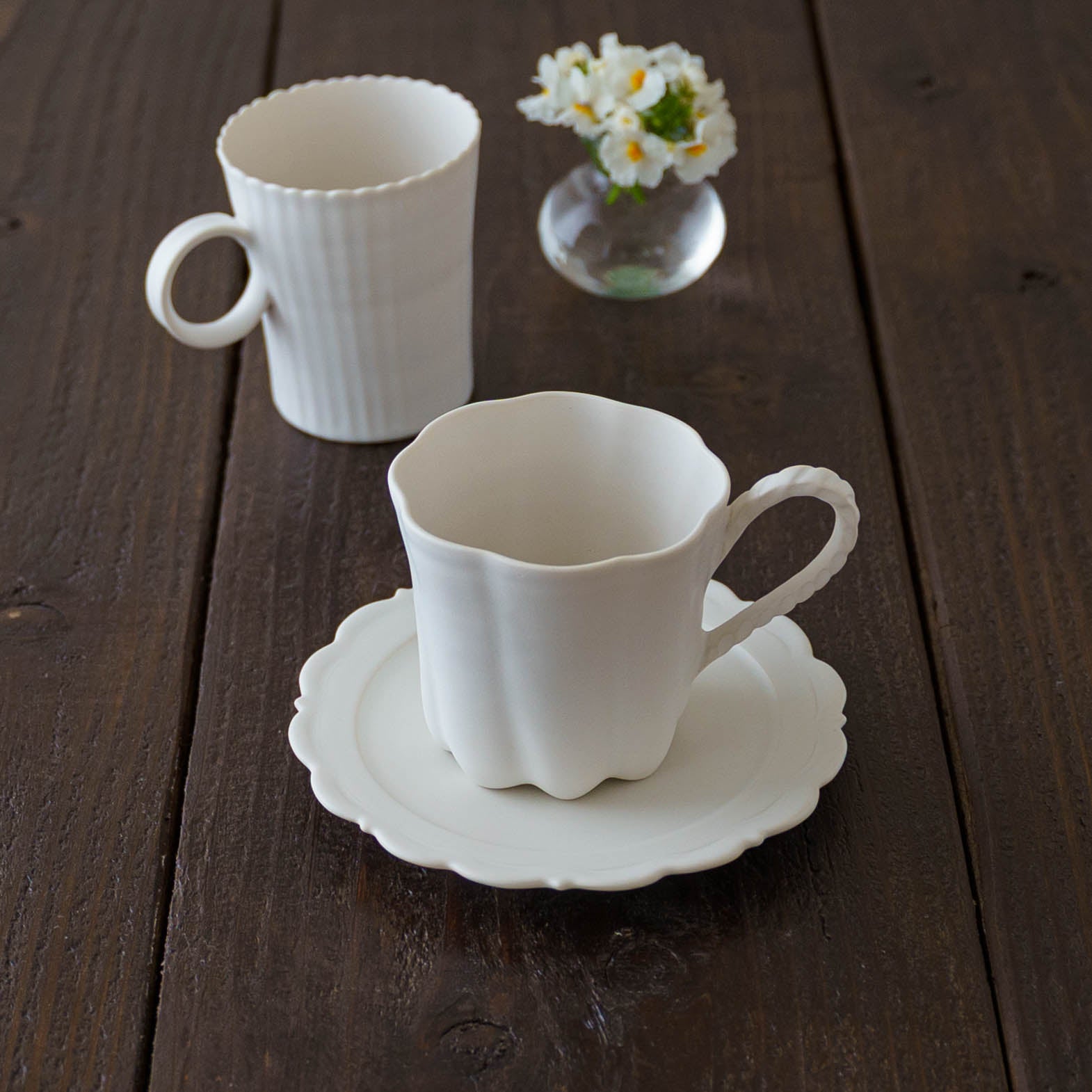 可憐なお花やお菓子をモチーフに、和と洋がやさしく溶け合う雰囲気をまとった白磁。型を使わず、すべてろくろで成形されるフォルムは、滑らかで美しい曲線が上質なぬくもりを感じさせてくれます。