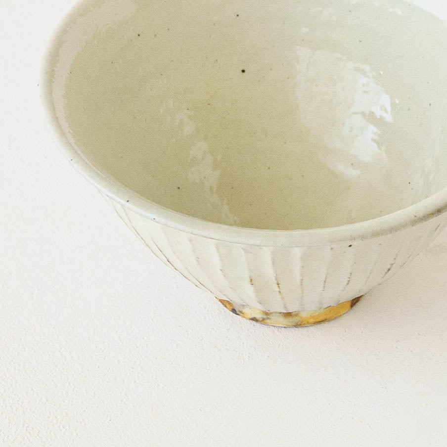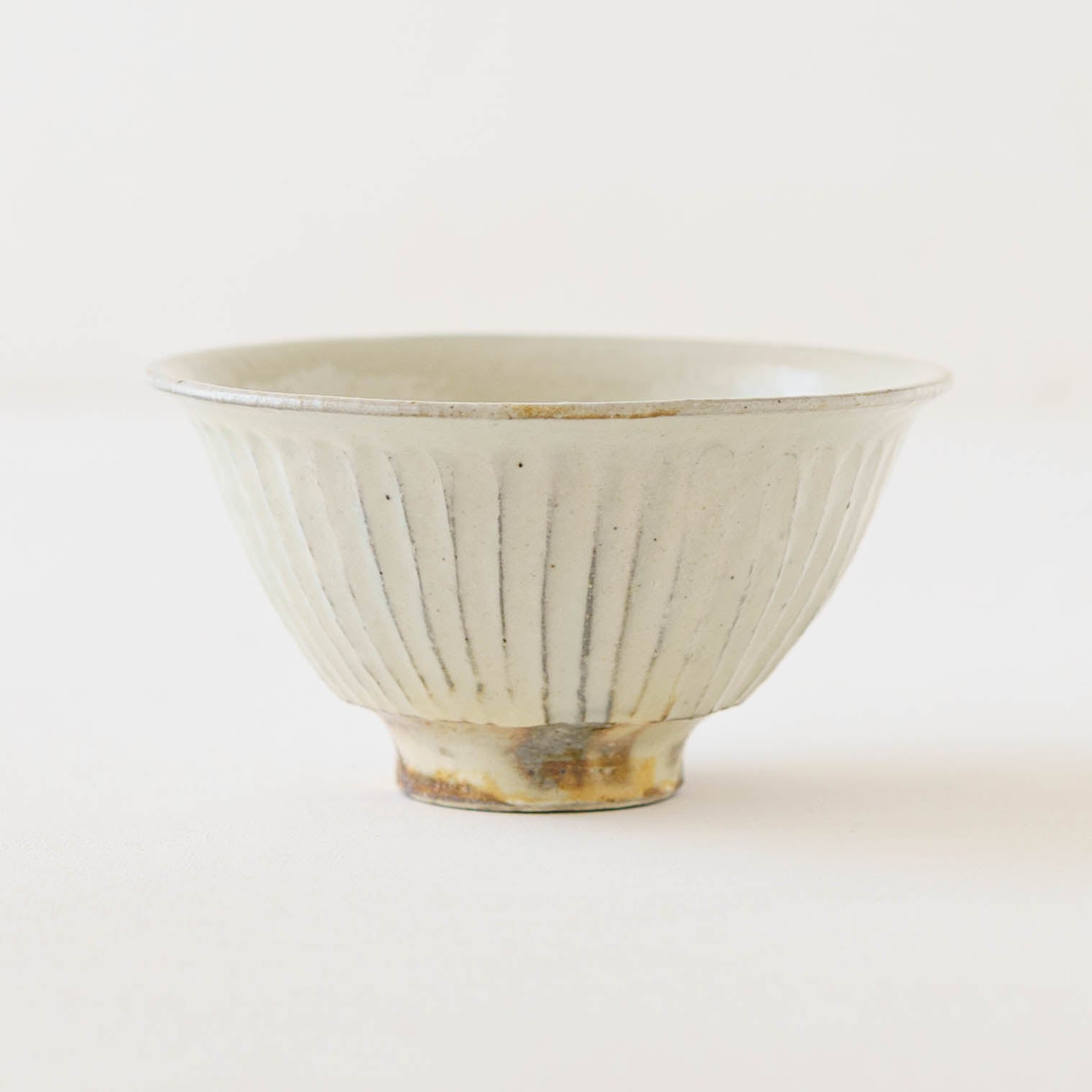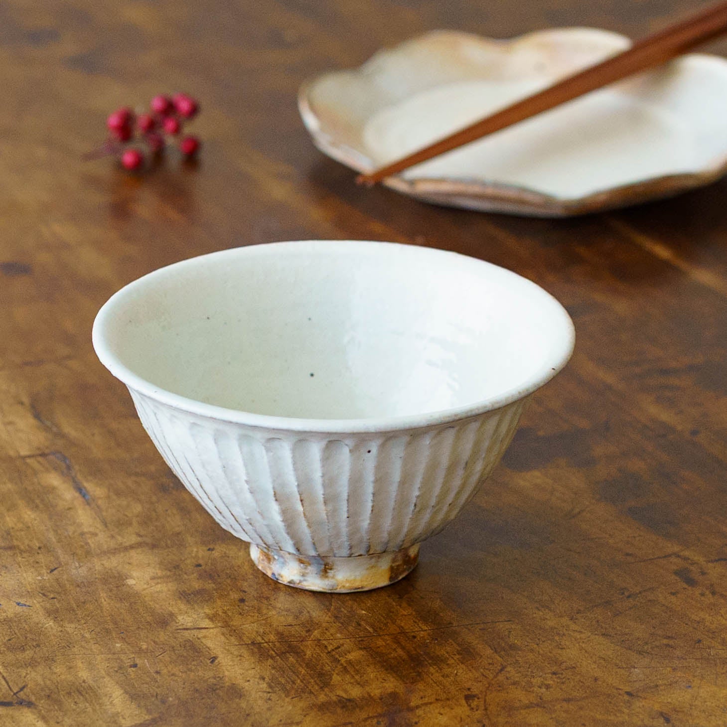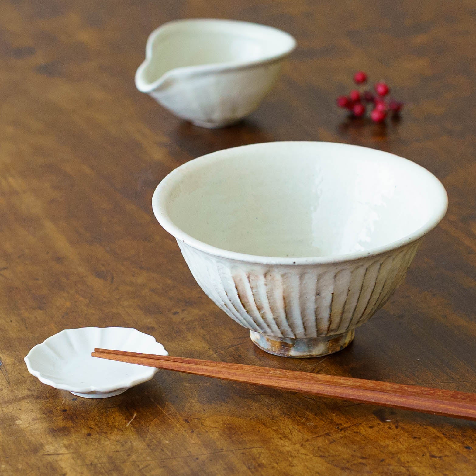 素朴であたたかみのある白い粉引にたて鉄線とうっすらと表れた御本の赤みがなんとも言えない風合いをもたらしています。一本一本丁寧に入れられた彫り。素朴であたたかみがあり、ほかほかご飯をもっと美味しくしてくれます。