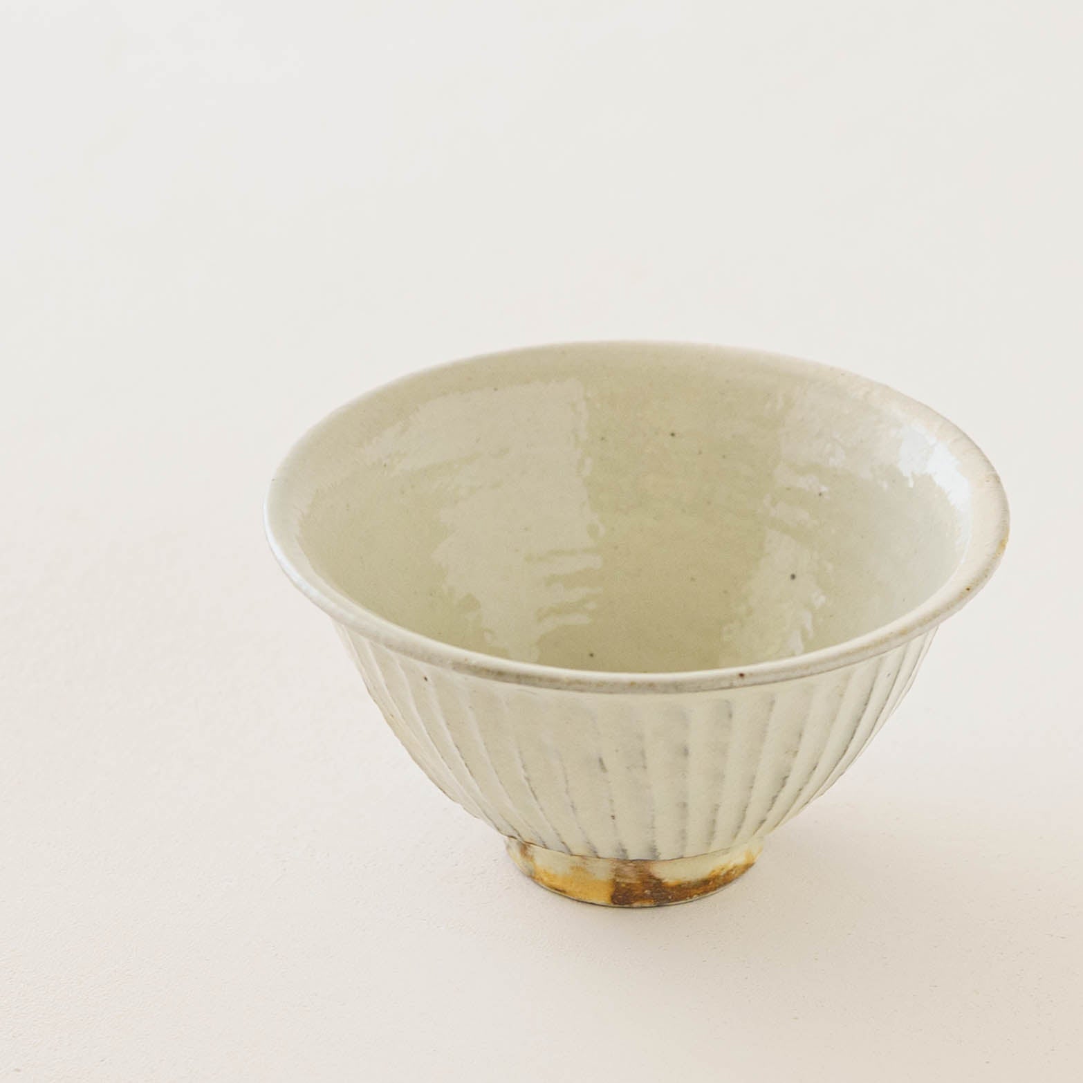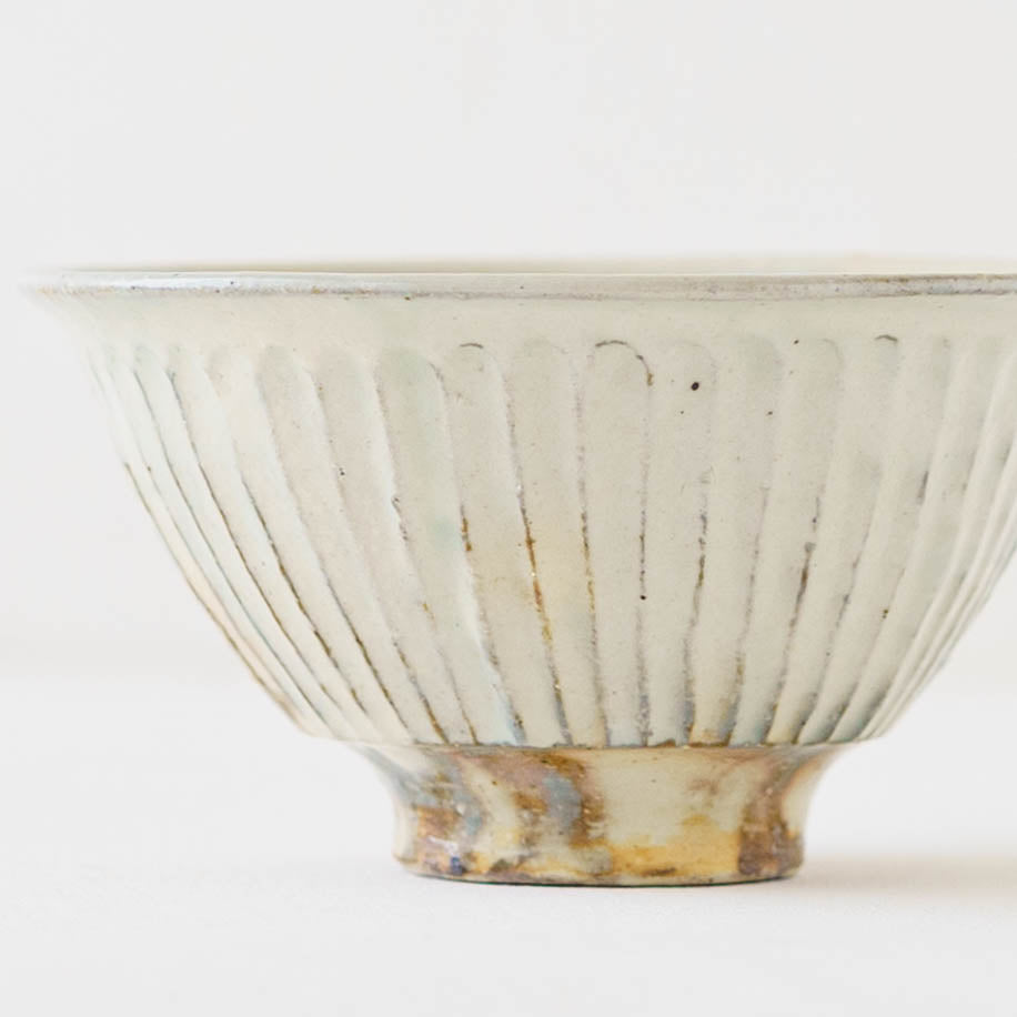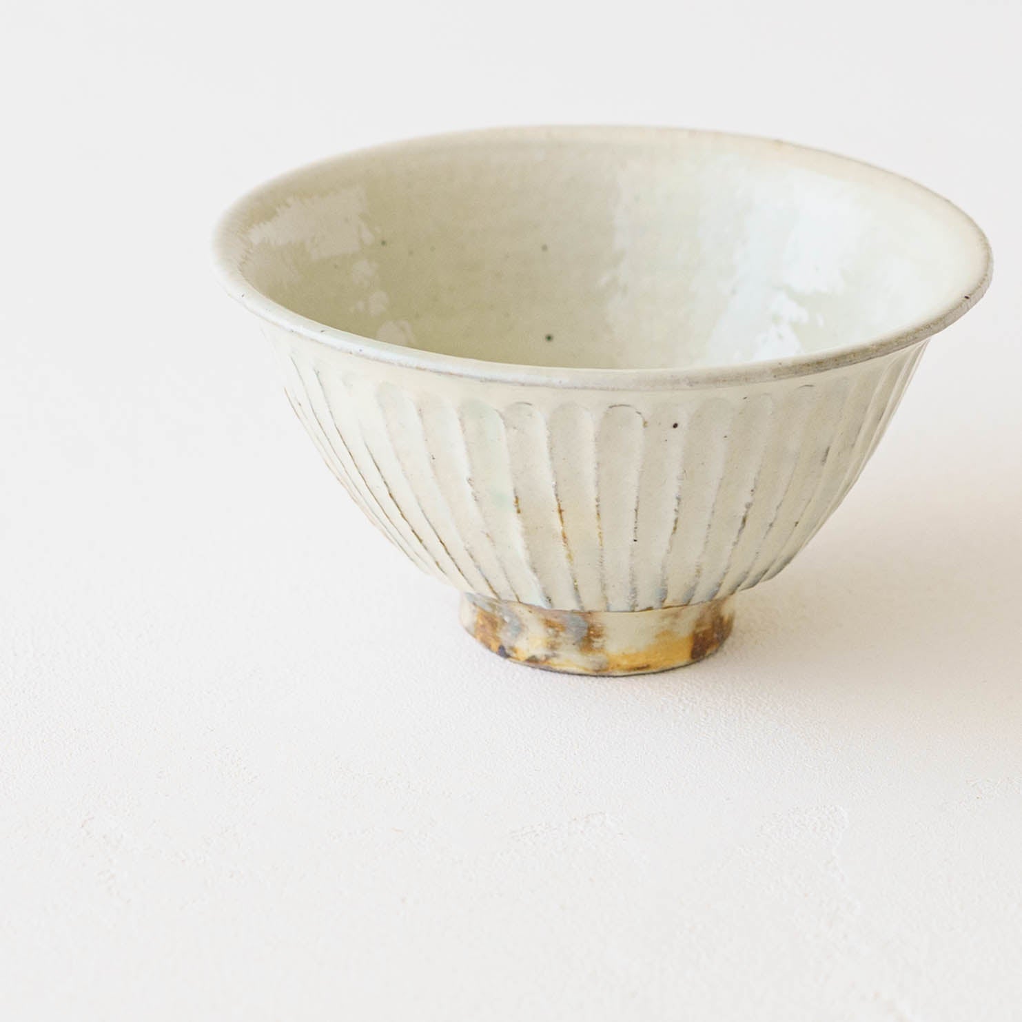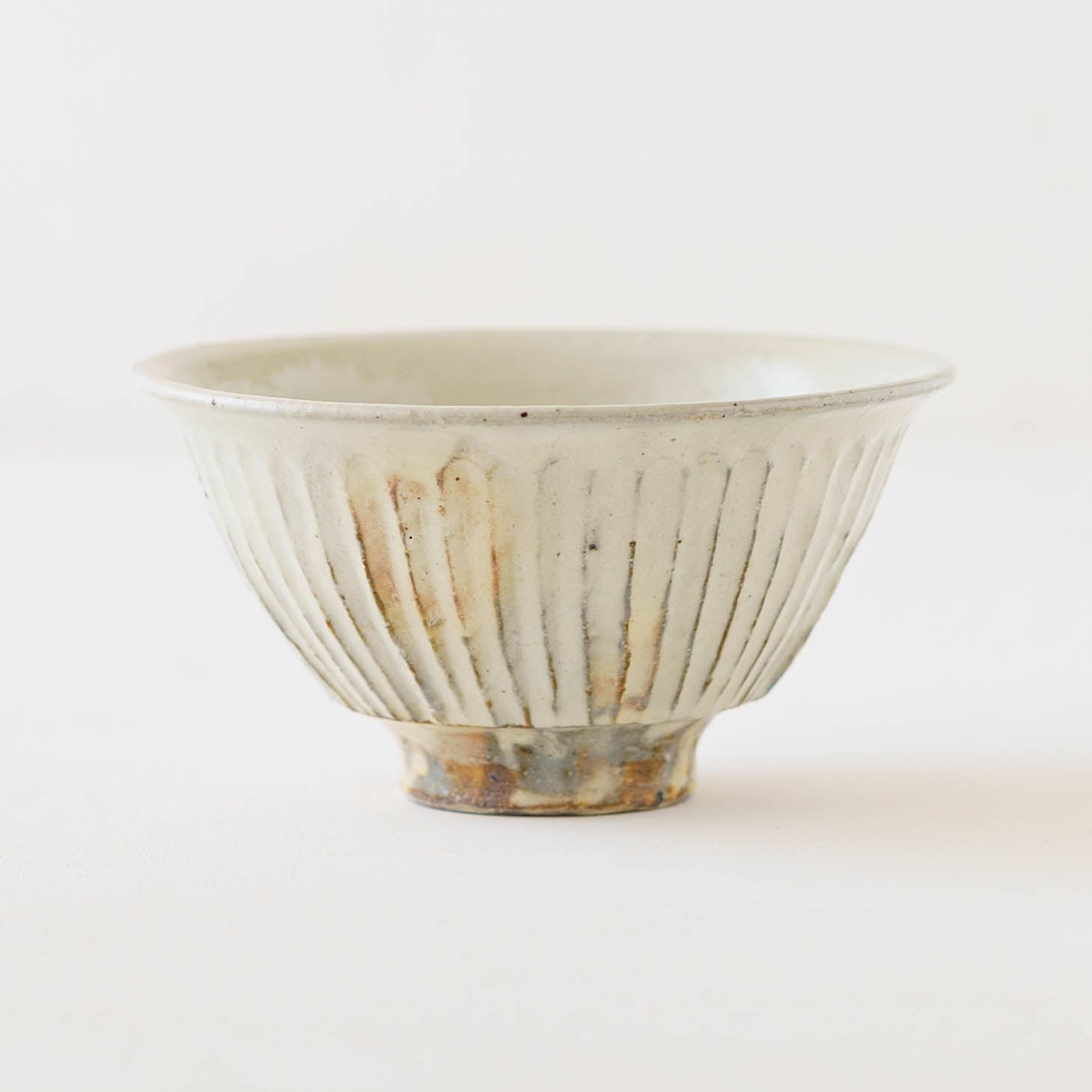 素朴であたたかみのある白い粉引にたて鉄線とうっすらと表れた御本の赤みがなんとも言えない風合いをもたらしています。一本一本丁寧に入れられた彫り。素朴であたたかみがあり、ほかほかご飯をもっと美味しくしてくれます。