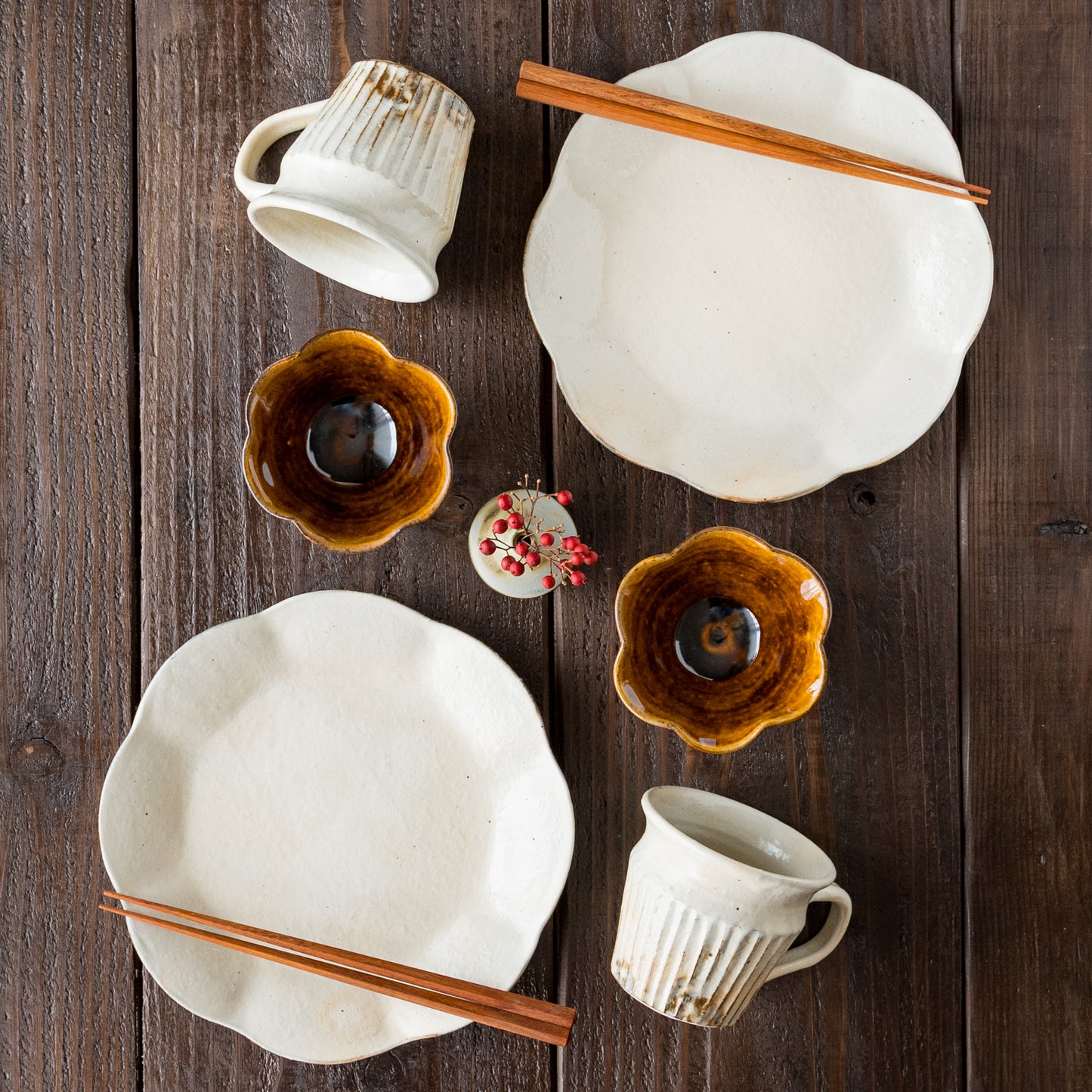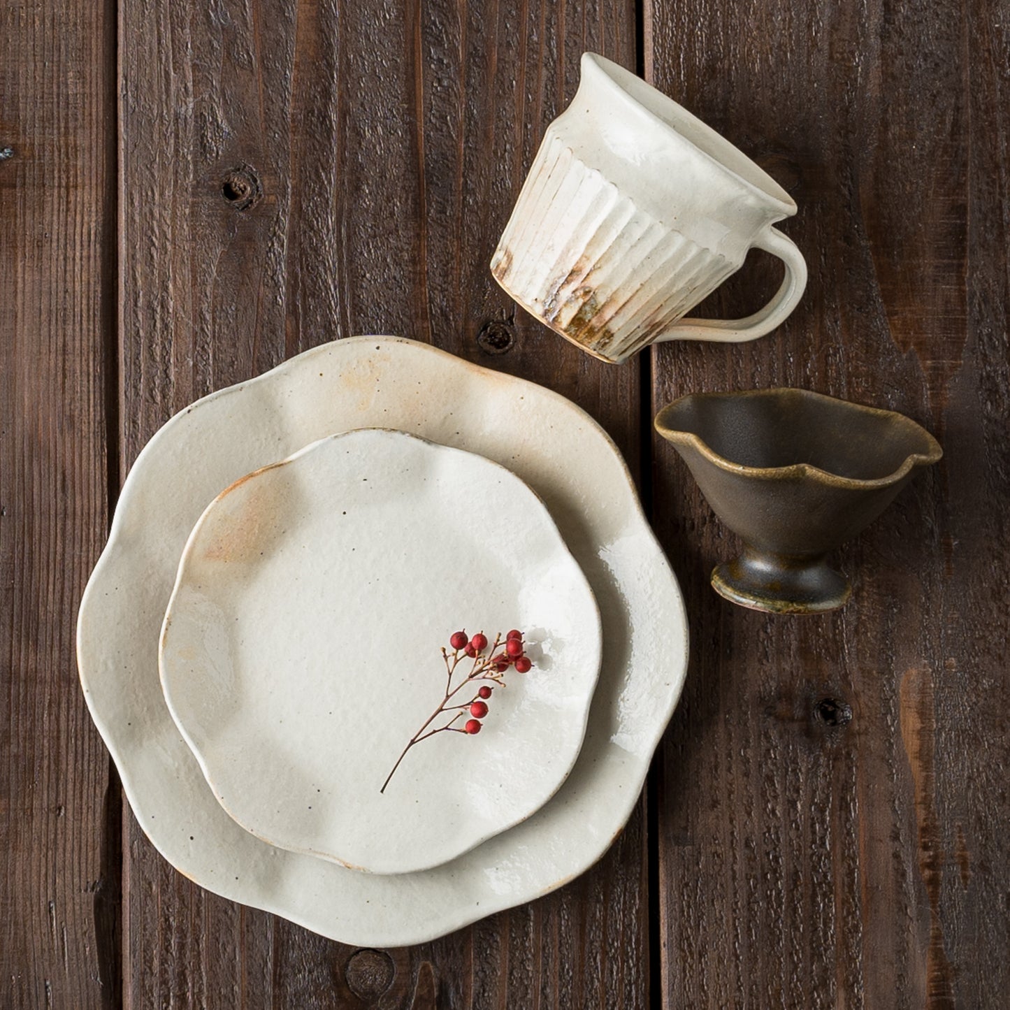 土に含まれる鉄分が焼成時に酸化し、黒点(鉄粉)としてうつわの表面に表れます。散りばめられた鉄分の黒点がより一層味わい深いものにしてくれています。