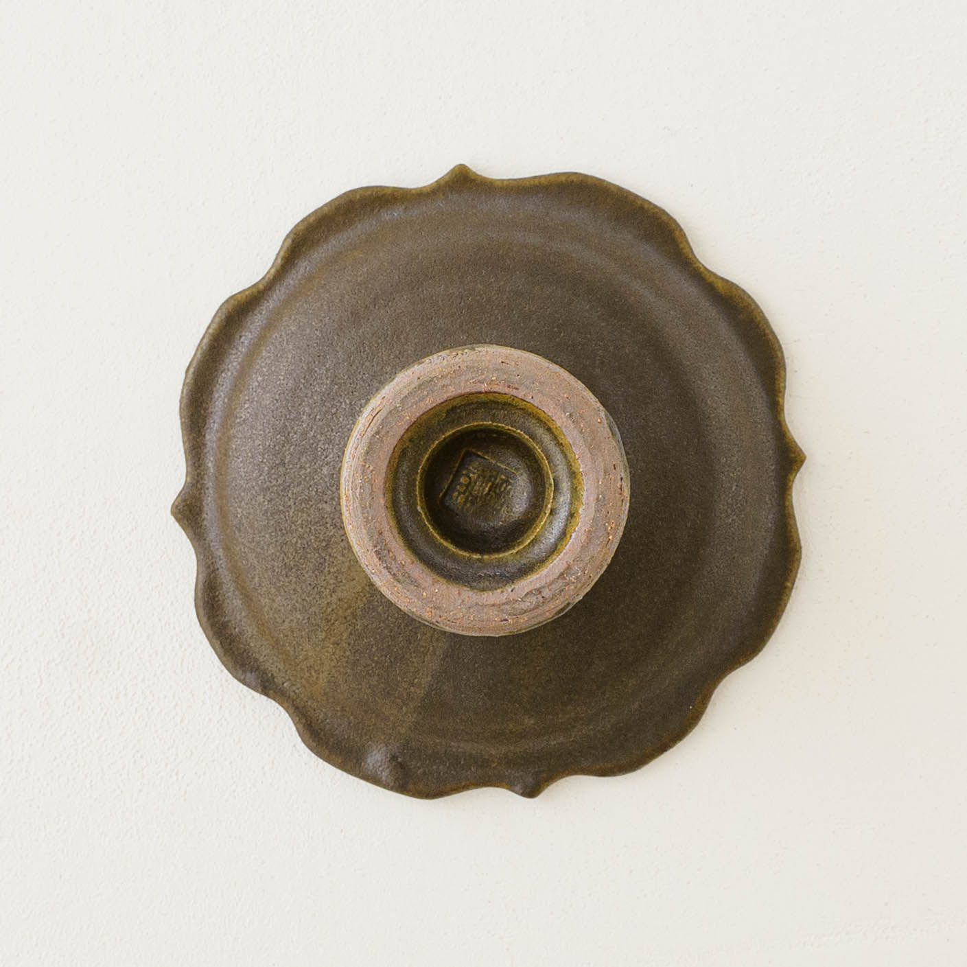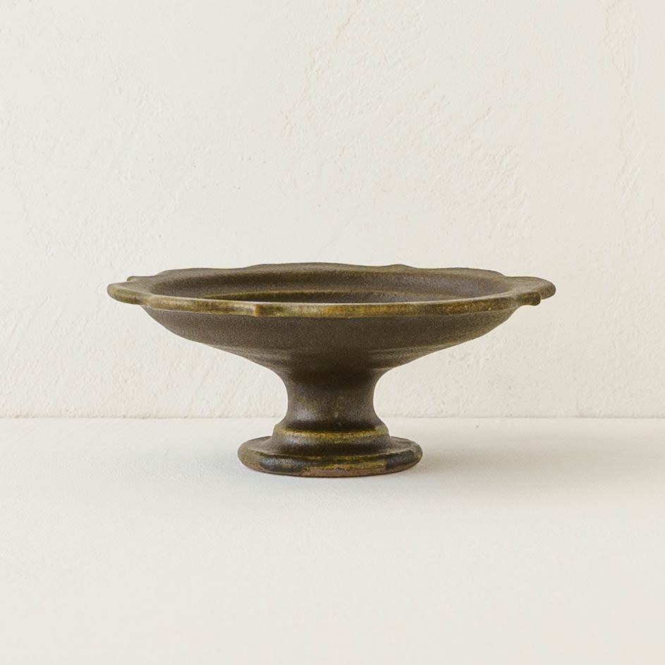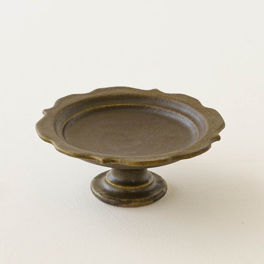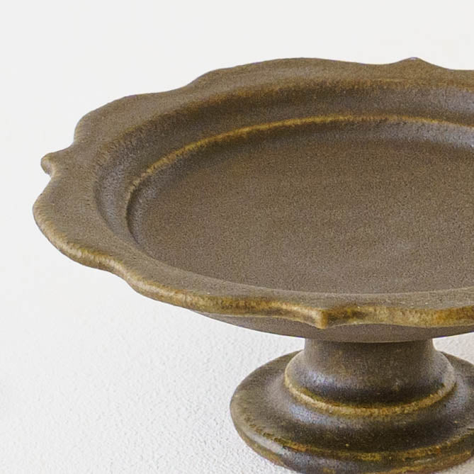 アンティークな風合いの錆色の釉薬を施したサビ釉の彫刻コンポート皿。触り心地の良いしっとりとやさしいマットな質感が食卓に品をもたらしてくれます。