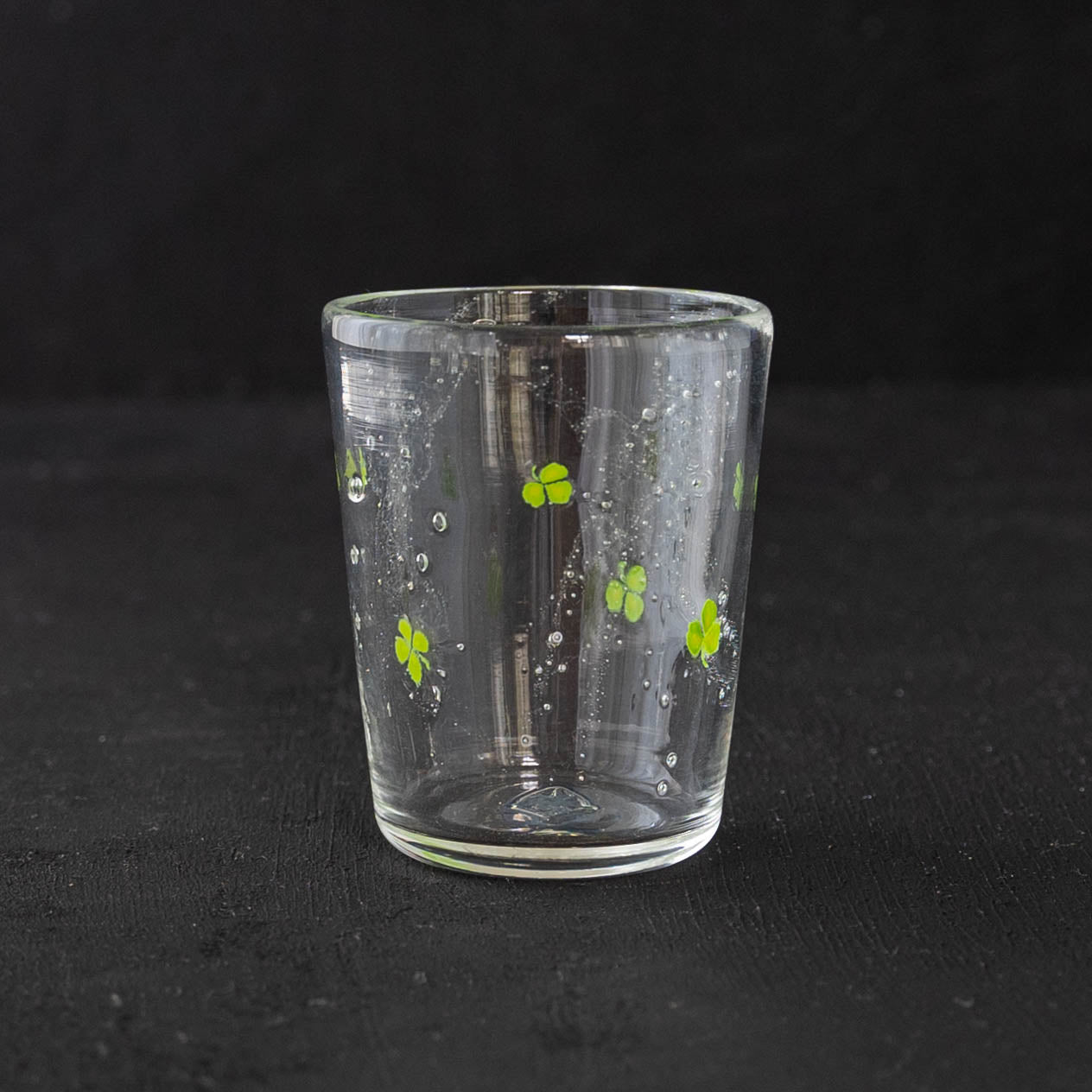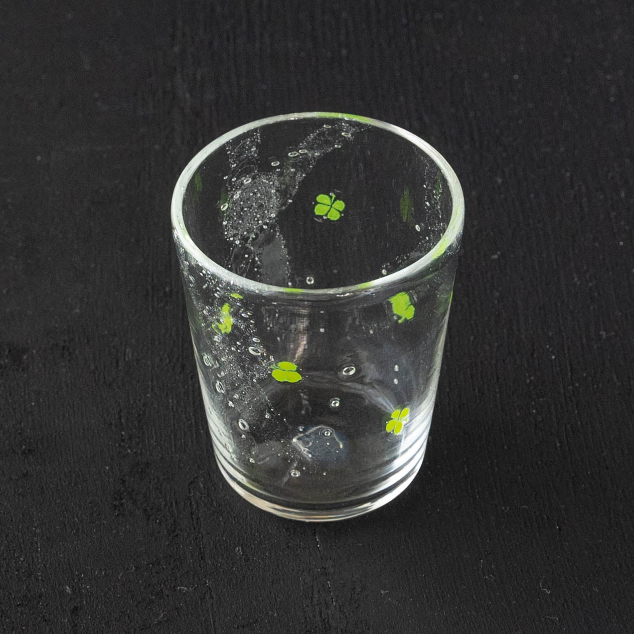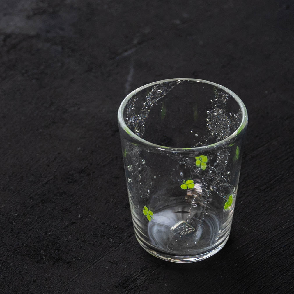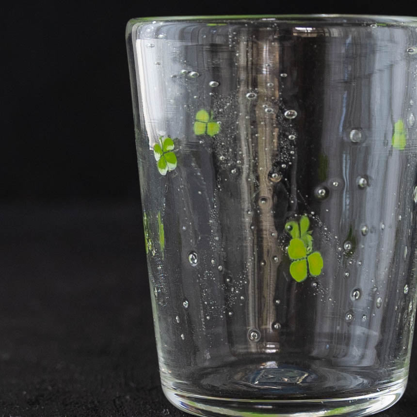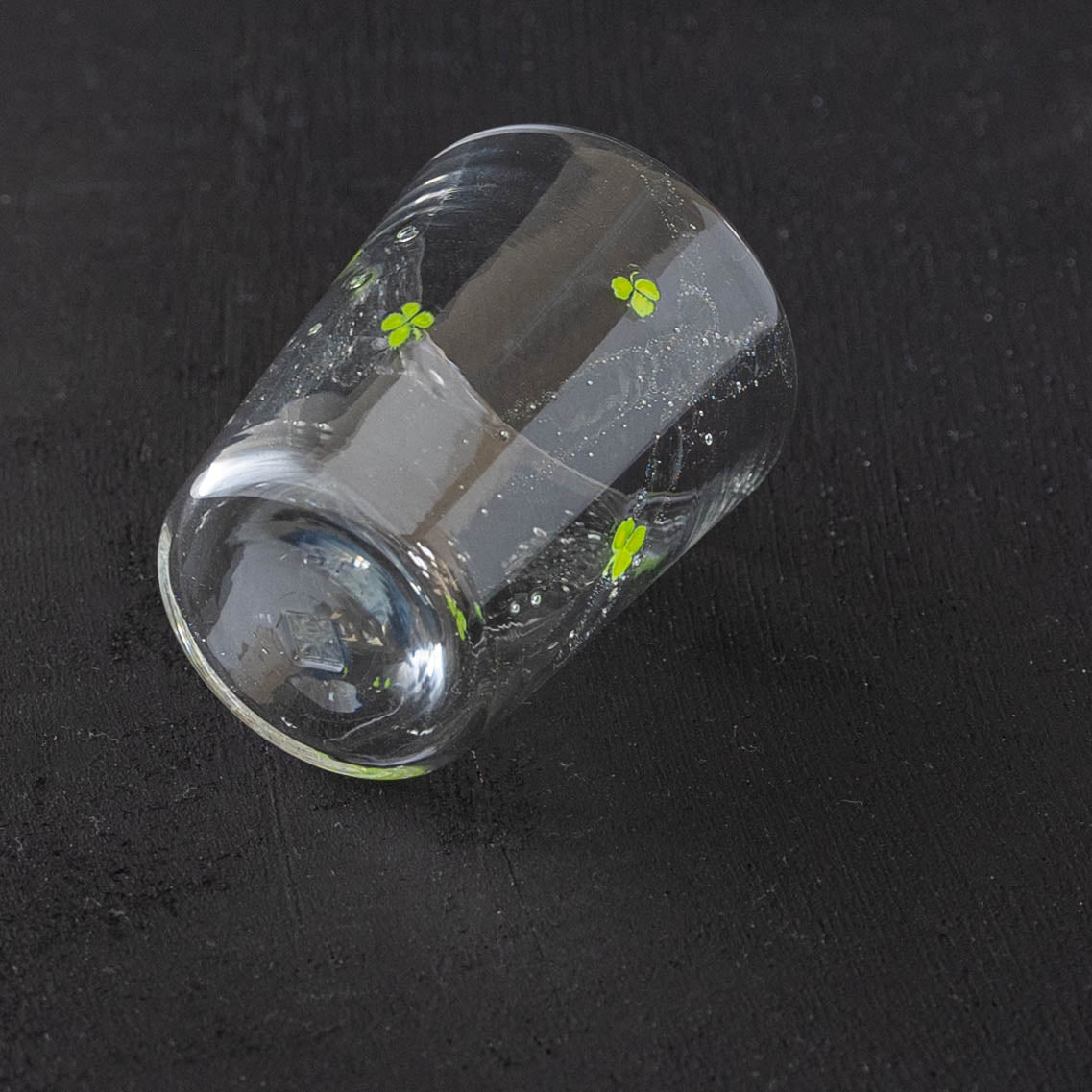 かわいらしいクローバー柄は絵付けではなく、別に小さな緑のガラスを用いてクローバーをつくり、ガラスの表面に埋め込んでいます。光が当たるとクローバーグリーンがキラキラと輝いて見惚れてしまいます。