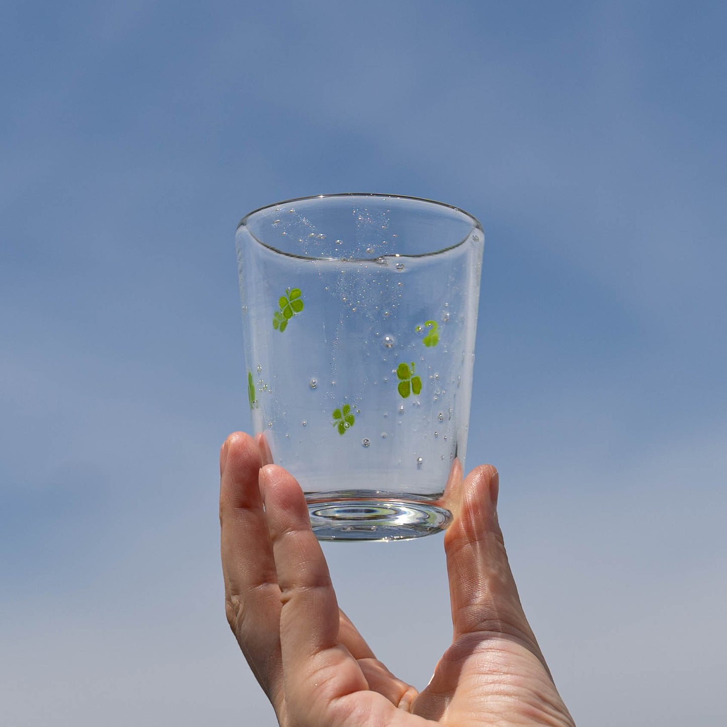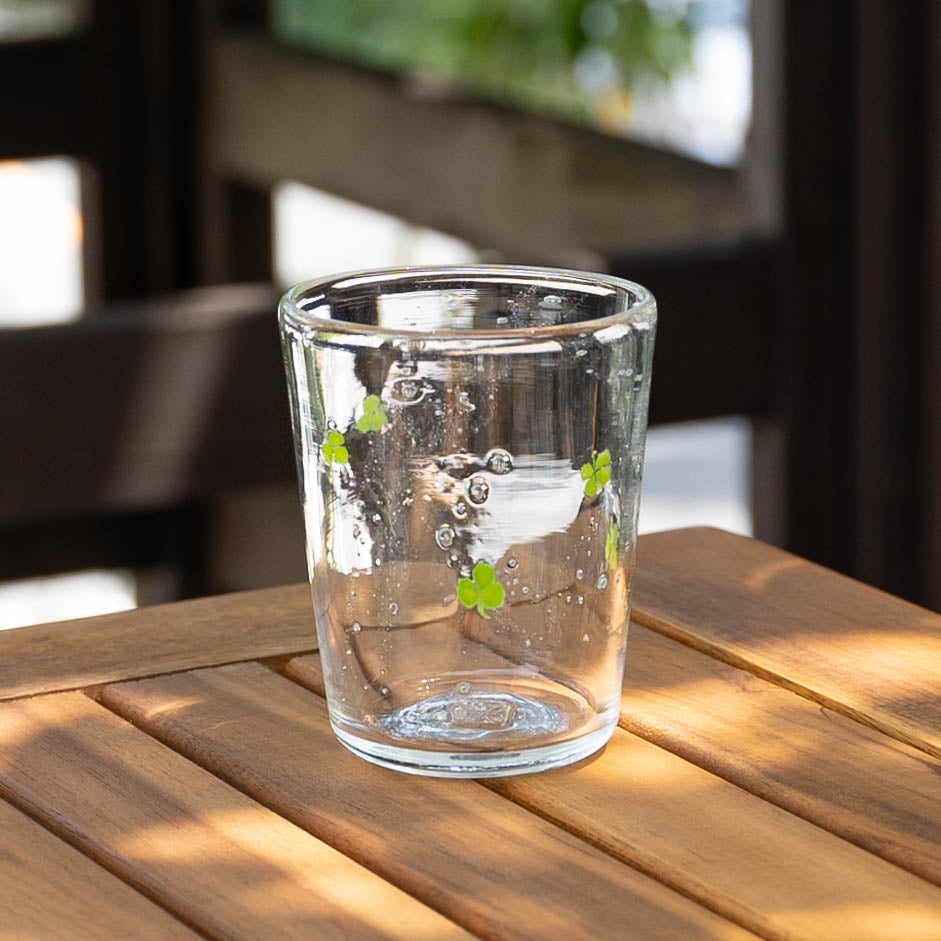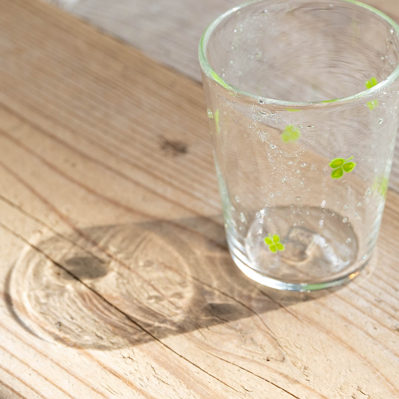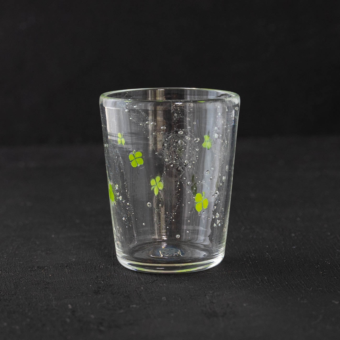 かわいらしいクローバー柄は絵付けではなく、別に小さな緑のガラスを用いてクローバーをつくり、ガラスの表面に埋め込んでいます。光が当たるとクローバーグリーンがキラキラと輝いて見惚れてしまいます。