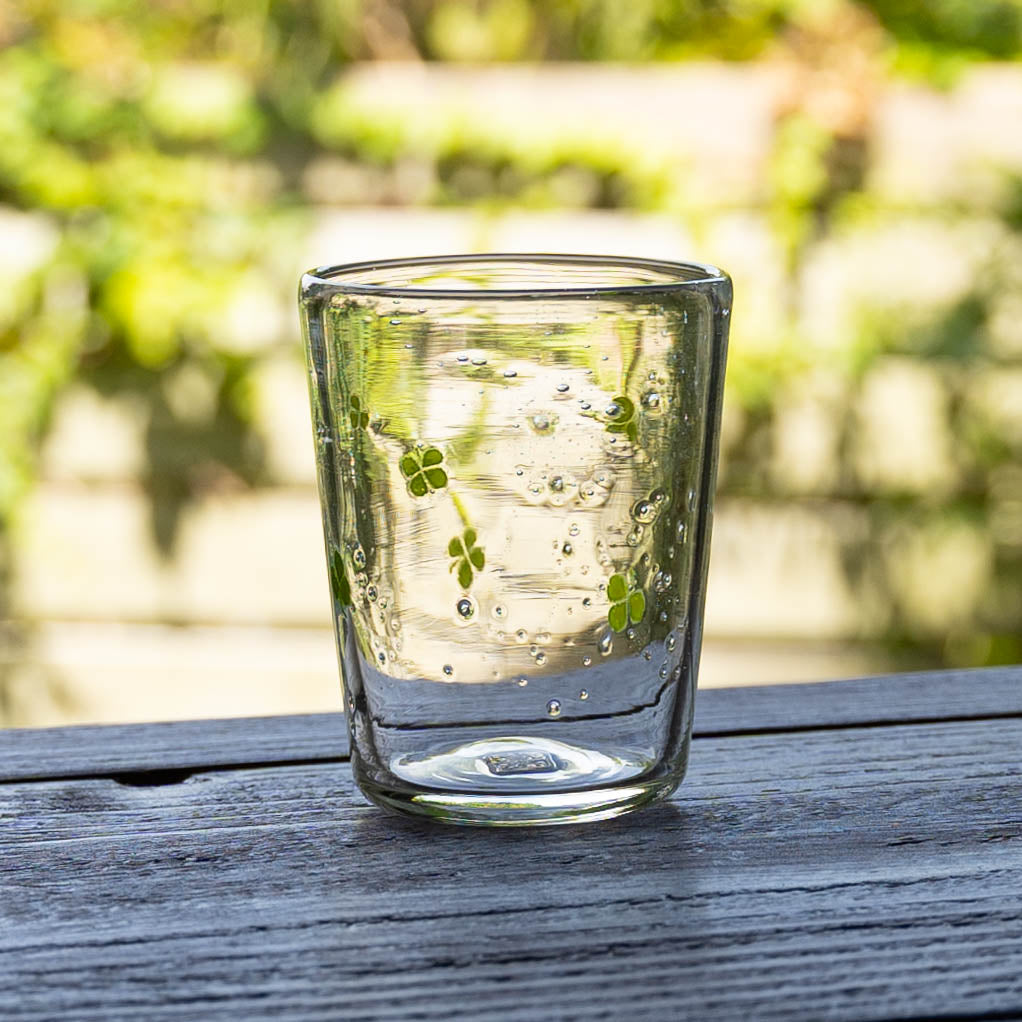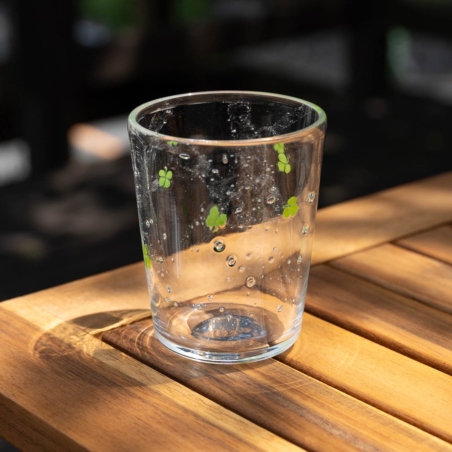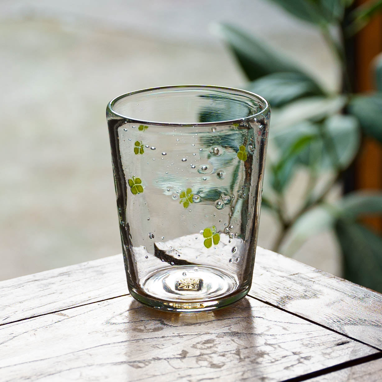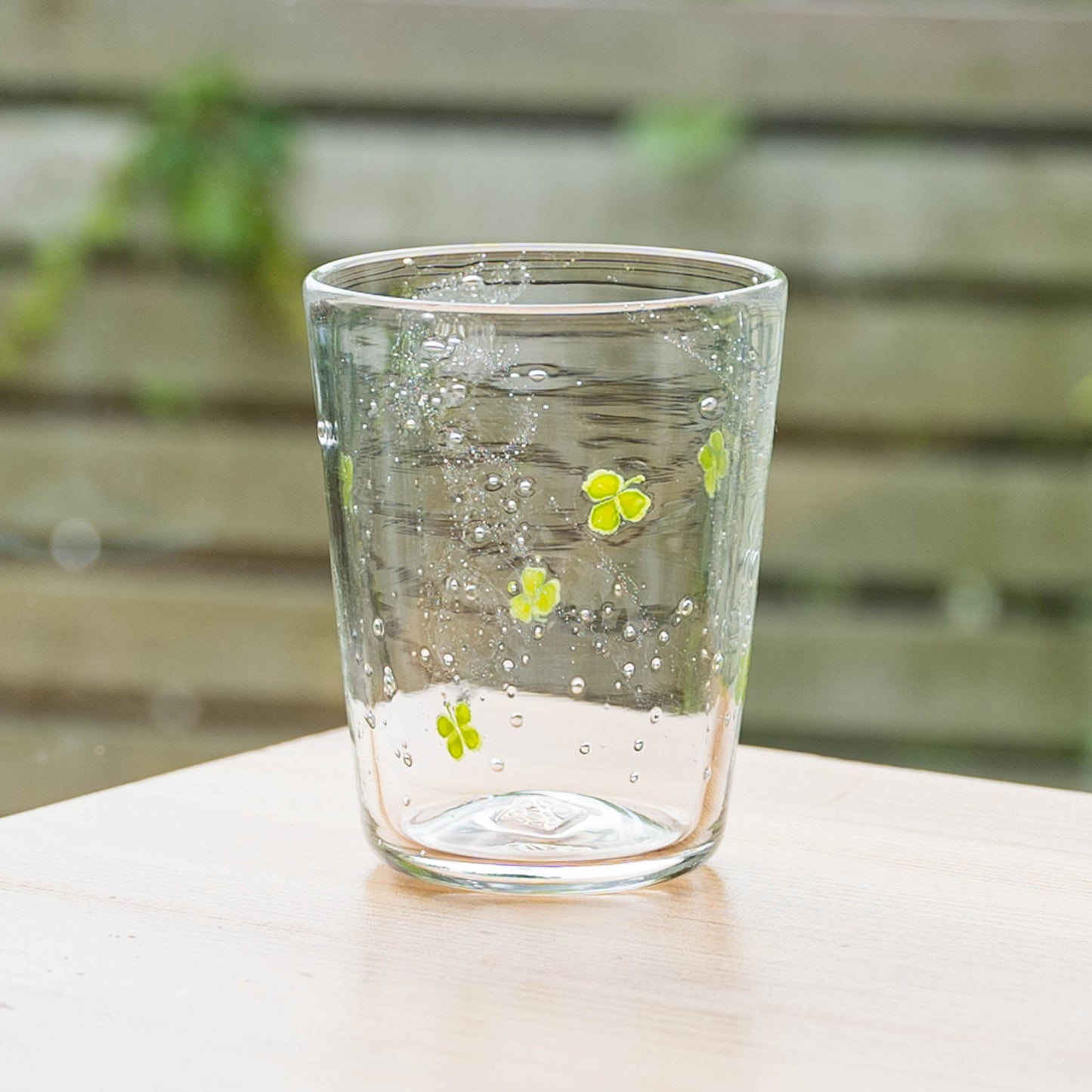 かわいらしいクローバー柄は絵付けではなく、別に小さな緑のガラスを用いてクローバーをつくり、ガラスの表面に埋め込んでいます。光が当たるとクローバーグリーンがキラキラと輝いて見惚れてしまいます。