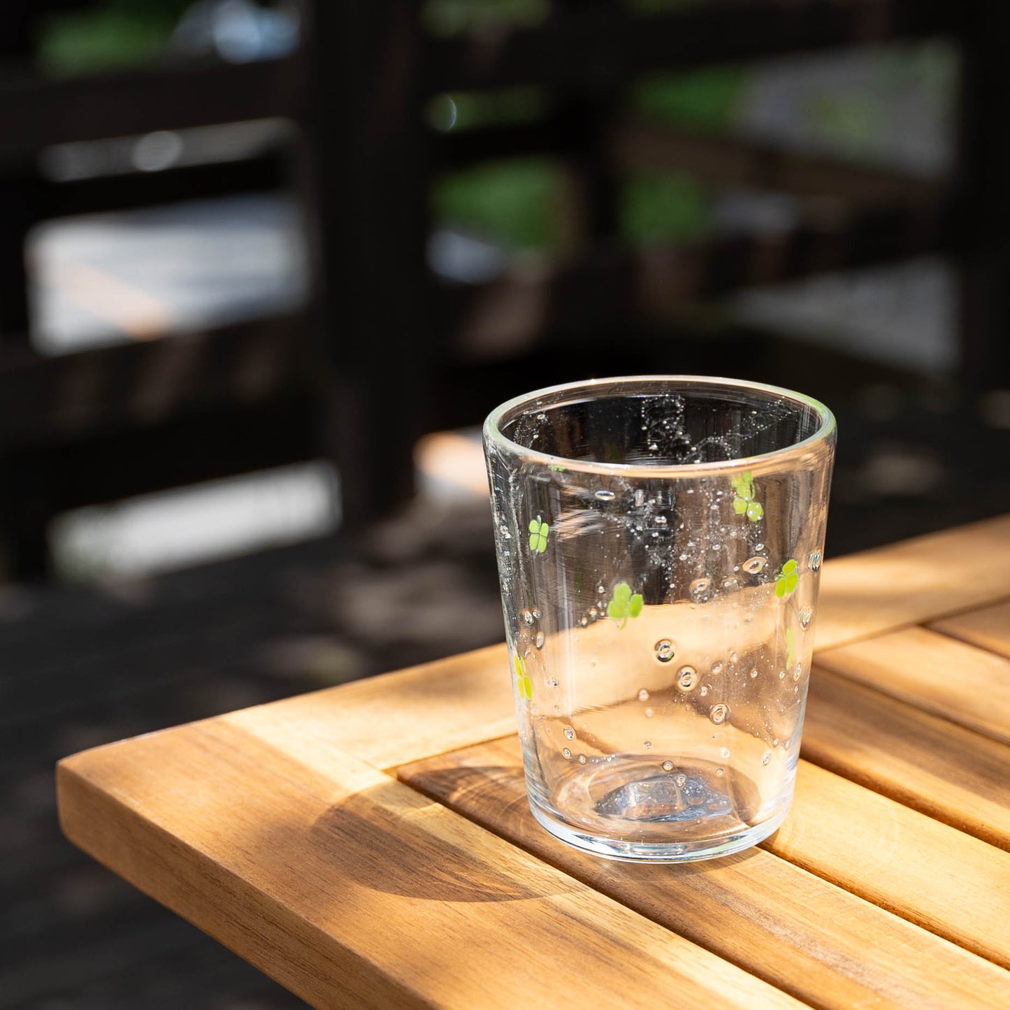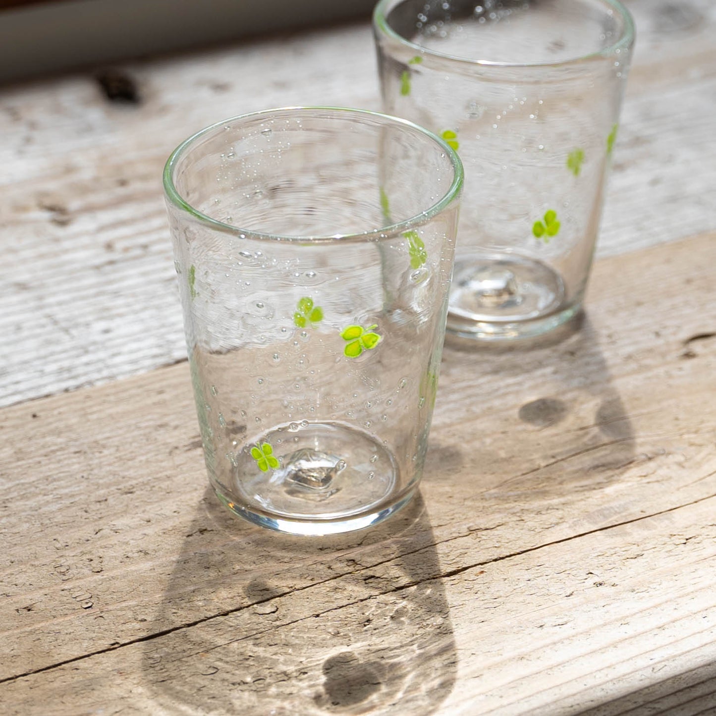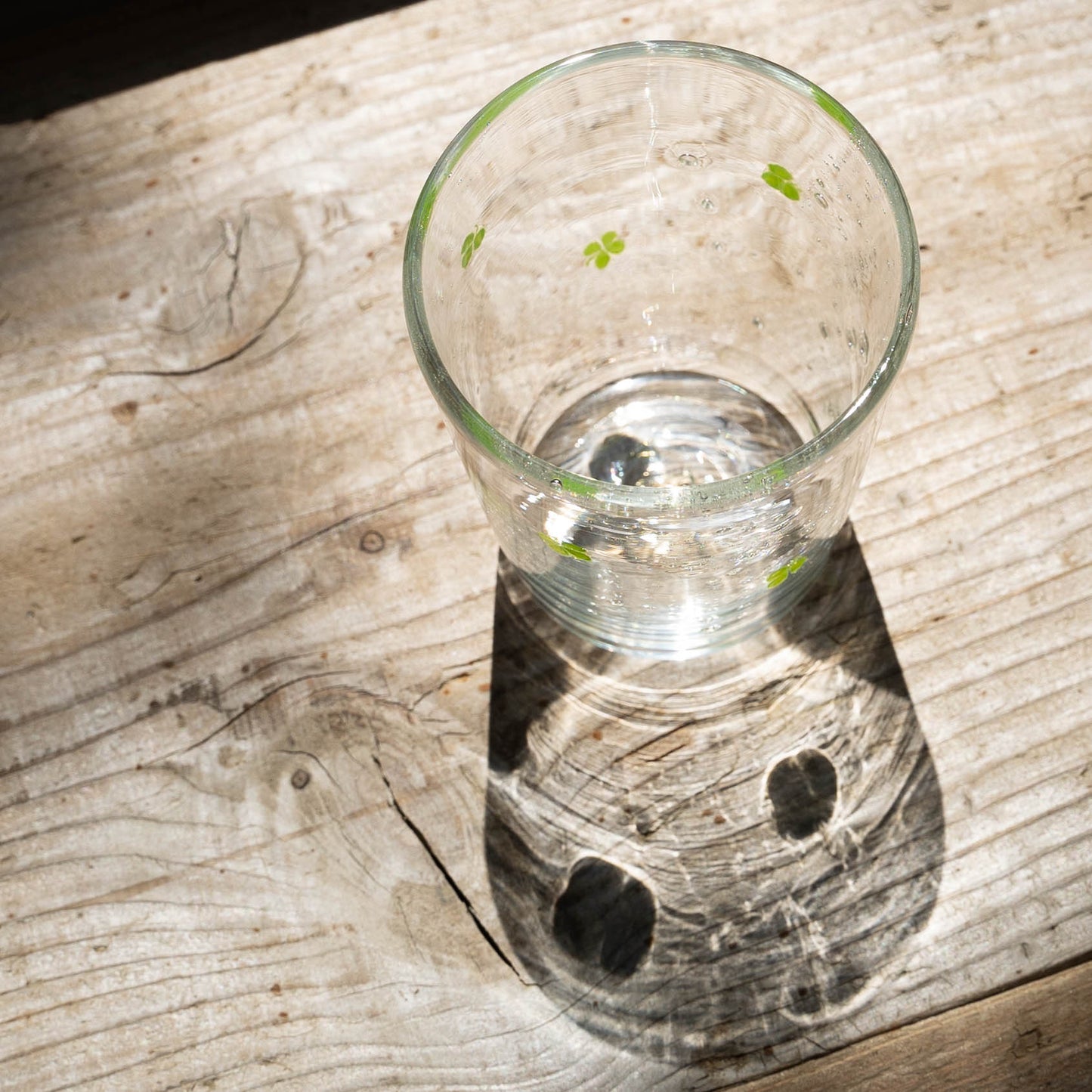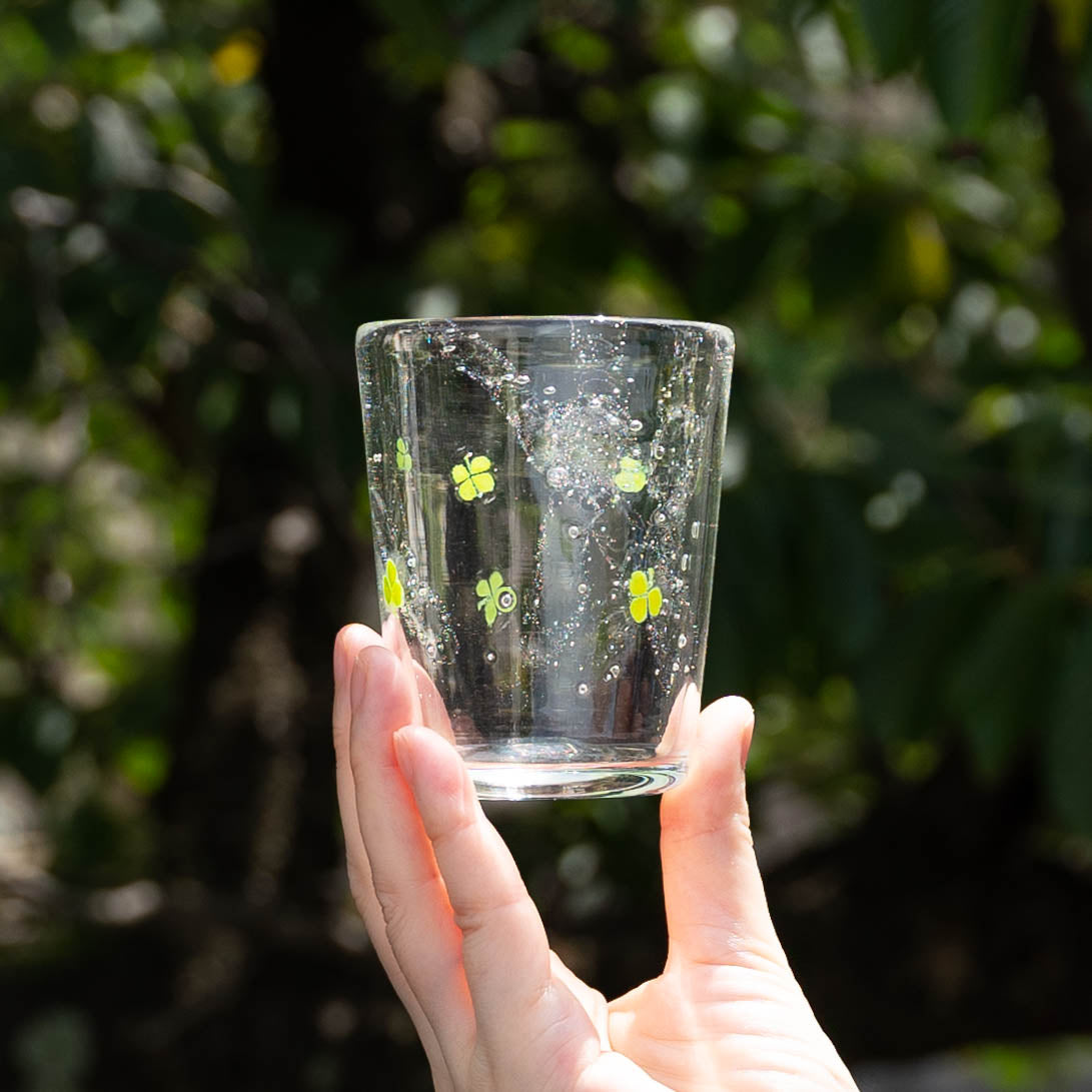 かわいらしいクローバー柄は絵付けではなく、別に小さな緑のガラスを用いてクローバーをつくり、ガラスの表面に埋め込んでいます。光が当たるとクローバーグリーンがキラキラと輝いて見惚れてしまいます。