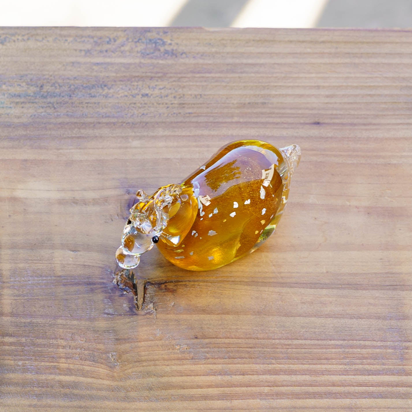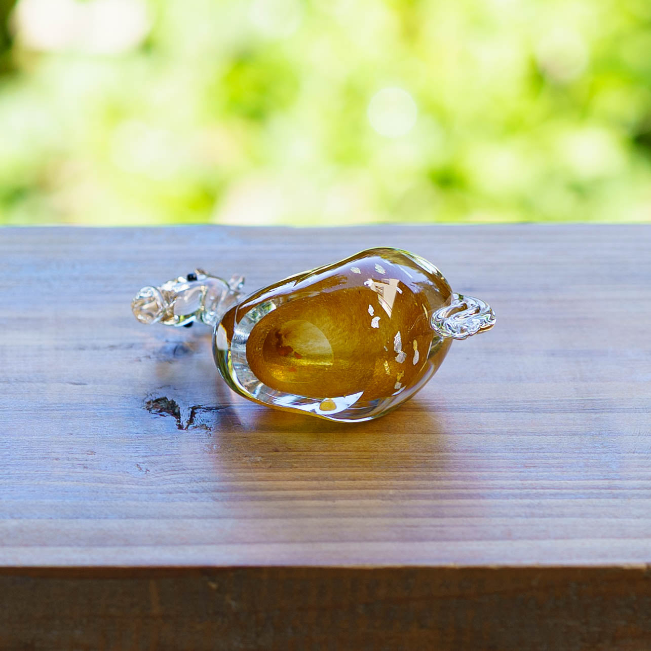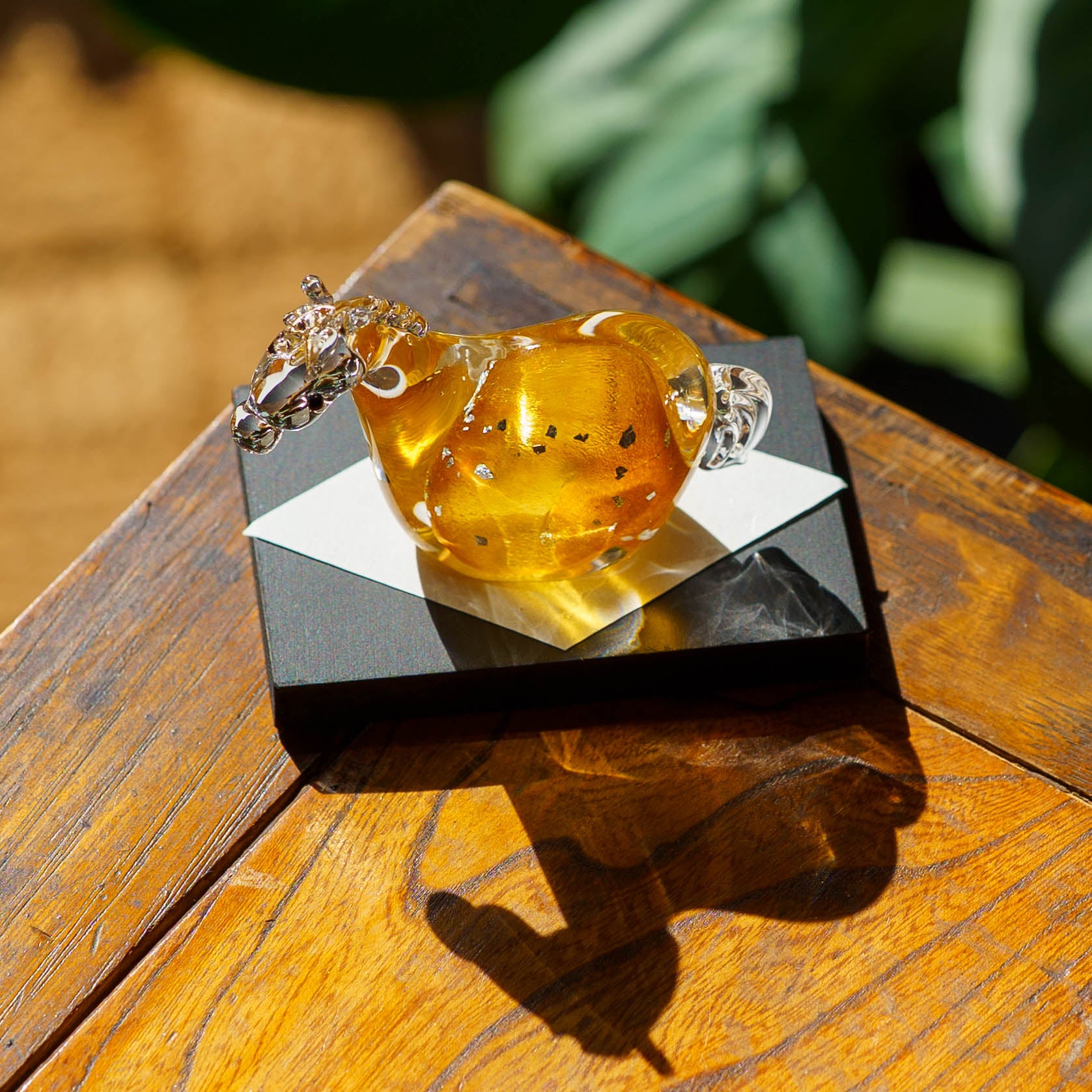 ガラスの中に透ける金彩と銀彩が、優雅な輝きを添えています。控えめながらも上品な存在感があり、玄関や棚の上など清潔で明るく自然と目に触れる場所に。黒い台座付きなので、届いたその日からすぐに飾って楽しめるのもうれしいポイントです。