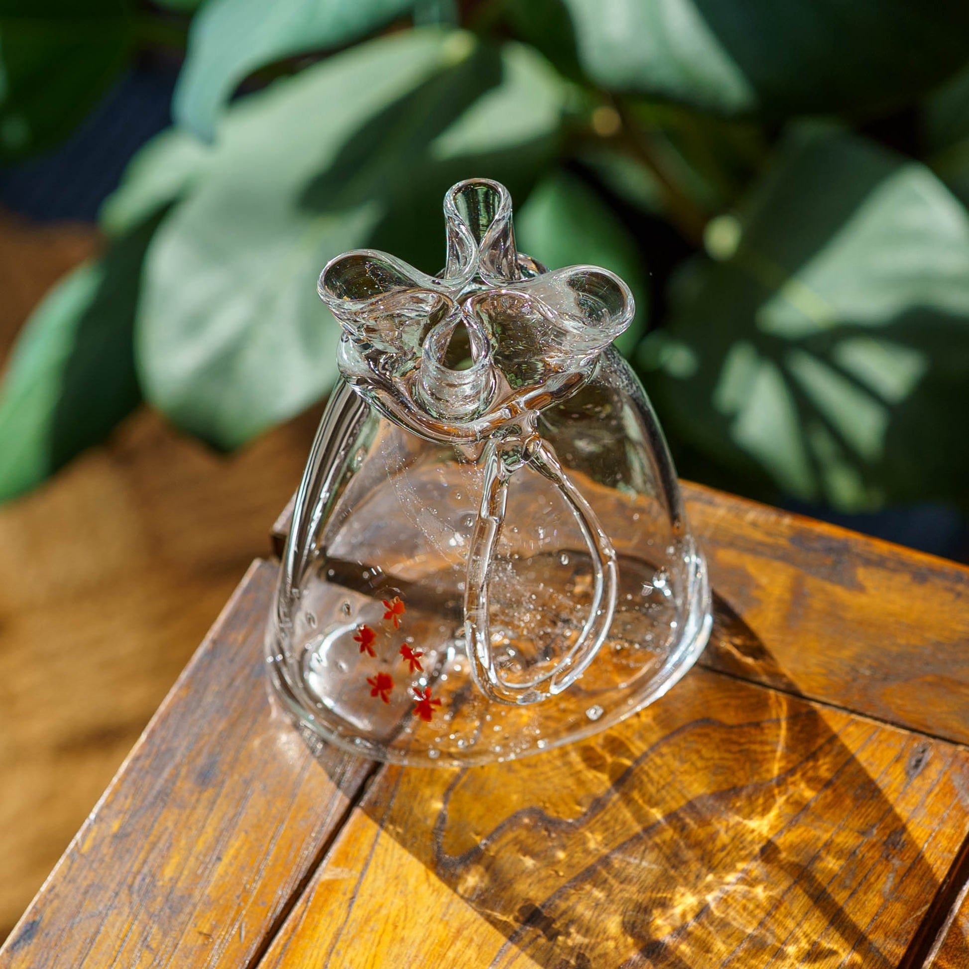 お花を生けると、金魚と花が同じ水の中に浮かんでいるような不思議な世界が生まれます。お水を入れた時のゆらめきや、ガラス越しの光の反射が美しく、見るたびに心が和みます。