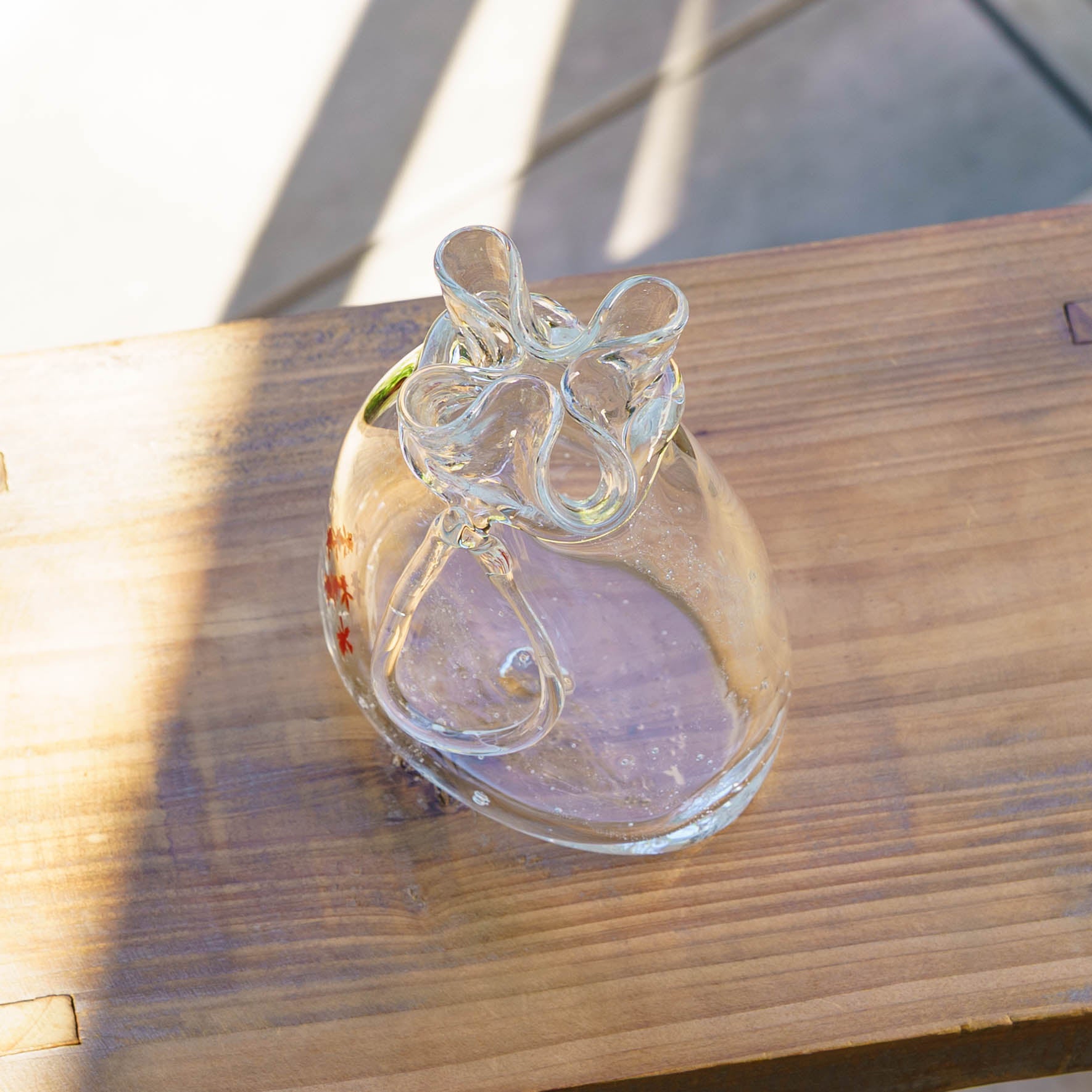 ひとつひとつ吹きガラスで制作された、愛らしい一輪挿し。ころんとしたフォルムの巾着がどこかユニークで、置いてあるだけで癒される可愛らしさです。透明感のあるガラスに光が差し込むと、やわらかく輝き空間に明るさを添えてくれます。