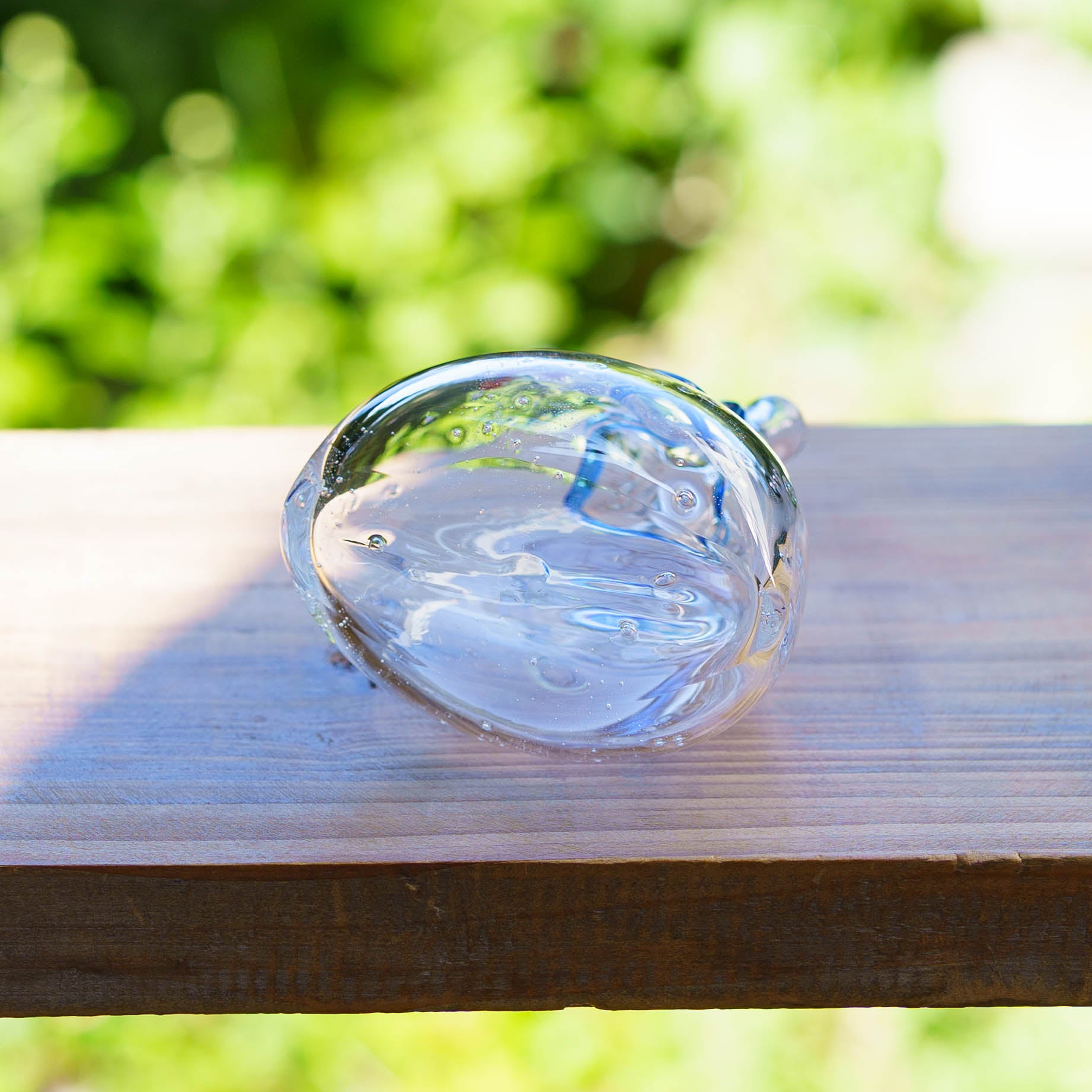 ひとつひとつ吹きガラスで制作された、愛らしい一輪挿し。ころんとしたフォルムの巾着がどこかユニークで、置いてあるだけで癒される可愛らしさです。透明感のあるガラスに光が差し込むと、やわらかく輝き空間に明るさを添えてくれます。