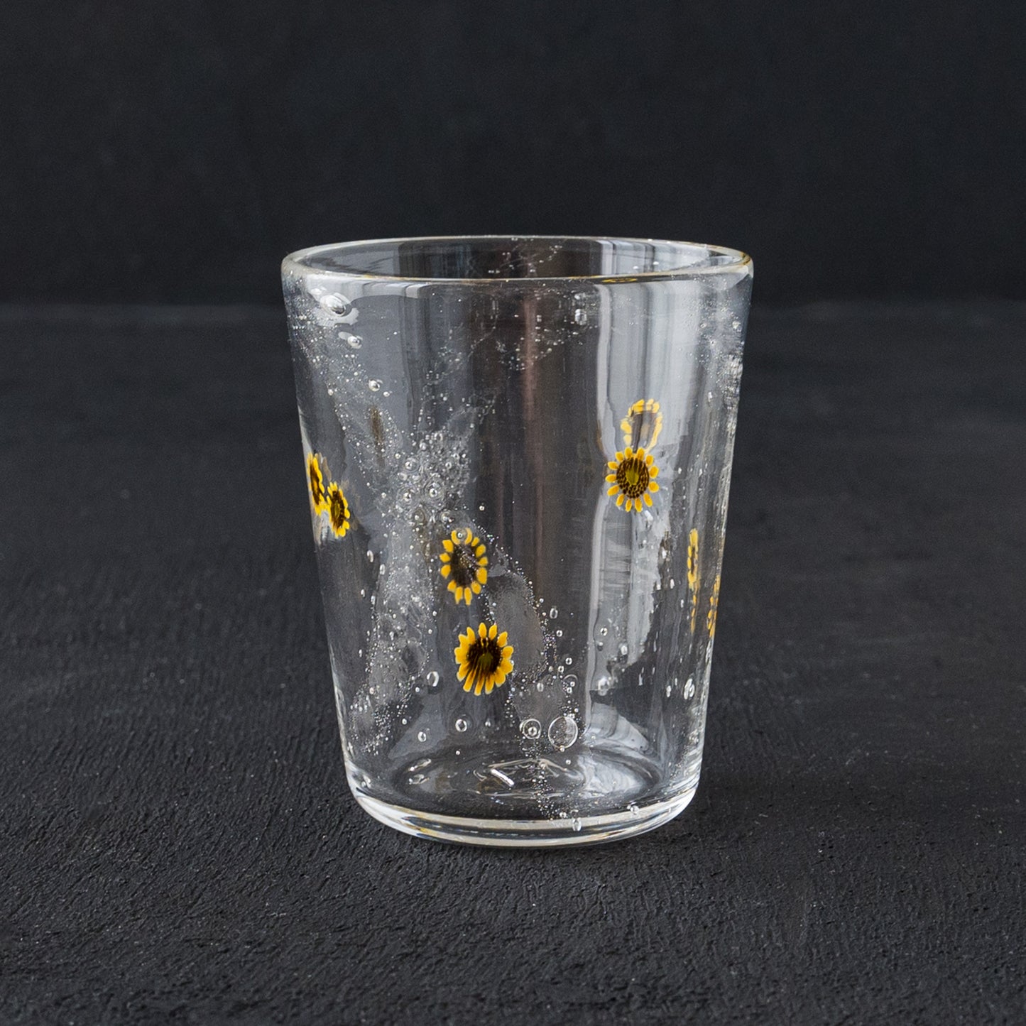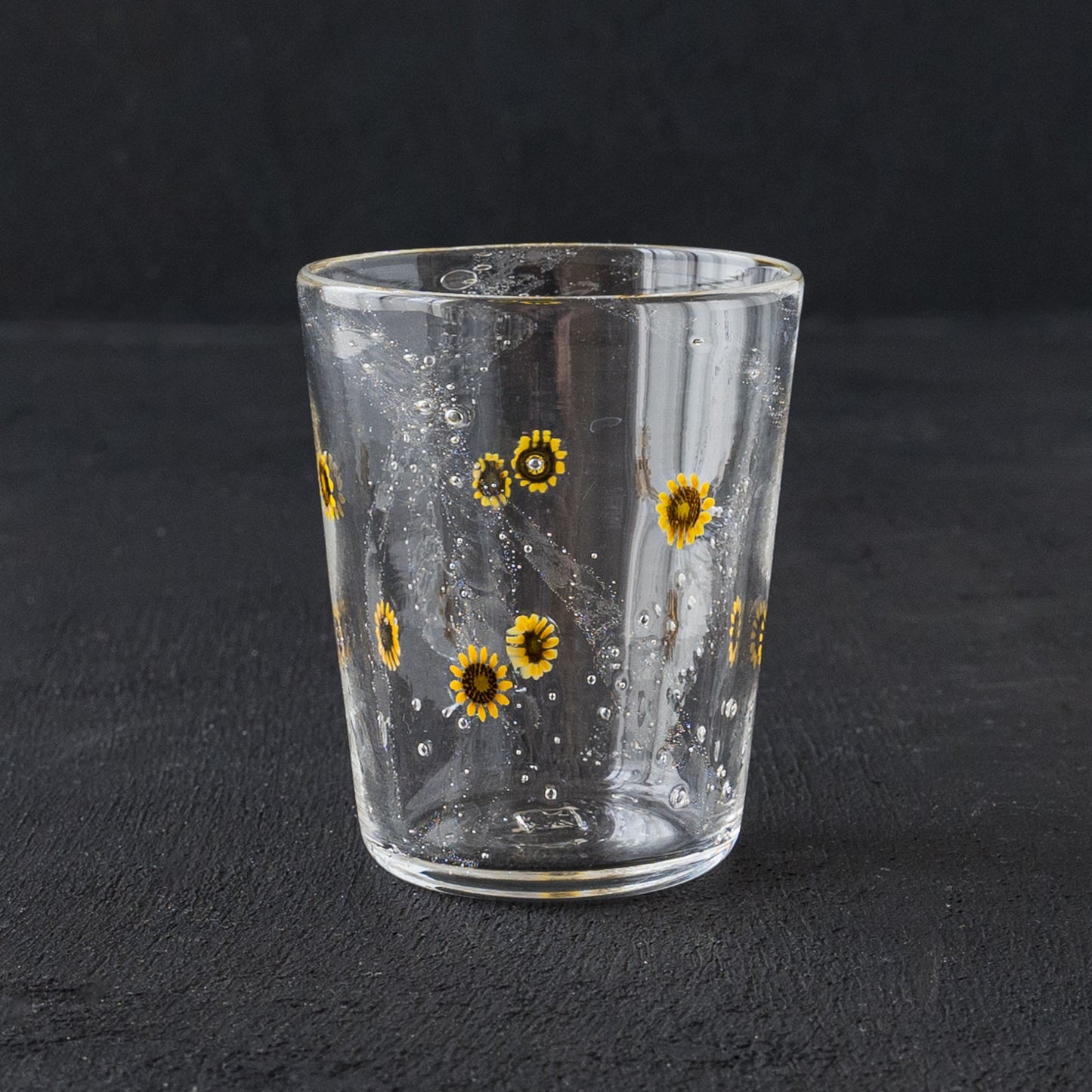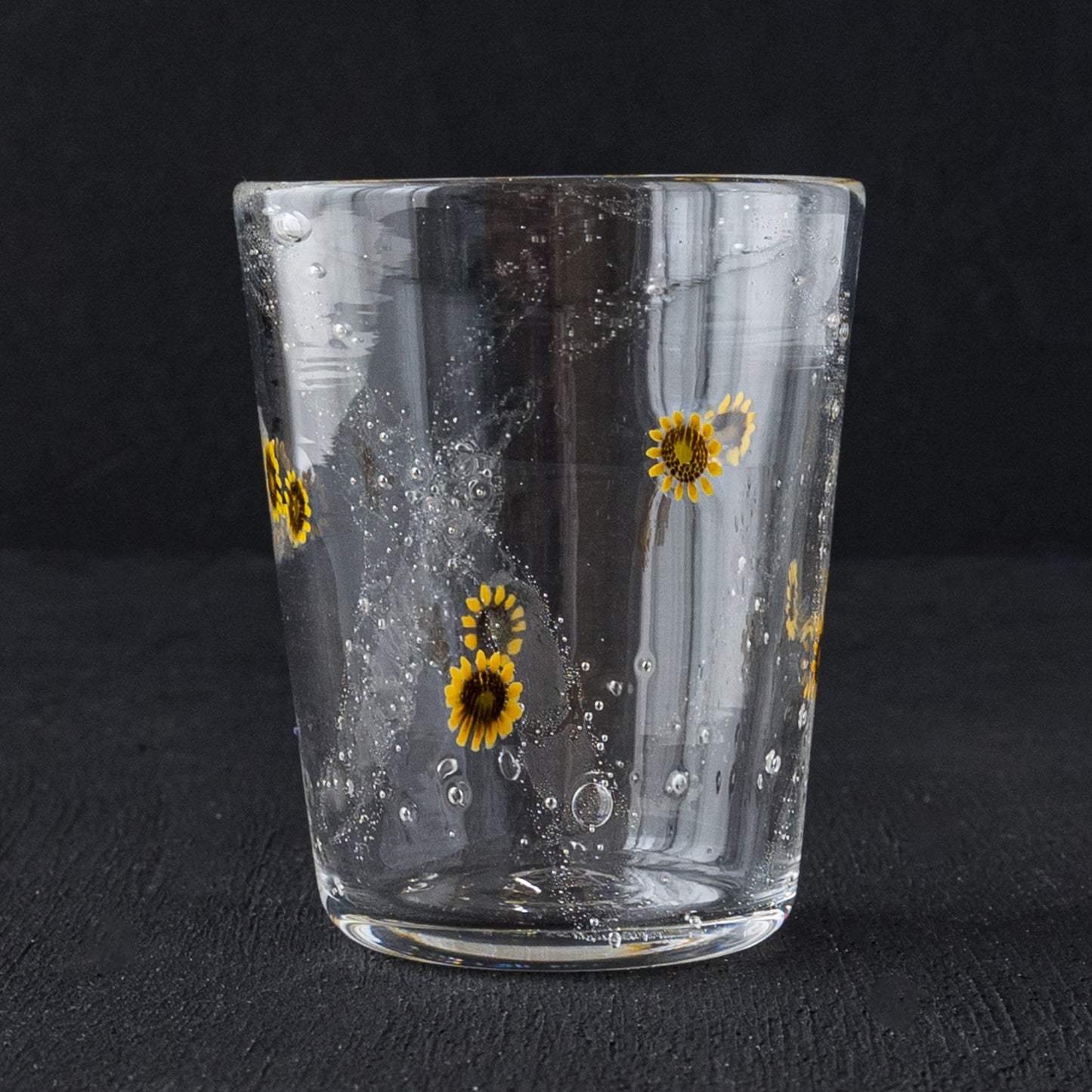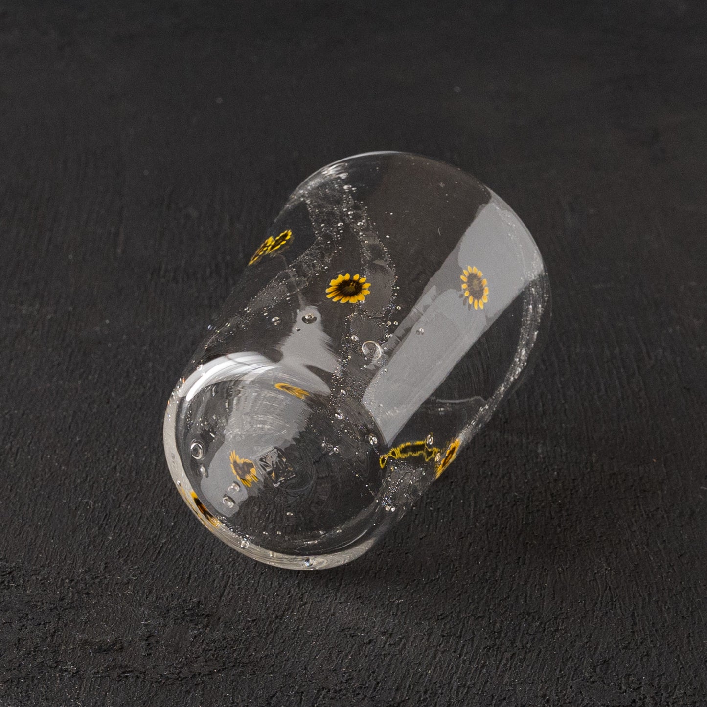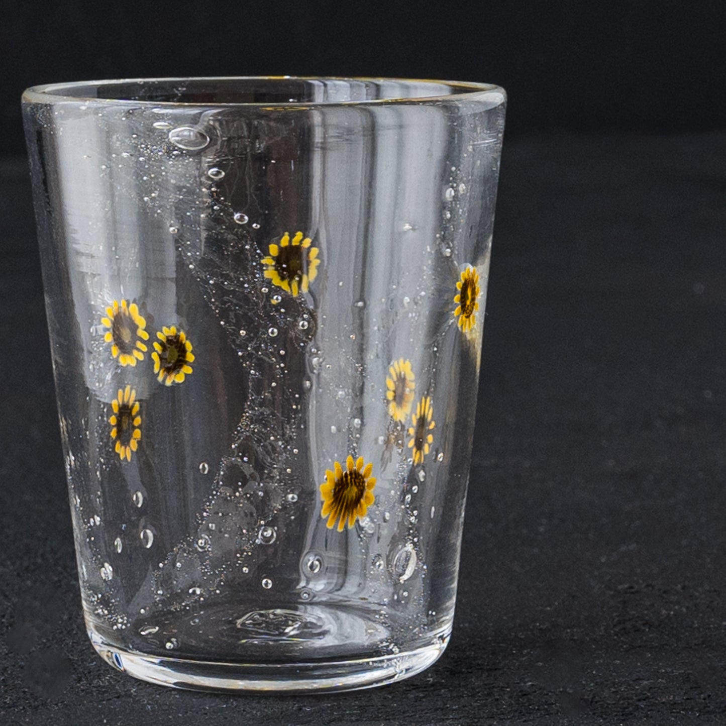 どこか懐かしさを感じるレトロな雰囲気のある愛らしい絵柄です。絵付けではなく黄色のガラスで小さなひまわりを別途パーツとして作り、製作途中でガラス表面に丁寧に埋め込んでいるので剥がれたりする心配がありません。