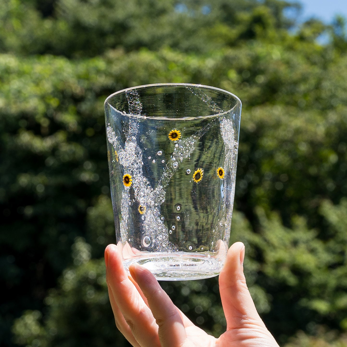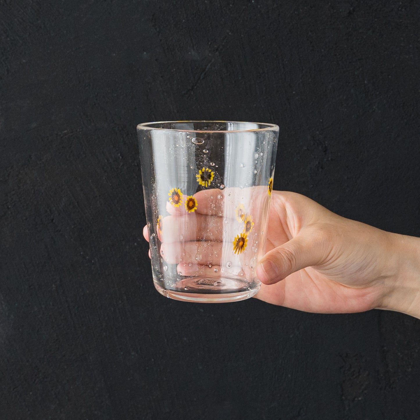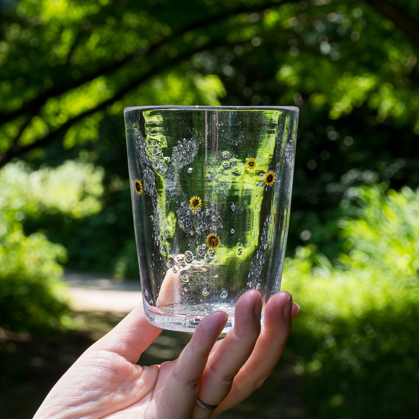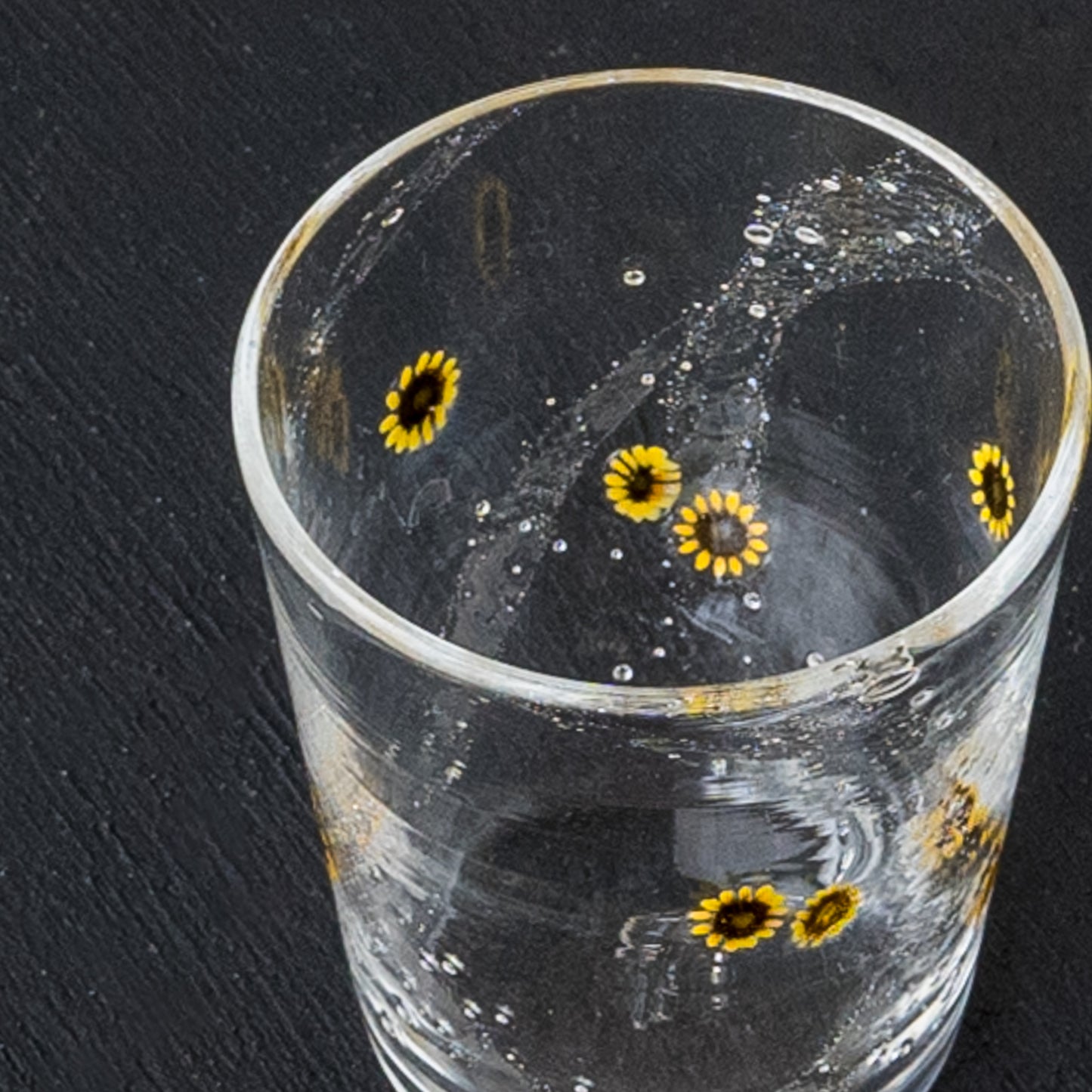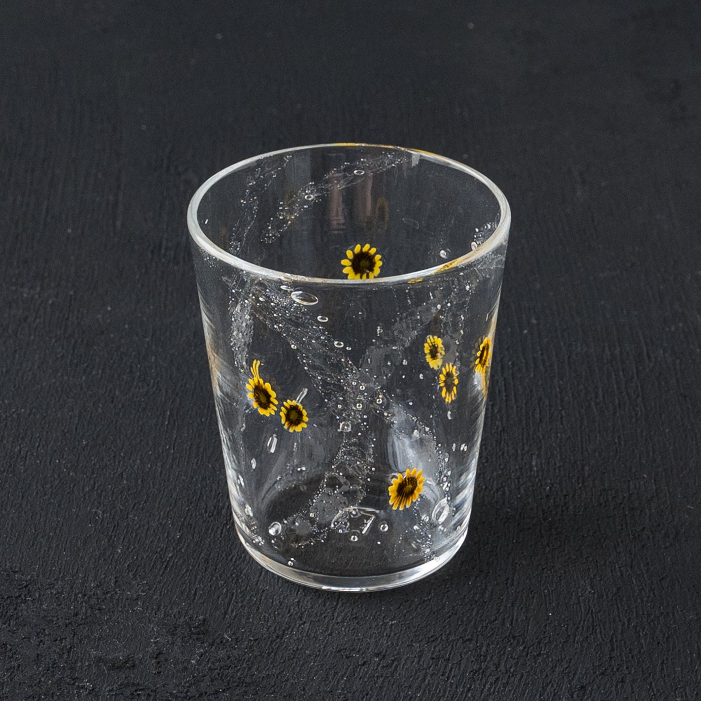 どこか懐かしさを感じるレトロな雰囲気のある愛らしい絵柄です。絵付けではなく黄色のガラスで小さなひまわりを別途パーツとして作り、製作途中でガラス表面に丁寧に埋め込んでいるので剥がれたりする心配がありません。