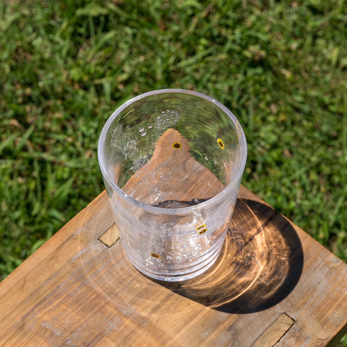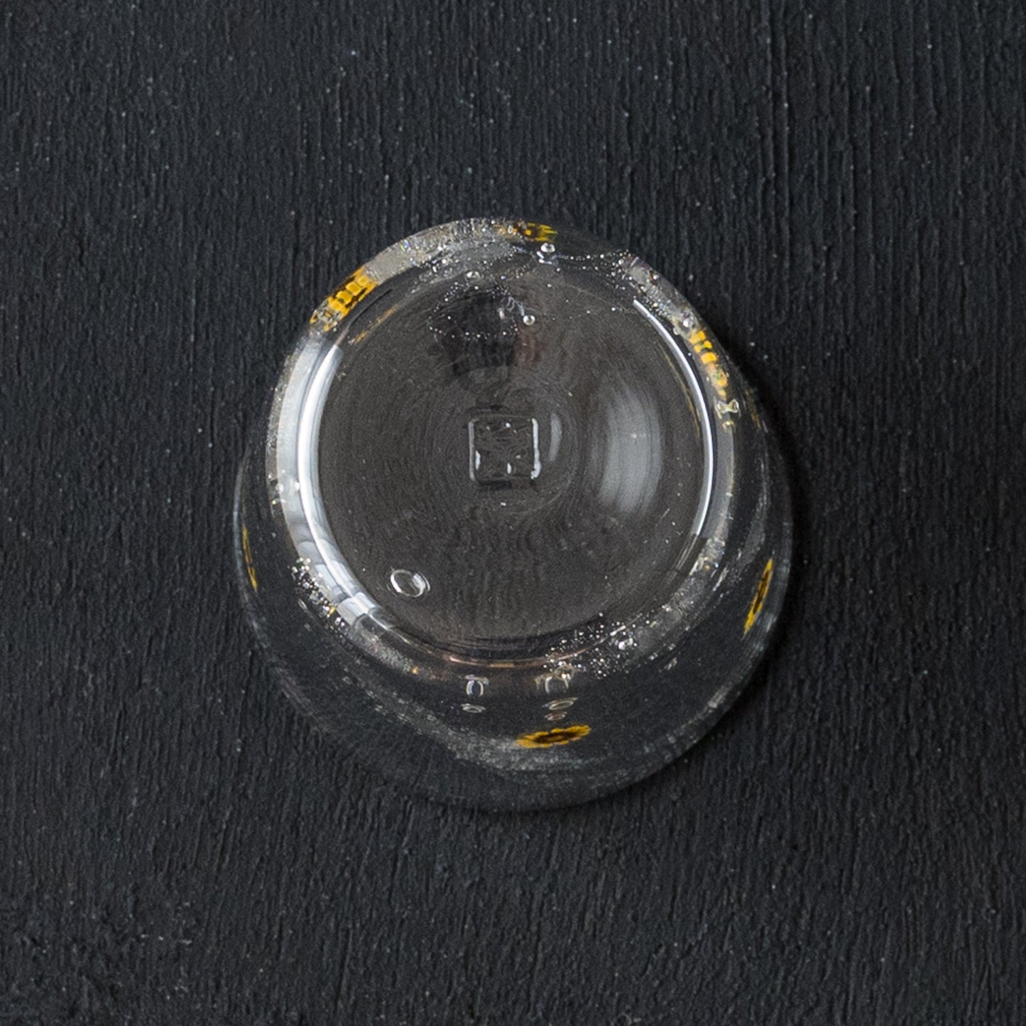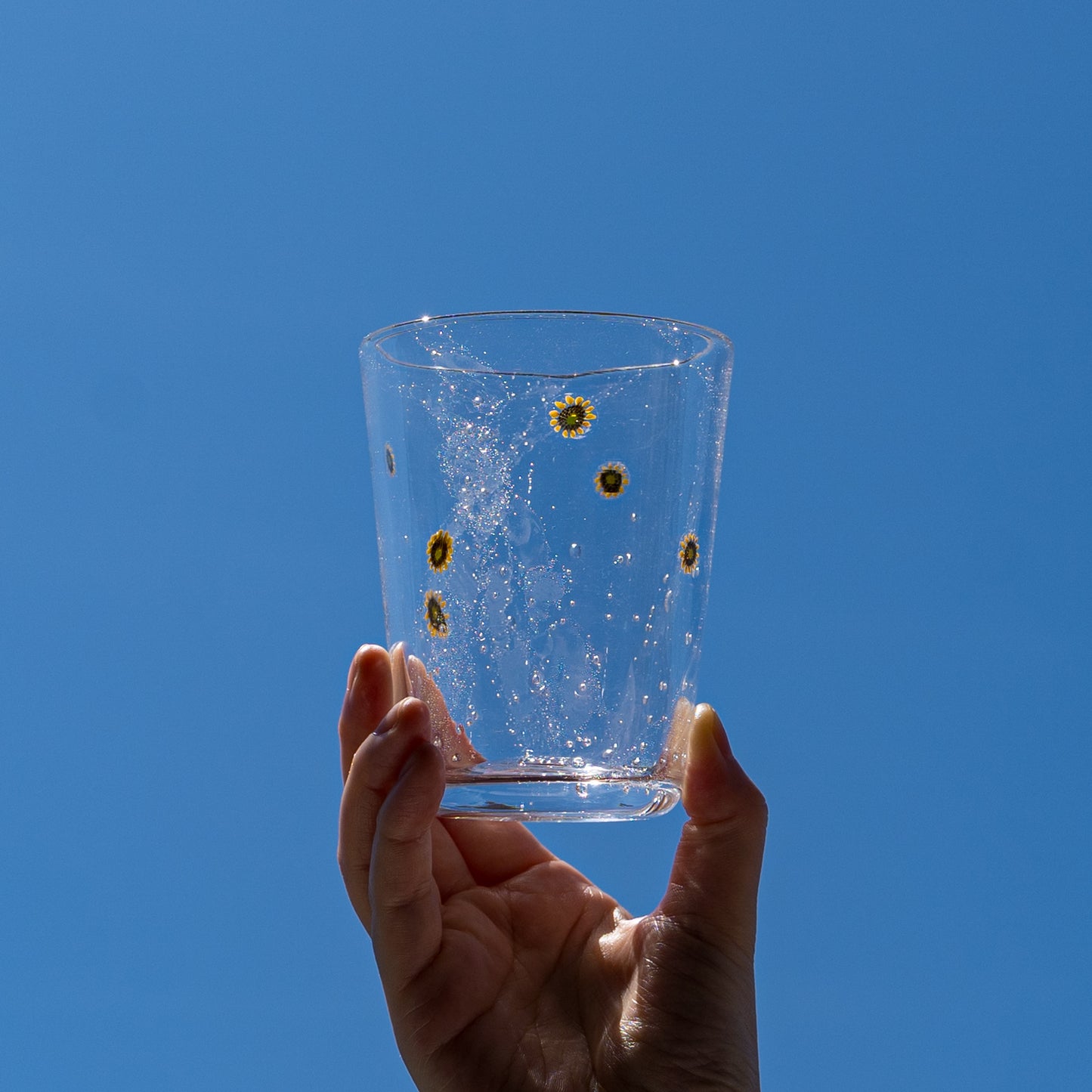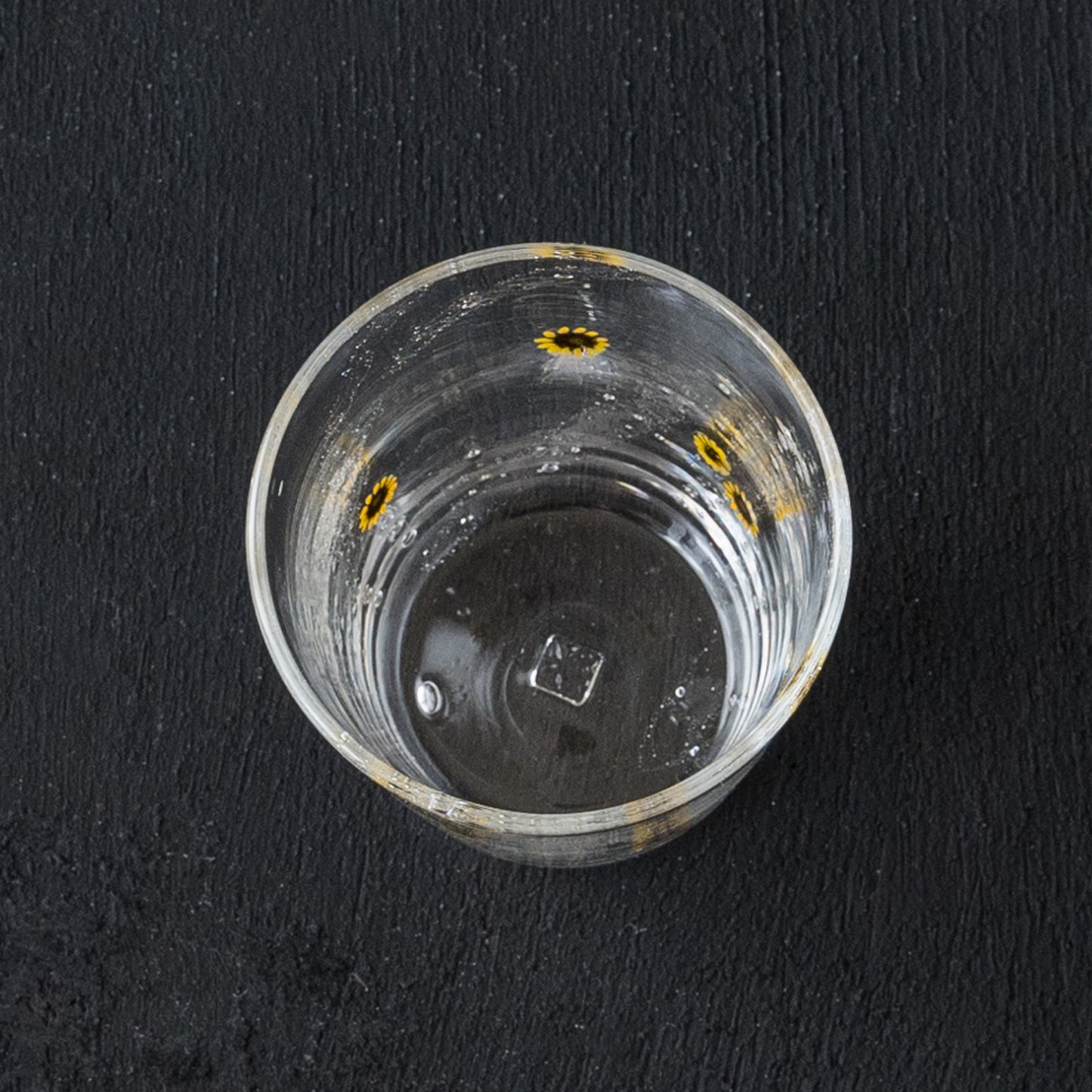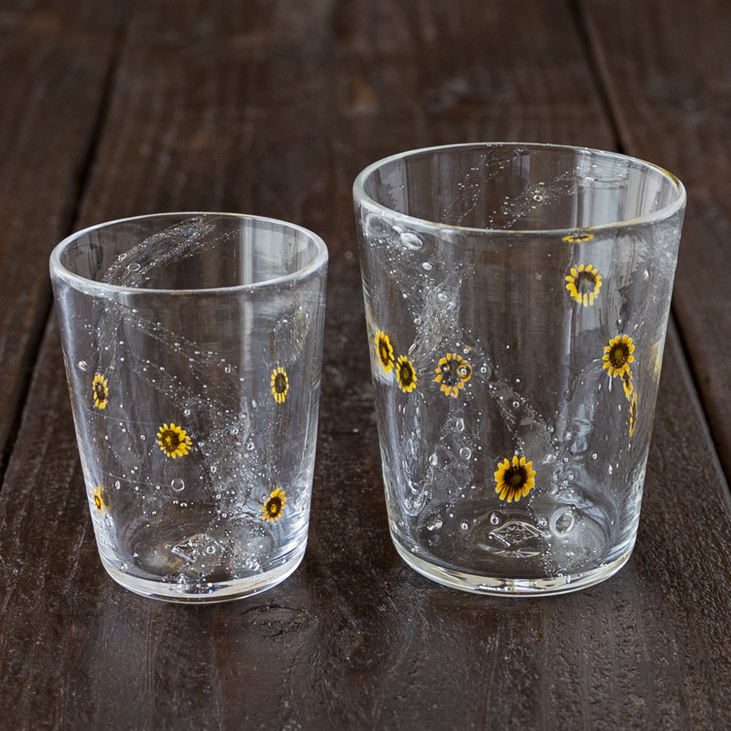 どこか懐かしさを感じるレトロな雰囲気のある愛らしい絵柄です。絵付けではなく黄色のガラスで小さなひまわりを別途パーツとして作り、製作途中でガラス表面に丁寧に埋め込んでいるので剥がれたりする心配がありません。