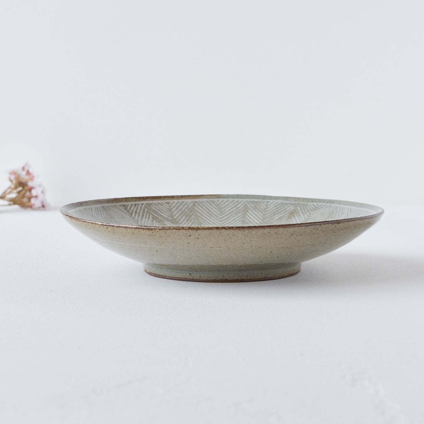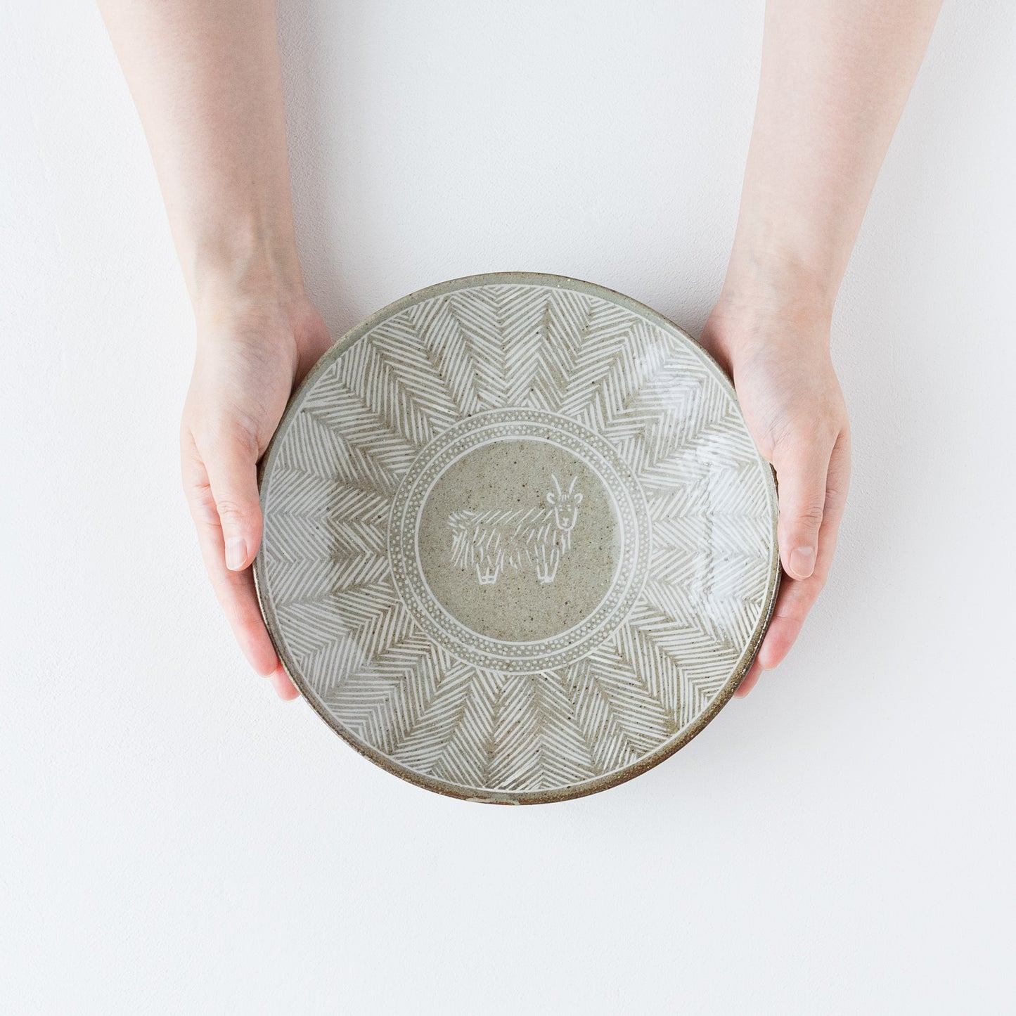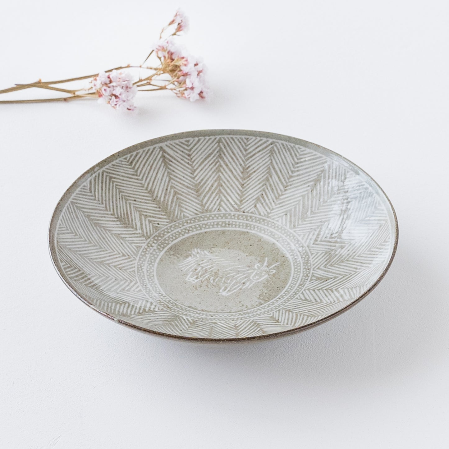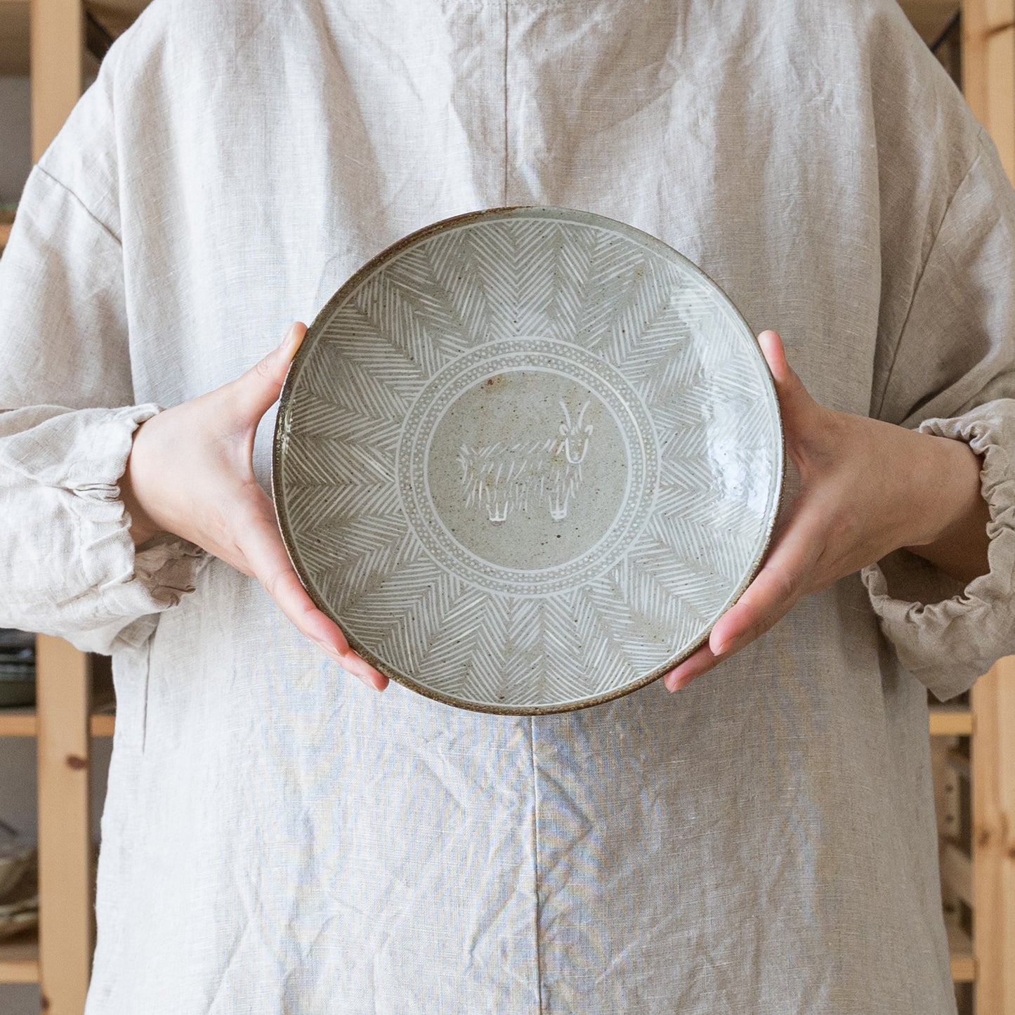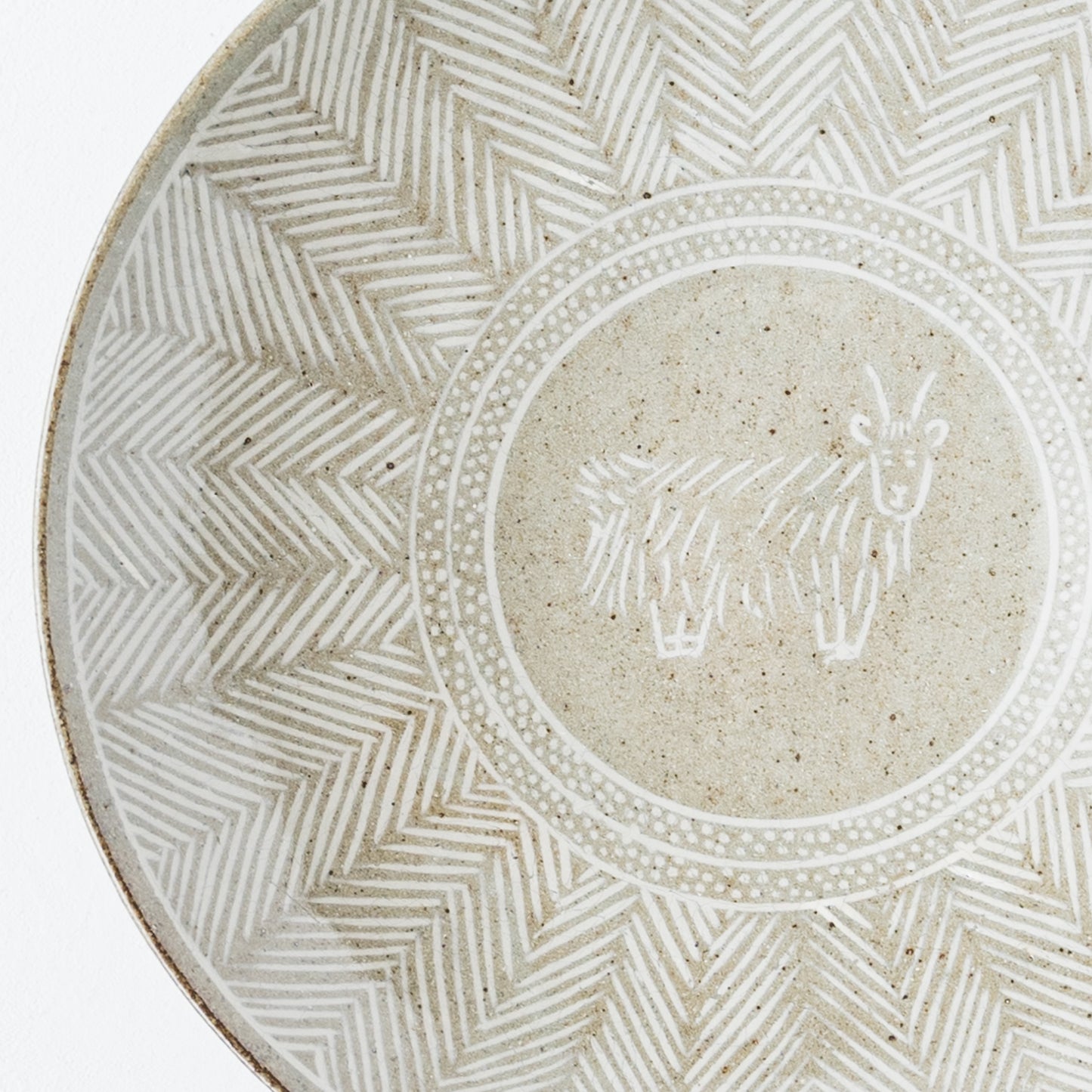 器の表面を彫った部分に胎土(粘土質の素地土)と異なる色土を嵌め込んで装飾する象嵌(ぞうがん)という技法を用いています。土そのものの素朴でやさしい風合いが感じられます。透明釉を施してあるので、つるっとやさしい質感です。