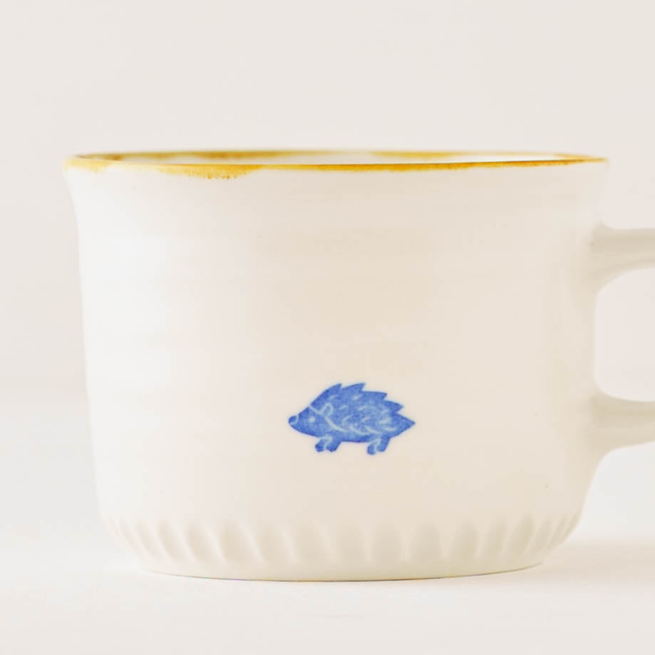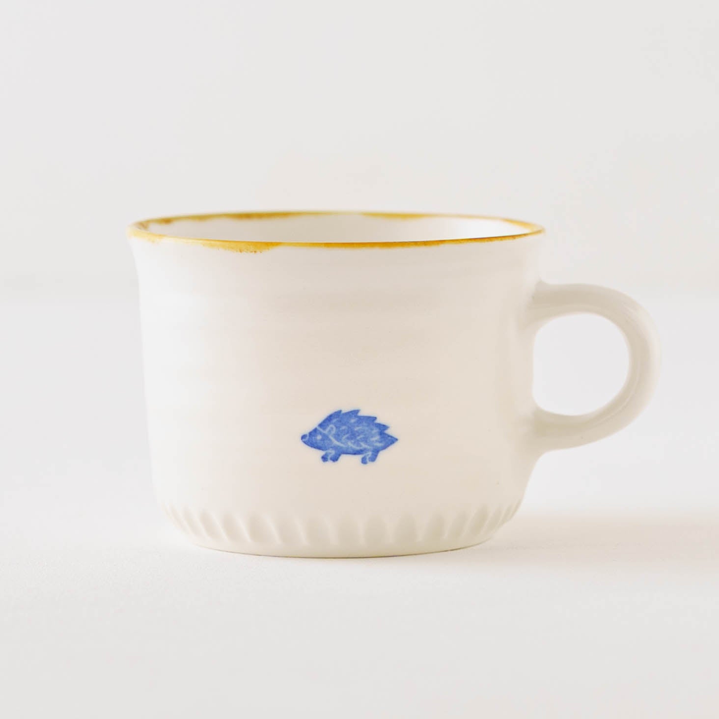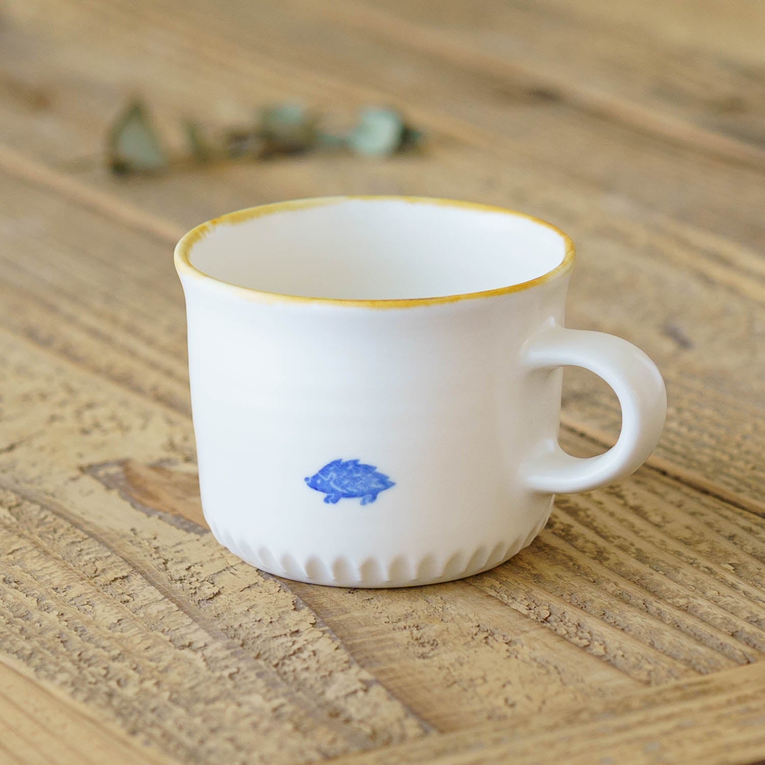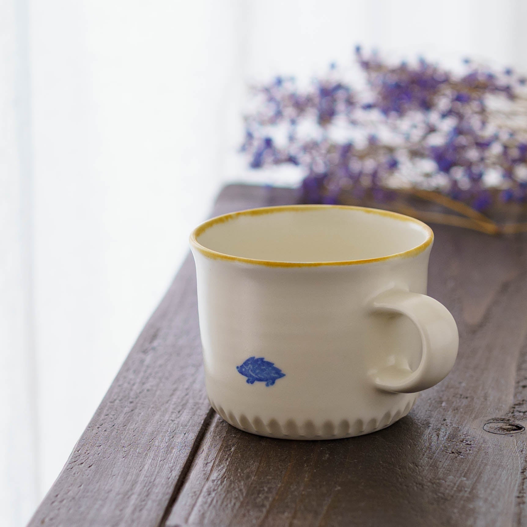 口縁部の縁錆とマグの下部に施されたしのぎがやわらかなミルク色の白を程よく引き締め、また愛らしいはりねずみときのこの絵柄も引き立てていて素敵な佇まいです。