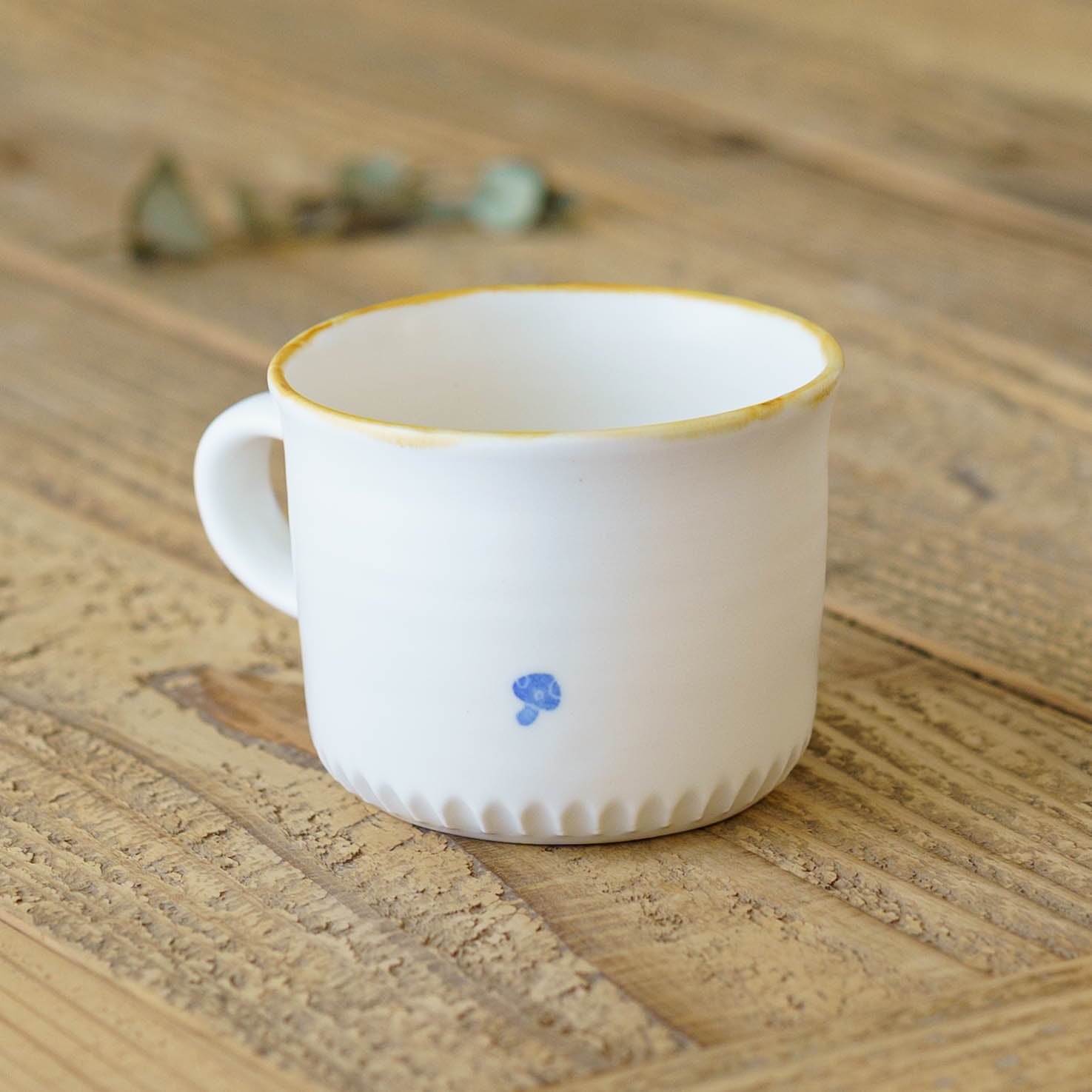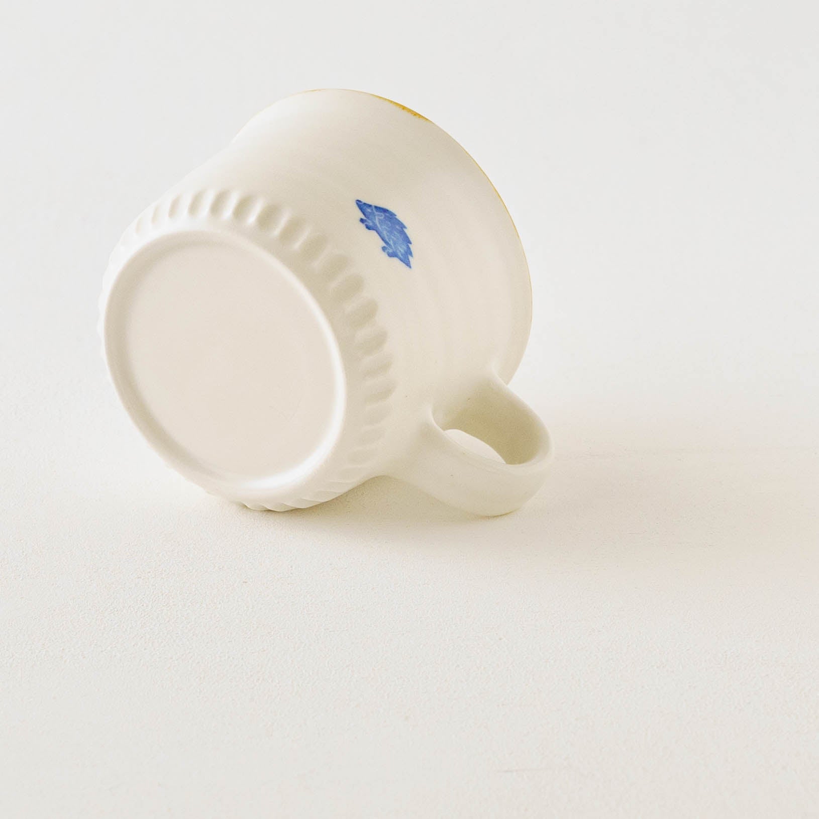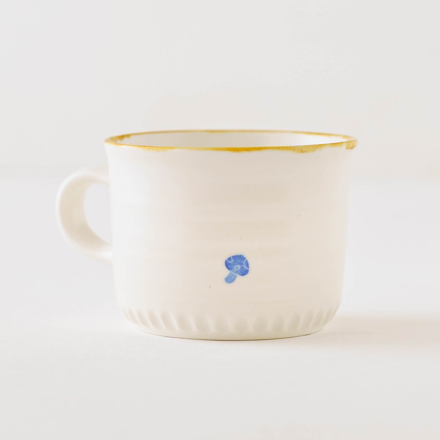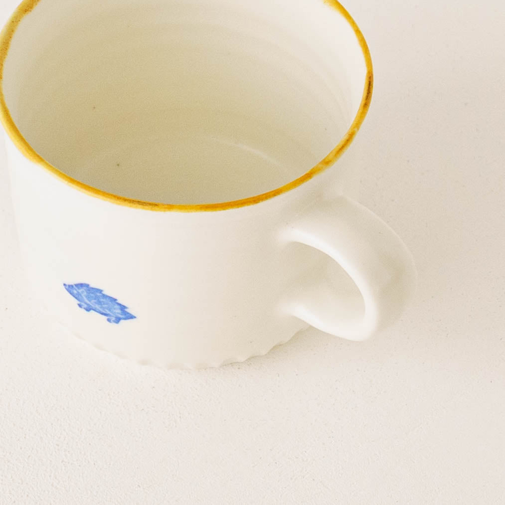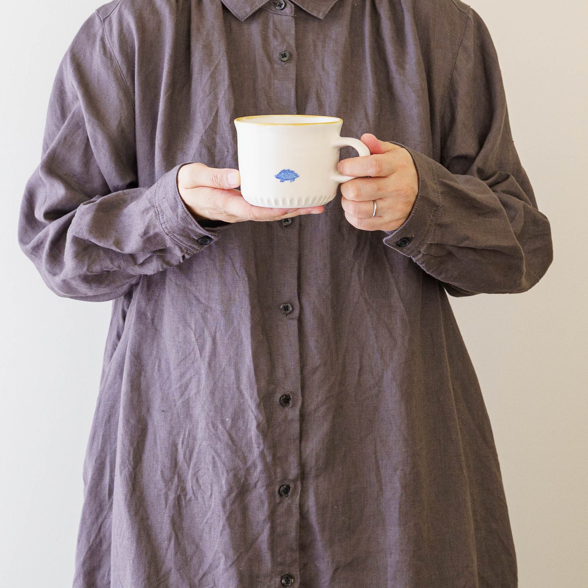 口縁部の縁錆とマグの下部に施されたしのぎがやわらかなミルク色の白を程よく引き締め、また愛らしいはりねずみときのこの絵柄も引き立てていて素敵な佇まいです。