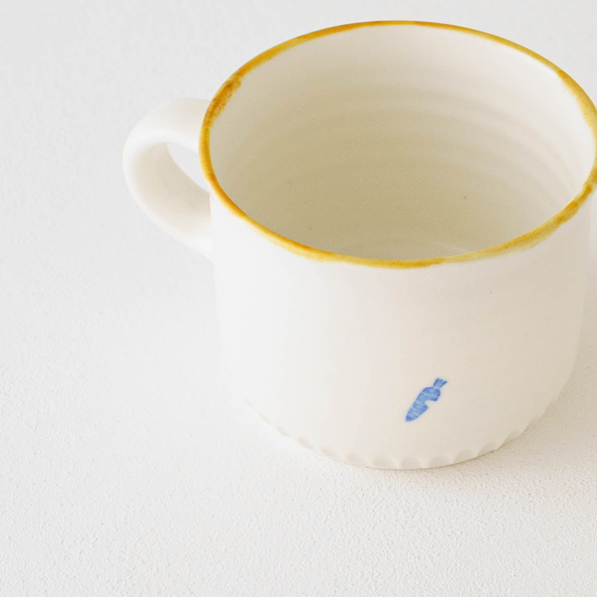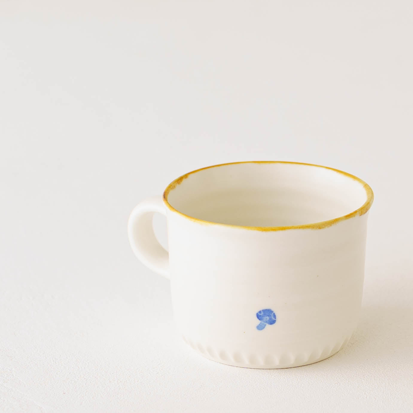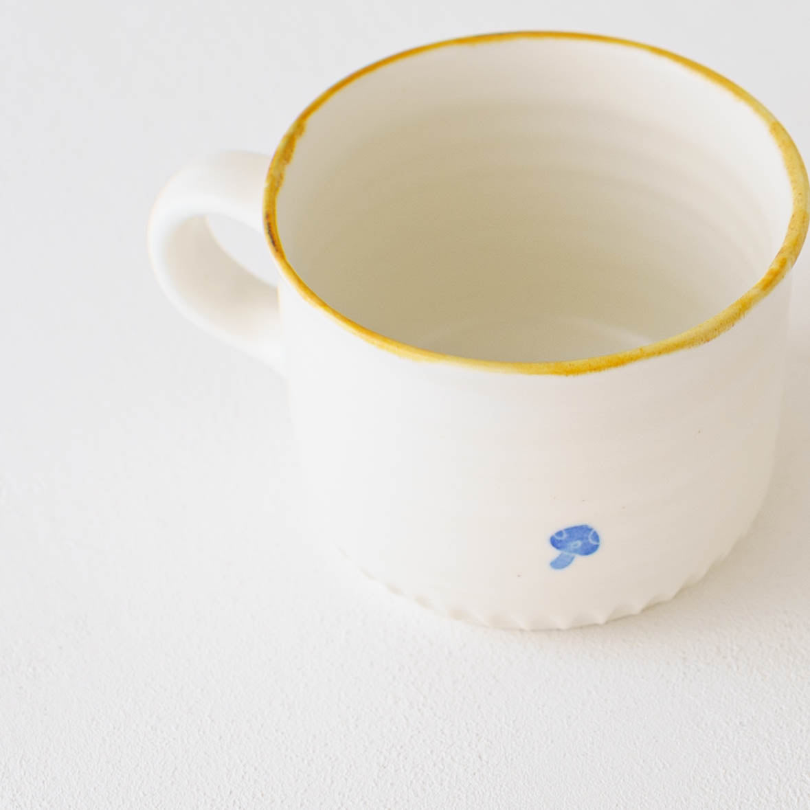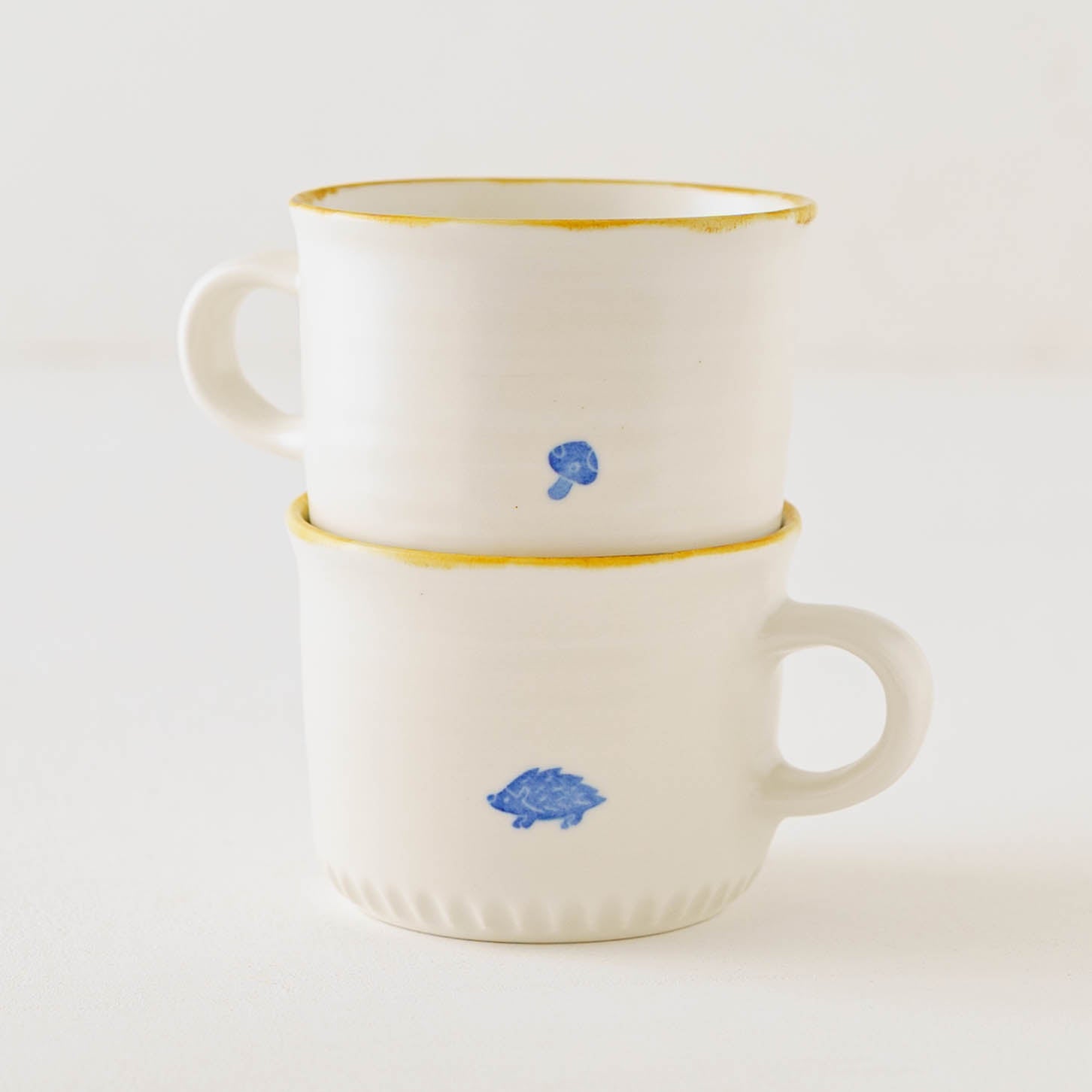 口縁部の縁錆とマグの下部に施されたしのぎがやわらかなミルク色の白を程よく引き締め、また愛らしいはりねずみときのこの絵柄も引き立てていて素敵な佇まいです。