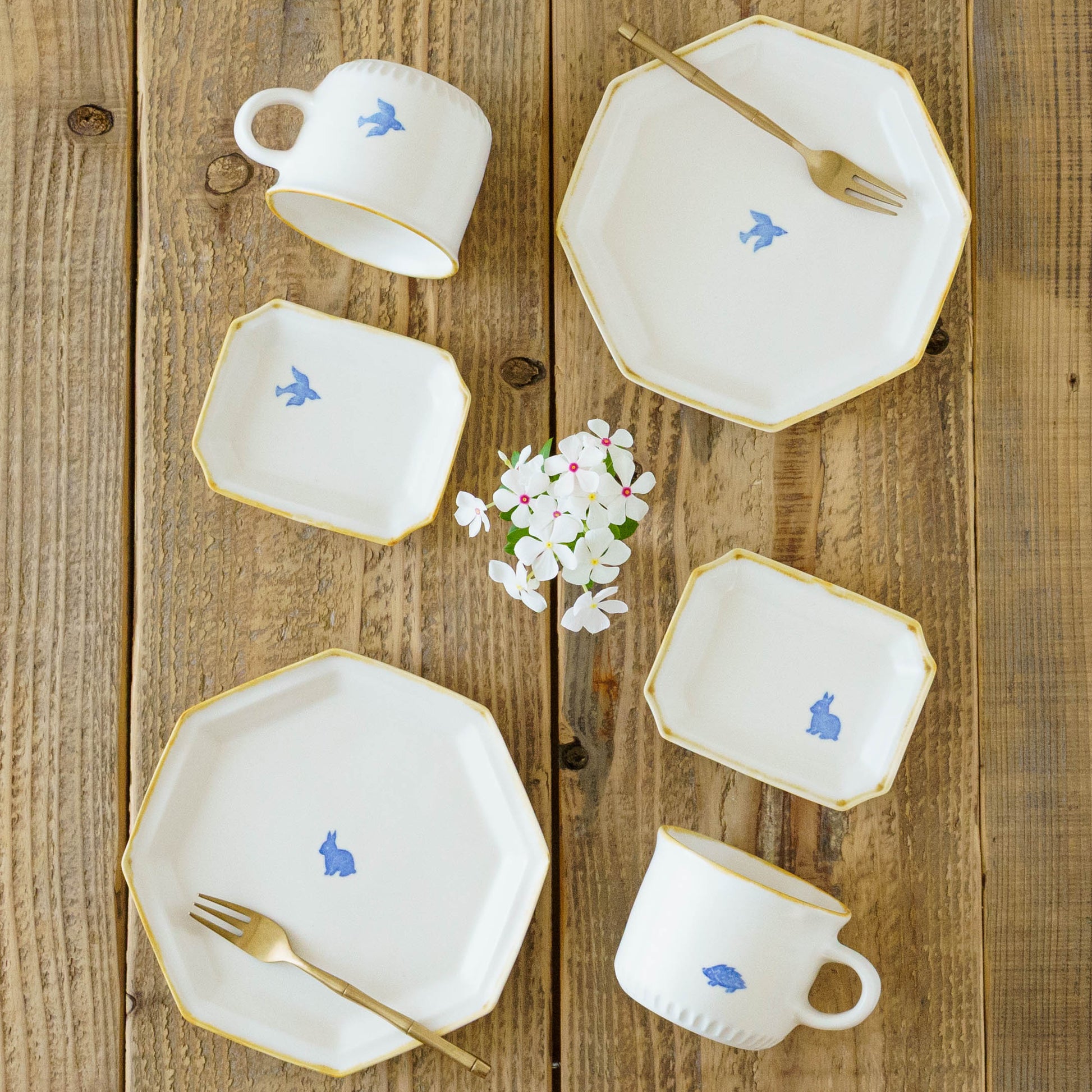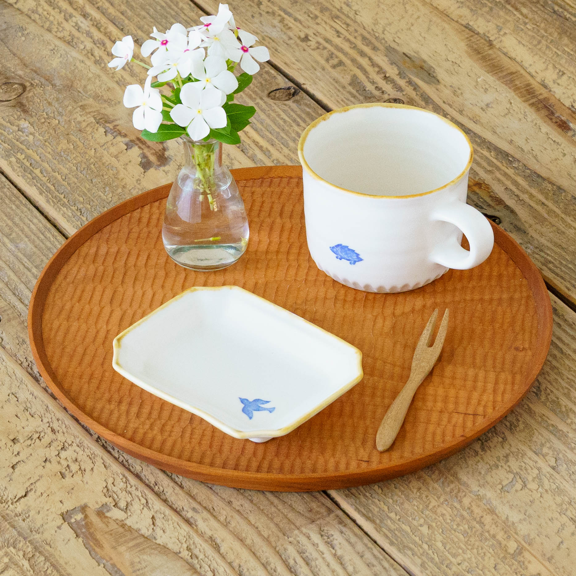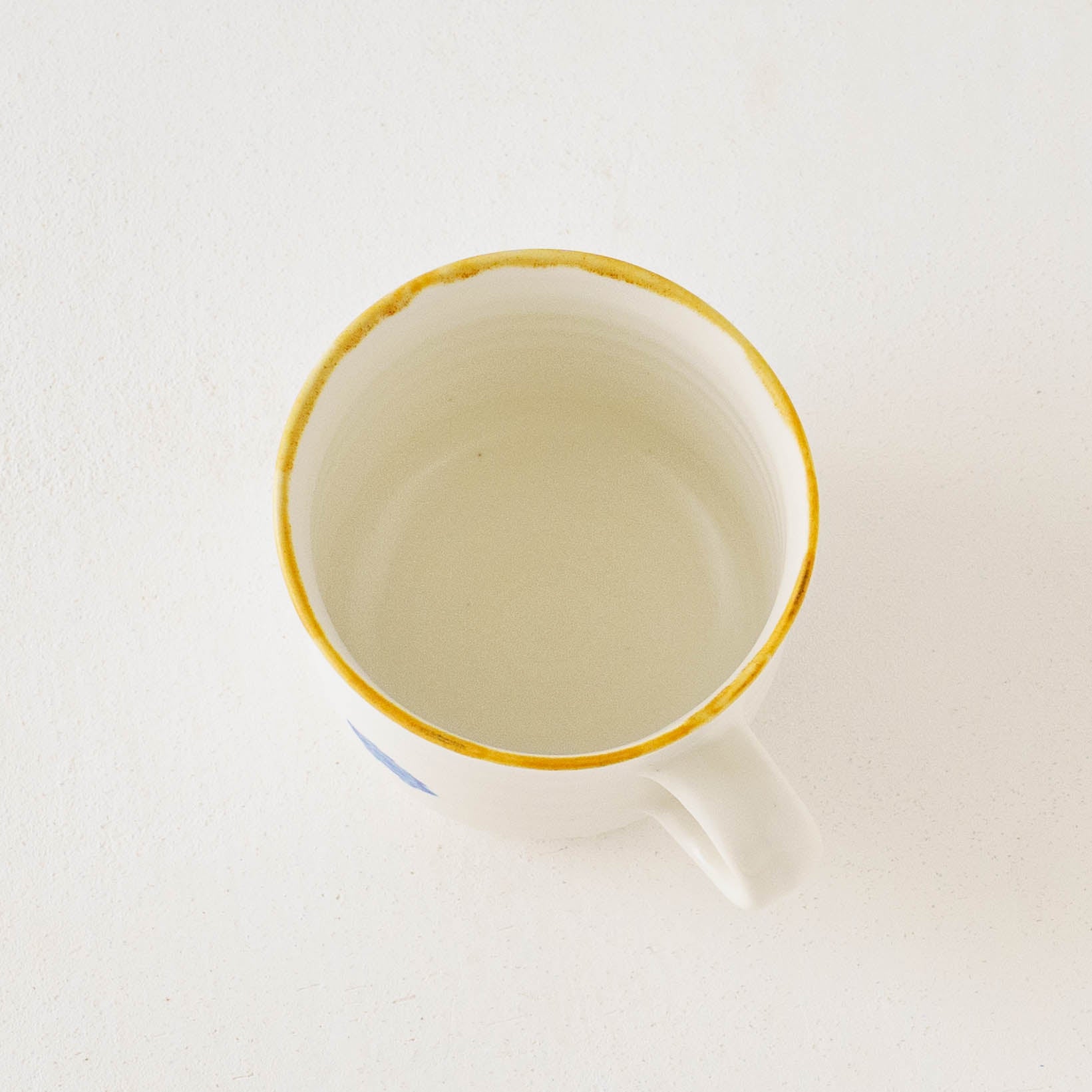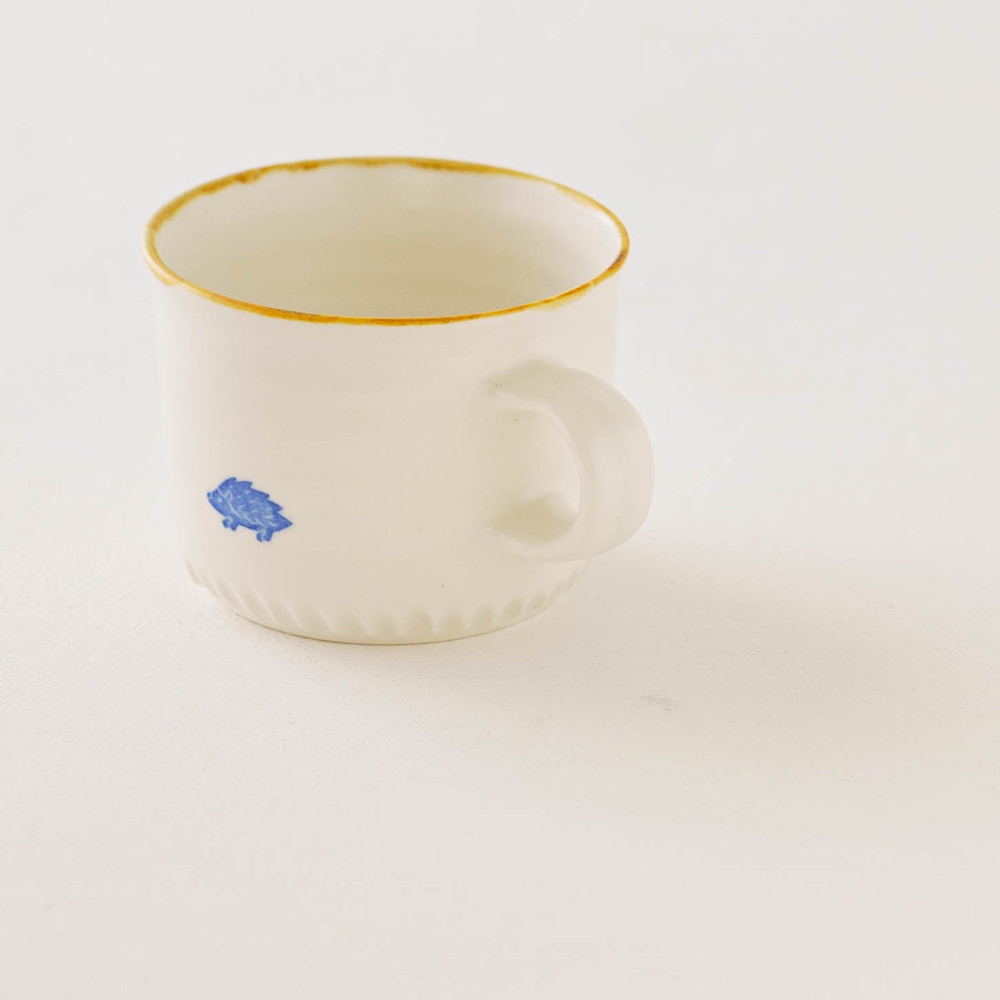 口縁部の縁錆とマグの下部に施されたしのぎがやわらかなミルク色の白を程よく引き締め、また愛らしいはりねずみときのこの絵柄も引き立てていて素敵な佇まいです。